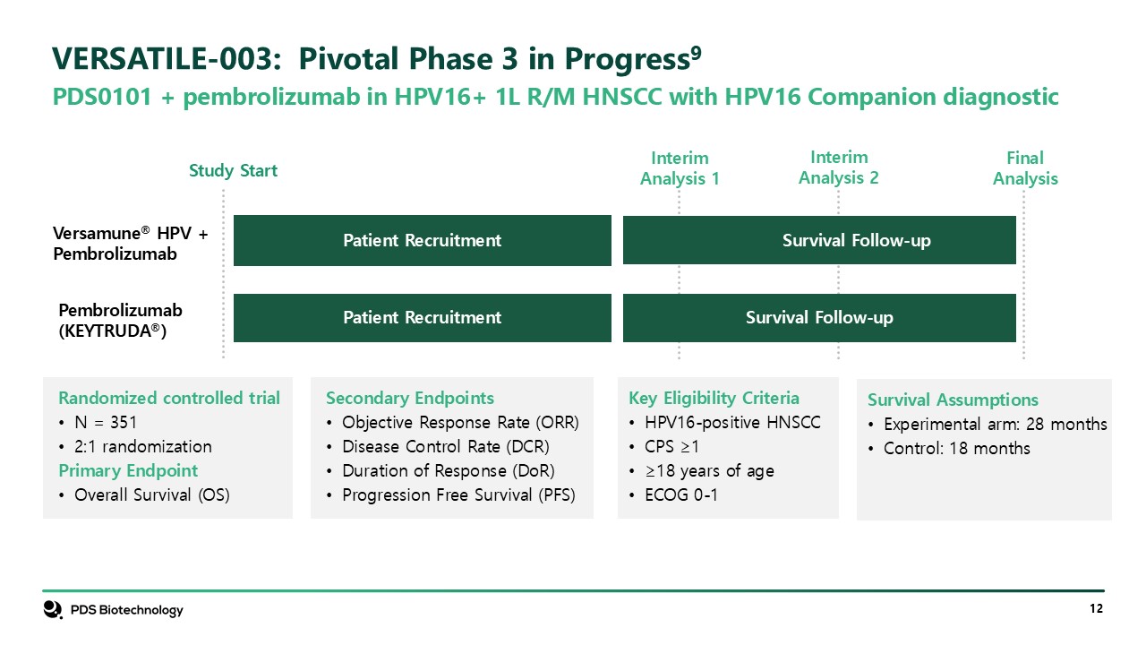 VERSATILE-003: Pivotal Phase 3 in Progress9  Interim  Analysis 1  Study Start  Versamune® HPV + Pembrolizumab  Pembrolizumab (KEYTRUDA®)  Patient Recruitment  Patient Recruitment  Survival Follow-up  Survival Follow-up   Key Eligibility Criteria  HPV16-positive HNSCC  CPS ≥1  ≥18 years of age  ECOG 0-1  Secondary Endpoints  Objective Response Rate (ORR)  Disease Control Rate (DCR)  Duration of Response (DoR)  Progression Free Survival (PFS)  Randomized controlled trial  N = 351  2:1 randomization  Primary Endpoint  Overall Survival (OS)  FinalAnalysis  Interim  Analysis 2  PDS0101 + pembrolizumab in HPV16+ 1L R/M HNSCC with HPV16 Companion diagnostic  Survival Assumptions  Experimental arm: 28 months  Control: 18 months
