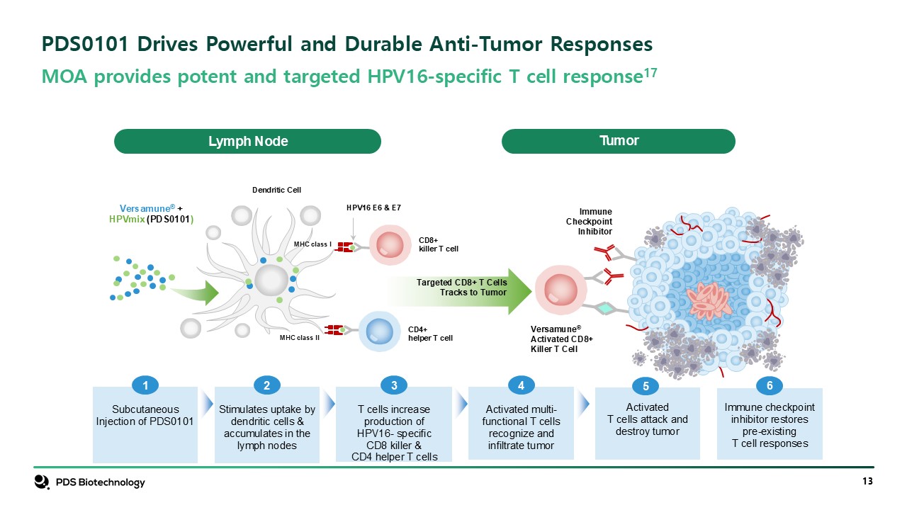 PDS0101 Drives Powerful and Durable Anti-Tumor Responses  Lymph Node  Tumor  CD4+helper T cell  CD8+killer T cell  HPV16 E6 & E7  Versamune®Activated CD8+Killer T Cell  ImmuneCheckpointInhibitor  Versamune® +HPVmix (PDS0101)  Targeted CD8+ T CellsTracks to Tumor  Dendritic Cell  MHC class I  MHC class II  Subcutaneous Injection of PDS0101  1  Stimulates uptake by dendritic cells & accumulates in the lymph nodes  2  T cells increaseproduction of HPV16- specificCD8 killer & CD4 helper T cells  3  Activated multi-functional T cells recognize and infiltrate tumor  4  Activated T cells attack anddestroy tumor  5  Immune checkpoint inhibitor restores pre-existing T cell responses  6  MOA provides potent and targeted HPV16-specific T cell response17