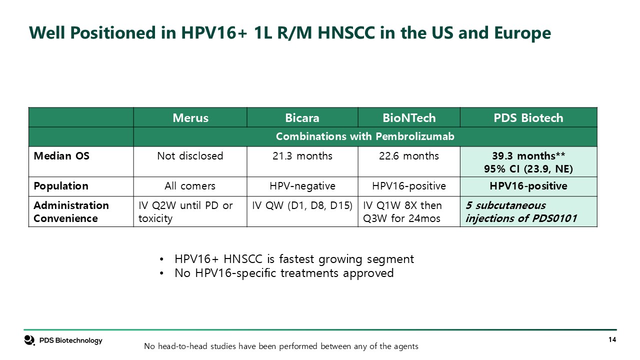 Well Positioned in HPV16+ 1L R/M HNSCC in the US and Europe  Merus  Bicara  BioNTech  PDS Biotech  Combinations with Pembrolizumab  Median OS  Not disclosed  21.3 months  22.6 months  39.3 months**  95% CI (23.9, NE)  Population   All comers  HPV-negative  HPV16-positive  HPV16-positive  Administration Convenience  IV Q2W until PD or toxicity  IV QW (D1, D8, D15)  IV Q1W 8X then Q3W for 24mos  5 subcutaneous injections of PDS0101  No head-to-head studies have been performed between any of the agents  HPV16+ HNSCC is fastest growing segment   No HPV16-specific treatments approved