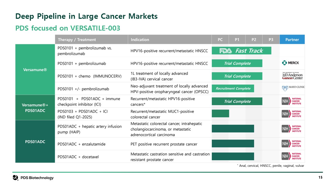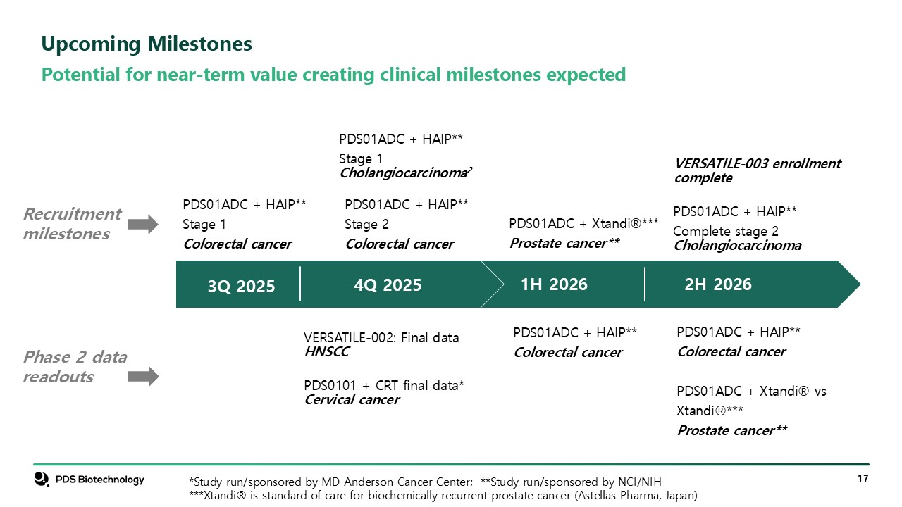 Potential for near-term value creating clinical milestones expected  Upcoming Milestones  1H 2026  VERSATILE-003 enrollment complete  PDS01ADC + HAIP**  Complete stage 2 Cholangiocarcinoma  PDS01ADC + HAIP**   Stage 2   Colorectal cancer  PDS01ADC + HAIP**   Stage 1 Cholangiocarcinoma2  PDS01ADC + HAIP**  Colorectal cancer  PDS01ADC + Xtandi® vs   Xtandi®***  Prostate cancer**  *Study run/sponsored by MD Anderson Cancer Center; **Study run/sponsored by NCI/NIH  ***Xtandi® is standard of care for biochemically recurrent prostate cancer (Astellas Pharma, Japan)  PDS01ADC + Xtandi®***  Prostate cancer**  VERSATILE-002: Final data HNSCC  PDS0101 + CRT final data* Cervical cancer  2H 2026  PDS01ADC + HAIP**   Colorectal cancer  4Q 2025  Phase 2 data   readouts  PDS01ADC + HAIP**   Stage 1   Colorectal cancer  Recruitment  milestones  3Q 2025
