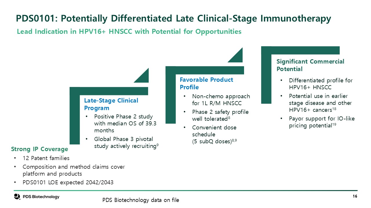 PDS0101: Potentially Differentiated Late Clinical-Stage Immunotherapy  Lead Indication in HPV16+ HNSCC with Potential for Opportunities  Strong IP Coverage  12 Patent families  Composition and method claims cover platform and products  PDS0101 LOE expected 2042/2043  Late-Stage Clinical Program  Positive Phase 2 study with median OS of 39.3 months  Global Phase 3 pivotal study actively recruiting9   Favorable Product Profile  Non-chemo approach for 1L R/M HNSCC  Phase 2 safety profile well tolerated8  Convenient dose schedule (5 subQ doses)8,9  Significant Commercial Potential  Differentiated profile for HPV16+ HNSCC  Potential use in earlier stage disease and other HPV16+ cancers18  Payor support for IO-like pricing potential19   PDS Biotechnology data on file