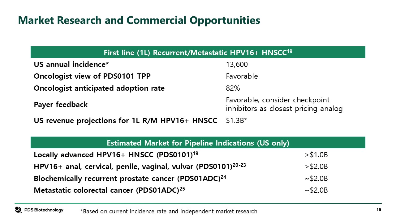 Market Research and Commercial Opportunities  First line (1L) Recurrent/Metastatic HPV16+ HNSCC19  US annual incidence*  13,600  Oncologist view of PDS0101 TPP  Favorable  Oncologist anticipated adoption rate  82%  Payer feedback  Favorable, consider checkpoint inhibitors as closest pricing analog  US revenue projections for 1L R/M HPV16+ HNSCC  $1.3B*  Estimated Market for Pipeline Indications (US only)  Locally advanced HPV16+ HNSCC (PDS0101)19  >$1.0B  HPV16+ anal, cervical, penile, vaginal, vulvar (PDS0101)20-23  >$2.0B  Biochemically recurrent prostate cancer (PDS01ADC)24  ~$2.0B  Metastatic colorectal cancer (PDS01ADC)25  ~$2.0B  *Based on current incidence rate and independent market research