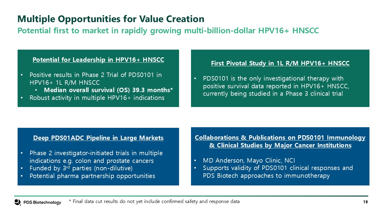 Multiple Opportunities for Value Creation  Potential for Leadership in HPV16+ HNSCC  Positive results in Phase 2 Trial of PDS0101 in HPV16+ 1L R/M HNSCC  Median overall survival (OS) 39.3 months*   Robust activity in multiple HPV16+ indications  First Pivotal Study in 1L R/M HPV16+ HNSCC  PDS0101 is the only investigational therapy with positive survival data reported in HPV16+ HNSCC, currently being studied in a Phase 3 clinical trial  Deep PDS01ADC Pipeline in Large Markets  Phase 2 investigator-initiated trials in multiple indications e.g. colon and prostate cancers  Funded by 3rd parties (non-dilutive)  Potential pharma partnership opportunities  Collaborations & Publications on PDS0101 Immunology & Clinical Studies by Major Cancer Institutions   MD Anderson, Mayo Clinic, NCI  Supports validity of PDS0101 clinical responses and PDS Biotech approaches to immunotherapy  Potential first to market in rapidly growing multi-billion-dollar HPV16+ HNSCC  * Final data cut results do not yet include confirmed safety and response data