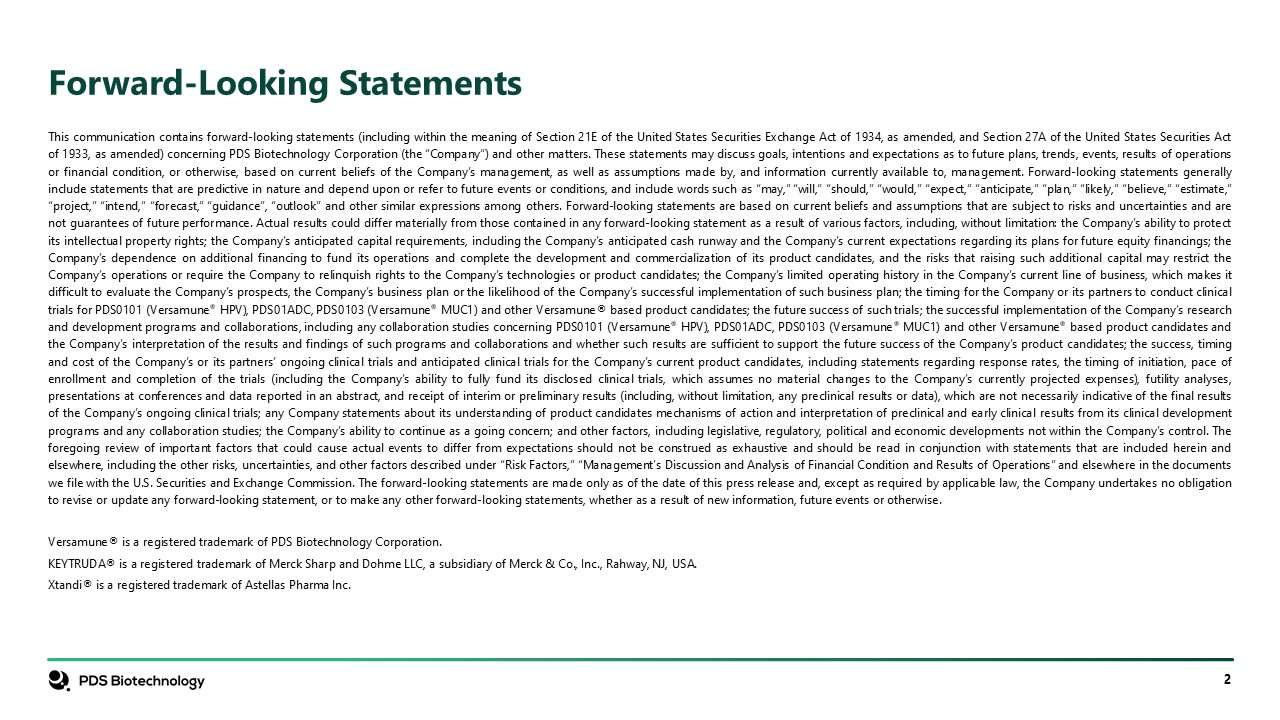 Forward-Looking Statements  This communication contains forward-looking statements (including within the meaning of Section 21E of the United States Securities Exchange Act of 1934, as amended, and Section 27A of the United States Securities Act of 1933, as amended) concerning PDS Biotechnology Corporation (the “Company”) and other matters. These statements may discuss goals, intentions and expectations as to future plans, trends, events, results of operations or financial condition, or otherwise, based on current beliefs of the Company’s management, as well as assumptions made by, and information currently available to, management. Forward-looking statements generally include statements that are predictive in nature and depend upon or refer to future events or conditions, and include words such as “may,” “will,” “should,” “would,” “expect,” “anticipate,” “plan,” “likely,” “believe,” “estimate,” “project,” “intend,” “forecast,” “guidance”, “outlook” and other similar expressions among others. Forward-looking statements are based on current beliefs and assumptions that are subject to risks and uncertainties and are not guarantees of future performance. Actual results could differ materially from those contained in any forward-looking statement as a result of various factors, including, without limitation: the Company’s ability to protect its intellectual property rights; the Company’s anticipated capital requirements, including the Company’s anticipated cash runway and the Company’s current expectations regarding its plans for future equity financings; the Company’s dependence on additional financing to fund its operations and complete the development and commercialization of its product candidates, and the risks that raising such additional capital may restrict the Company’s operations or require the Company to relinquish rights to the Company’s technologies or product candidates; the Company’s limited operating history in the Company’s current line of business, which makes it difficult to evaluate the Company’s prospects, the Company’s business plan or the likelihood of the Company’s successful implementation of such business plan; the timing for the Company or its partners to conduct clinical trials for PDS0101 (Versamune® HPV), PDS01ADC, PDS0103 (Versamune® MUC1) and other Versamune® based product candidates; the future success of such trials; the successful implementation of the Company’s research and development programs and collaborations, including any collaboration studies concerning PDS0101 (Versamune® HPV), PDS01ADC, PDS0103 (Versamune® MUC1) and other Versamune® based product candidates and the Company’s interpretation of the results and findings of such programs and collaborations and whether such results are sufficient to support the future success of the Company’s product candidates; the success, timing and cost of the Company’s or its partners’ ongoing clinical trials and anticipated clinical trials for the Company’s current product candidates, including statements regarding response rates, the timing of initiation, pace of enrollment and completion of the trials (including the Company’s ability to fully fund its disclosed clinical trials, which assumes no material changes to the Company’s currently projected expenses), futility analyses, presentations at conferences and data reported in an abstract, and receipt of interim or preliminary results (including, without limitation, any preclinical results or data), which are not necessarily indicative of the final results of the Company’s ongoing clinical trials; any Company statements about its understanding of product candidates mechanisms of action and interpretation of preclinical and early clinical results from its clinical development programs and any collaboration studies; the Company’s ability to continue as a going concern; and other factors, including legislative, regulatory, political and economic developments not within the Company’s control. The foregoing review of important factors that could cause actual events to differ from expectations should not be construed as exhaustive and should be read in conjunction with statements that are included herein and elsewhere, including the other risks, uncertainties, and other factors described under “Risk Factors,” “Management’s Discussion and Analysis of Financial Condition and Results of Operations” and elsewhere in the documents we file with the U.S. Securities and Exchange Commission. The forward-looking statements are made only as of the date of this press release and, except as required by applicable law, the Company undertakes no obligation to revise or update any forward-looking statement, or to make any other forward-looking statements, whether as a result of new information, future events or otherwise.       Versamune® is a registered trademark of PDS Biotechnology Corporation.  KEYTRUDA® is a registered trademark of Merck Sharp and Dohme LLC, a subsidiary of Merck & Co., Inc., Rahway, NJ, USA.  Xtandi® is a registered trademark of Astellas Pharma Inc.