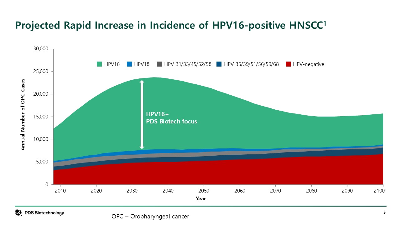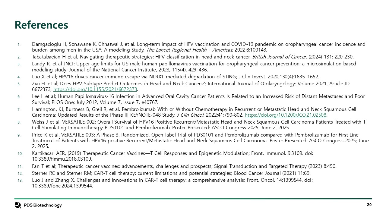 References  Damgacioglu H, Sonawane K, Chhatwal J, et al. Long-term impact of HPV vaccination and COVID-19 pandemic on oropharyngeal cancer incidence and burden among men in the USA: A modeling Study. The Lancet Regional Health – Americas. 2022;8:100143.  Tabatabaeian H et al, Navigating therapeutic strategies: HPV classification in head and neck cancer, British Journal of Cancer. (2024) 131: 220-230.  Landy R, et al JNCI: Upper age limits for US male human papillomavirus vaccination for oropharyngeal cancer prevention: a microsimulation-based modeling study; Journal of the National Cancer Institute, 2023, 115(4), 429–436.  Luo X et al; HPV16 drives cancer immune escape via NLRX1-mediated degradation of STING; J Clin Invest. 2020;130(4):1635–1652.  Ziai H. et al; Does HPV Subtype Predict Outcomes in Head and Neck Cancers?; International Journal of Otolaryngology; Volume 2021, Article ID 6672373; https://doi.org/10.1155/2021/6672373.  Lee L et al; Human Papillomavirus-16 Infection in Advanced Oral Cavity Cancer Patients Is Related to an Increased Risk of Distant Metastases and Poor Survival; PLOS One; July 2012, Volume 7, Issue 7, e40767.  Harrington, KJ, Burtness B, Greil R, et al. Pembrolizumab With or Without Chemotherapy in Recurrent or Metastatic Head and Neck Squamous Cell Carcinoma: Updated Results of the Phase III KEYNOTE-048 Study. J Clin Oncol. 2022;41:790-802. https://doi.org/10.1200/JCO.21.02508.  Weiss J et al. VERSATILE-002: Overall Survival of HPV16 Positive Recurrent/Metastatic Head and Neck Squamous Cell Carcinoma Patients Treated with T Cell Stimulating Immunotherapy PDS0101 and Pembrolizumab. Poster Presented: ASCO Congress 2025; June 2, 2025.  Price K et al. VERSATILE-003: A Phase 3, Randomized, Open-label Trial of PDS0101 and Pembrolizumab compared with Pembrolizumab for First-Line Treatment of Patients with HPV16-positive Recurrent/Metastatic Head and Neck Squamous Cell Carcinoma. Poster Presented: ASCO Congress 2025; June 2, 2025.  Kartikasari AER, (2019) Therapeutic Cancer Vaccines—T Cell Responses and Epigenetic Modulation; Front. Immunol. 9:3109. doi: 10.3389/fimmu.2018.03109.  Fan T et al; Therapeutic cancer vaccines: advancements, challenges and prospects; Signal Transduction and Targeted Therapy (2023) 8:450.  Sterner RC and Sterner RM; CAR-T cell therapy: current limitations and potential strategies; Blood Cancer Journal (2021) 11:69.  Luo J and Zhang X, Challenges and innovations in CAR-T cell therapy: a comprehensive analysis; Front. Oncol. 14:1399544. doi: 10.3389/fonc.2024.1399544.
