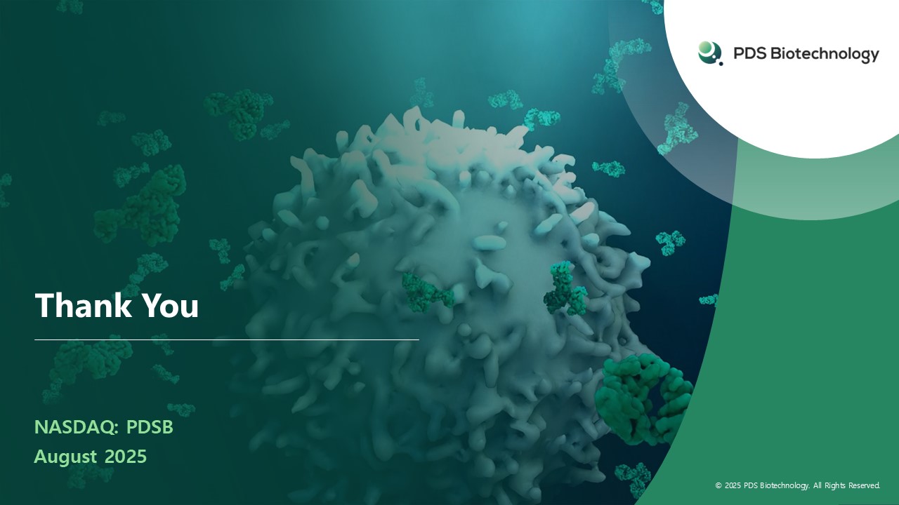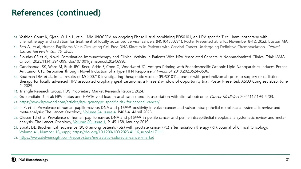 References (continued)  Yoshida-Court K, Gjyshi O, Lin L, et al. IMMUNOCERV, an ongoing Phase II trial combining PDS0101, an HPV-specific T cell immunotherapy with chemotherapy and radiation for treatment of locally advanced cervical cancers (NCT04580771). Poster Presented at: SITC; November 8-12, 2022; Boston MA.  Seo A., et al, Human Papilloma Virus Circulating Cell-Free DNA Kinetics in Patients with Cervical Cancer Undergoing Definitive Chemoradiation, Clinical Cancer Research, Jan. 10, 2025.  Floudas CS et al, Novel Combination Immunotherapy and Clinical Activity in Patients With HPV-Associated Cancers: A Nonrandomized Clinical Trial; JAMA Oncol. 2025;11;(4):394-399. doi:10.1001/jamaoncol.2024.6998.  Gandhapudi SK, Ward M, Bush JPC, Bedu-Addo F, Conn G, Woodward JG. Antigen Priming with Enantiospecific Cationic Lipid Nanoparticles Induces Potent Antitumor CTL Responses through Novel Induction of a Type I IFN Response. J Immunol. 2019;202:3524-3536.  Routman DM et al., Initial results of MC200710 investigating therapeutic vaccine (PDS0101) alone or with pembrolizumab prior to surgery or radiation therapy for locally advanced HPV associated oropharyngeal carcinoma, a Phase 2 window of opportunity trial. Poster Presented: ASCO Congress 2025; June 2, 2025.  Triangle Research Group. PDS Proprietary Market Research Report. 2024.  Guerendiain D et al; HPV status and HPV16 viral load in anal cancer and its association with clinical outcome; Cancer Medicine. 2022;11:4193–4203.  https://www.hpvworld.com/articles/hpv-genotype-specific-risk-for-cervical-cancer/  Li Z. et al, Prevalence of human papillomavirus DNA and p16INK4a positivity in vulvar cancer and vulvar intraepithelial neoplasia: a systematic review and meta-analysis; The Lancet Oncology; Volume 24, Issue 4, p403-414April 2023.  Olesen TB et al, Prevalence of human papillomavirus DNA and p16INK4a in penile cancer and penile intraepithelial neoplasia: a systematic review and meta-analysis, The Lancet Oncology, Volume 20, Issue 1, p145-158, January 2019.  Spratt DE; Biochemical recurrence (BCR) among patients (pts) with prostate cancer (PC) after radiation therapy (RT); Journal of Clinical Oncology; Volume 41, Number 16_suppl; https://doi.org/10.1200/JCO.2023.41.16_suppl.e17111.  https://www.delveinsight.com/report-store/metastatic-colorectal-cancer-market