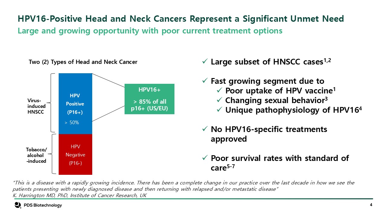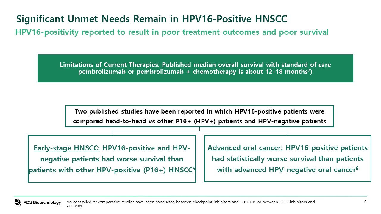 Significant Unmet Needs Remain in HPV16-Positive HNSCC   Limitations of Current Therapies: Published median overall survival with standard of care pembrolizumab or pembrolizumab + chemotherapy is about 12-18 months7)  No controlled or comparative studies have been conducted between checkpoint inhibitors and PDS0101 or between EGFR inhibitors and PDS0101.  HPV16-positivity reported to result in poor treatment outcomes and poor survival
