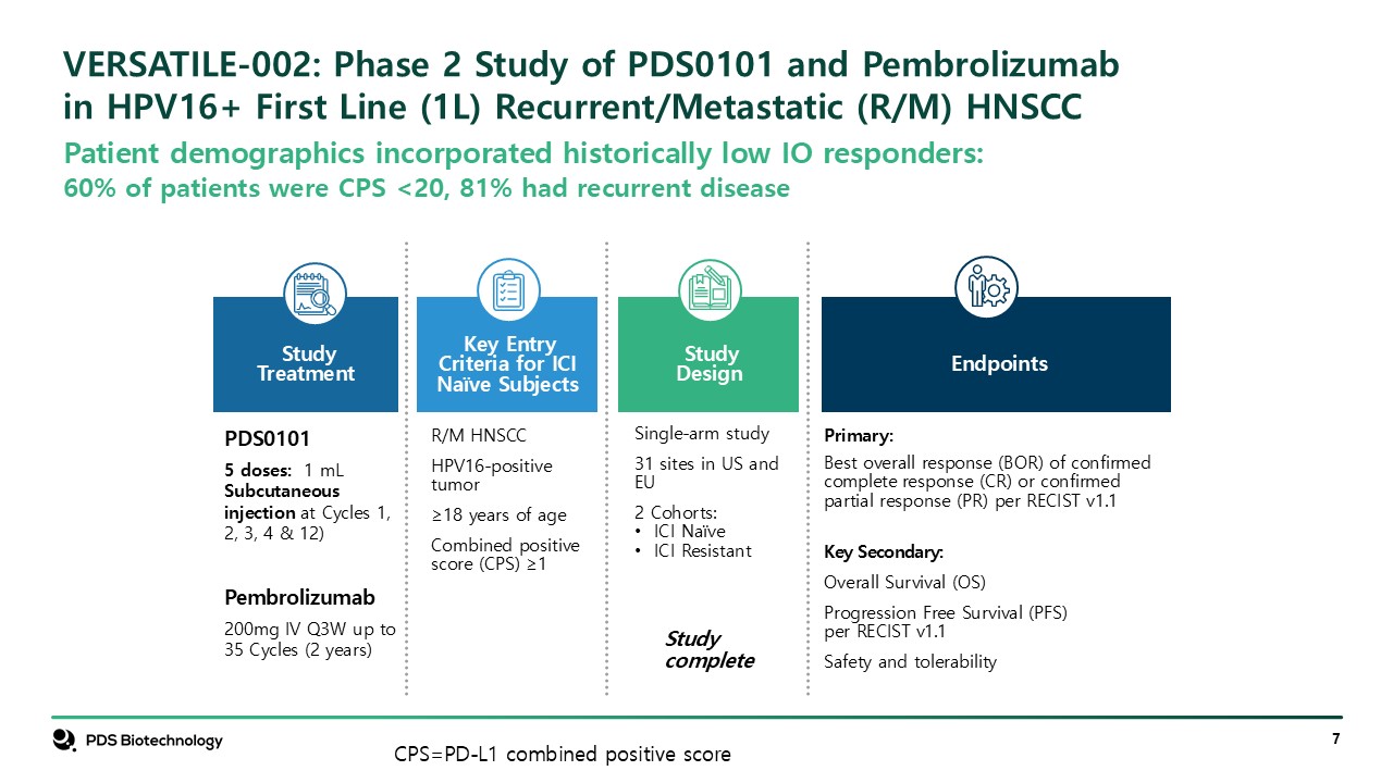 VERSATILE-002: Phase 2 Study of PDS0101 and Pembrolizumab in HPV16+ First Line (1L) Recurrent/Metastatic (R/M) HNSCC  StudyDesign  Single-arm study  31 sites in US and EU  2 Cohorts:   ICI Naïve  ICI Resistant  Study complete  Key Entry Criteria for ICI Naïve Subjects  R/M HNSCC  HPV16-positive tumor  ≥18 years of age  Combined positive score (CPS) ≥1  PDS0101  5 doses: 1 mL Subcutaneous injection at Cycles 1, 2, 3, 4 & 12)  Pembrolizumab  200mg IV Q3W up to 35 Cycles (2 years)  Study Treatment  Primary:  Best overall response (BOR) of confirmed complete response (CR) or confirmed partial response (PR) per RECIST v1.1  Key Secondary:  Overall Survival (OS)  Progression Free Survival (PFS) per RECIST v1.1   Safety and tolerability  Endpoints  Patient demographics incorporated historically low IO responders:   60% of patients were CPS <20, 81% had recurrent disease  CPS=PD-L1 combined positive score