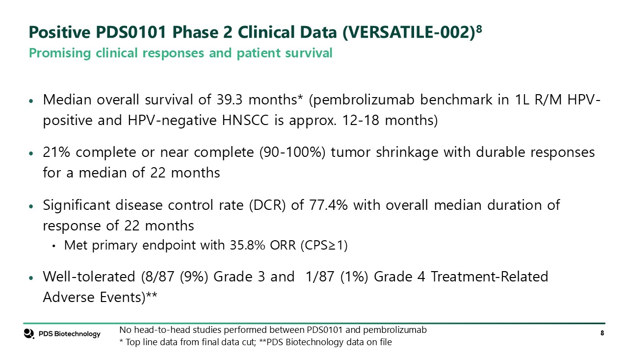 Promising clinical responses and patient survival  Median overall survival of 39.3 months* (pembrolizumab benchmark in 1L R/M HPV-positive and HPV-negative HNSCC is approx. 12-18 months)  21% complete or near complete (90-100%) tumor shrinkage with durable responses for a median of 22 months  Significant disease control rate (DCR) of 77.4% with overall median duration of response of 22 months  Met primary endpoint with 35.8% ORR (CPS≥1)  Well-tolerated (8/87 (9%) Grade 3 and 1/87 (1%) Grade 4 Treatment-Related Adverse Events)**  Positive PDS0101 Phase 2 Clinical Data (VERSATILE-002)8  No head-to-head studies performed between PDS0101 and pembrolizumab  * Top line data from final data cut; **PDS Biotechnology data on file