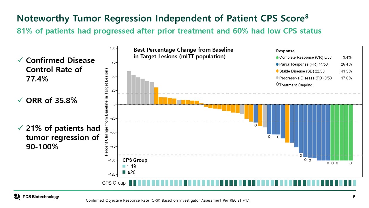 Percent Change from Baseline in Target Lesions  -50  -25  25  50  75  100  0  -75  -100  -125  Response  Complete Response (CR) 5/53 9.4%  Partial Response (PR) 14/53 26.4%  Stable Disease (SD) 22/53 41.5%  Progressive Disease (PD) 9/53 17.0%   Treatment Ongoing   Confirmed Objective Response Rate (ORR) Based on Investigator Assessment Per RECIST v1.1  Best Percentage Change from Baseline in Target Lesions (mITT population)  Noteworthy Tumor Regression Independent of Patient CPS Score8  81% of patients had progressed after prior treatment and 60% had low CPS status  Confirmed Disease Control Rate of 77.4%  ORR of 35.8%  21% of patients had tumor regression of 90-100%   CPS Group  CPS Group  1-19   ≥20