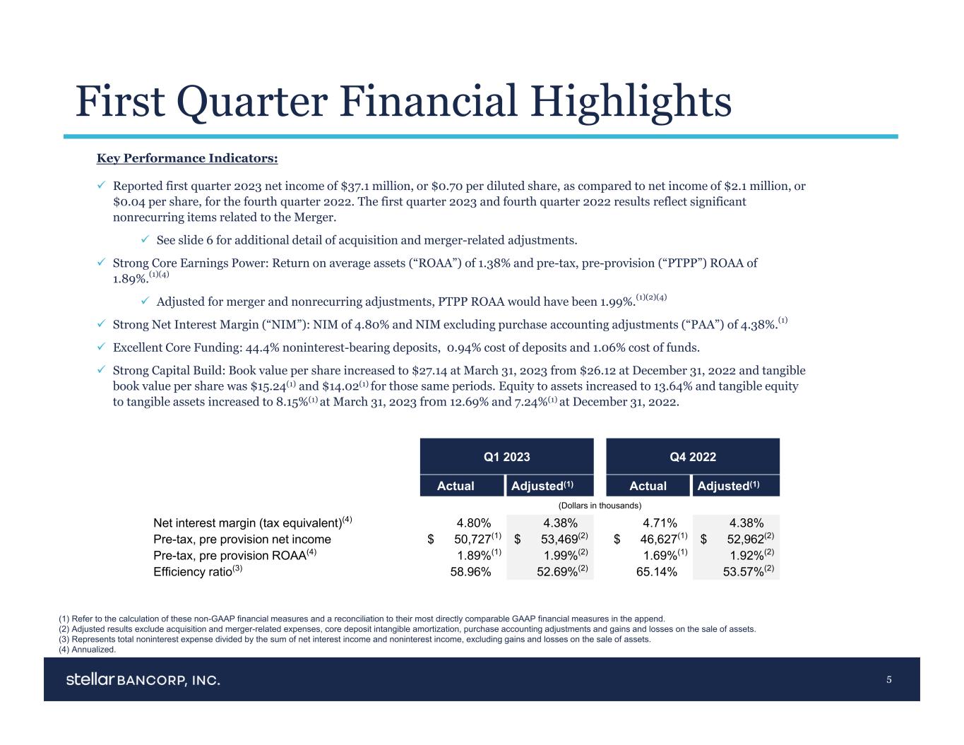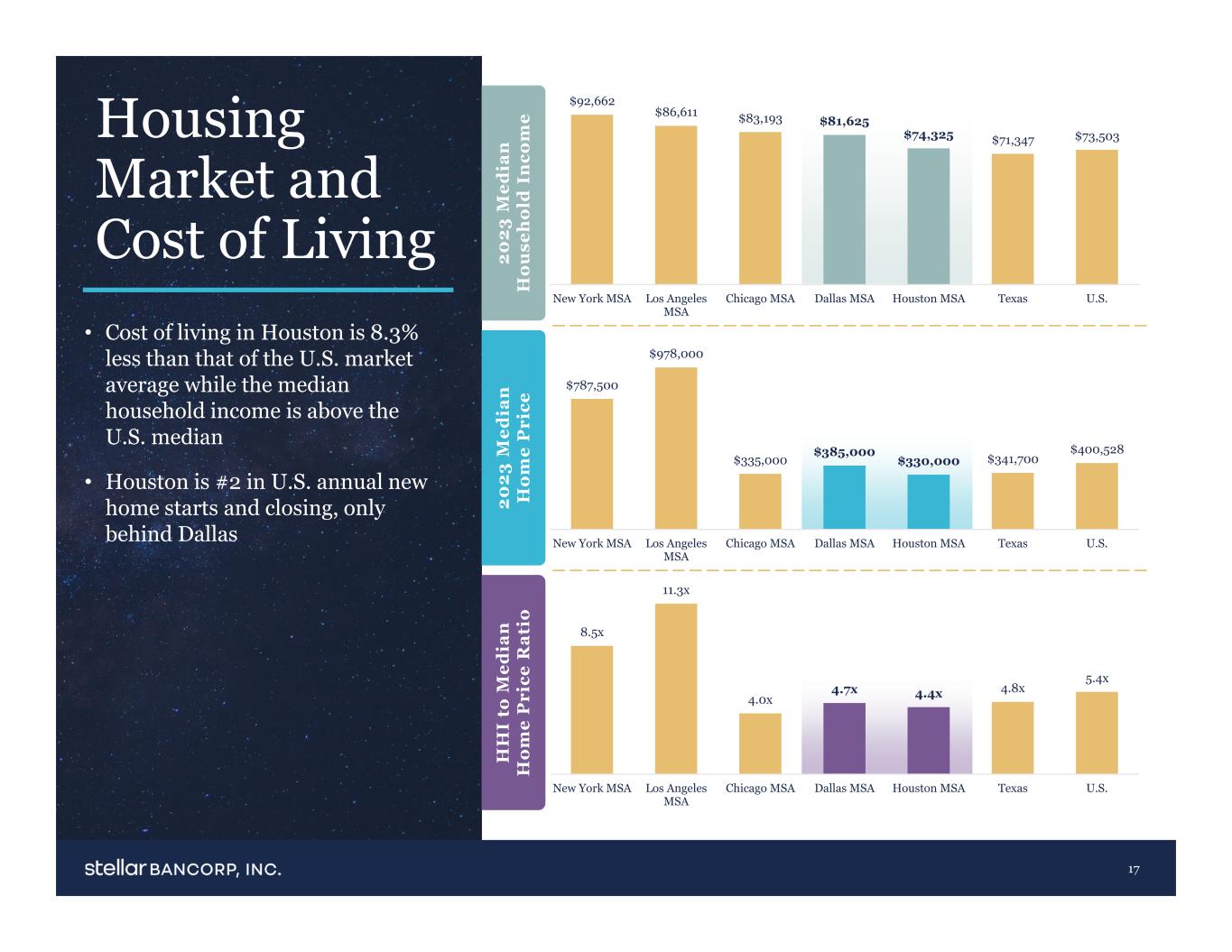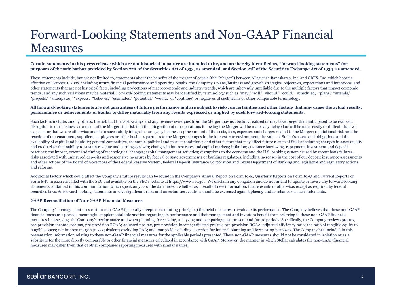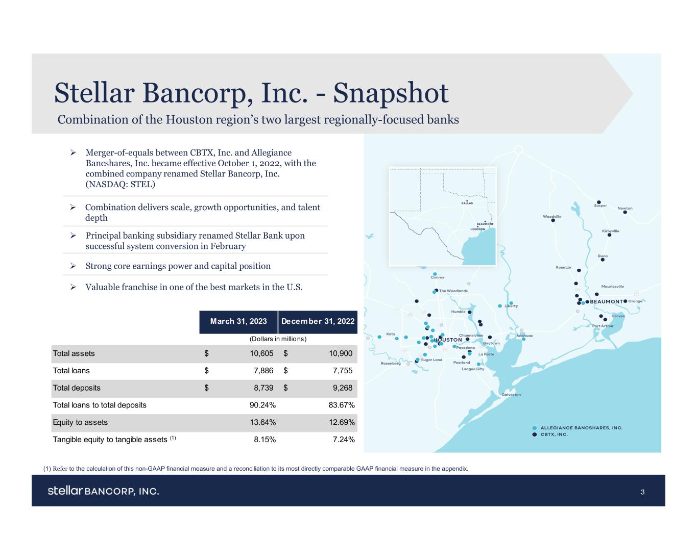 Forward-Looking Statements and Non-GAAP Financial Measures 2 Certain statements in this press release which are not historical in nature are intended to be, and are hereby identified as, “forward-looking statements” for purposes of the safe harbor provided by Section 27A of the Securities Act of 1933, as amended, and Section 21E of the Securities Exchange Act of 1934, as amended. These statements include, but are not limited to, statements about the benefits of the merger of equals (the “Merger”) between Allegiance Bancshares, Inc. and CBTX, Inc. which became effective on October 1, 2022, including future financial performance and operating results, the Company’s plans, business and growth strategies, objectives, expectations and intentions, and other statements that are not historical facts, including projections of macroeconomic and industry trends, which are inherently unreliable due to the multiple factors that impact economic trends, and any such variations may be material. Forward-looking statements may be identified by terminology such as “may,” “will,” “should,” “could,” “scheduled,” “plans,” “intends,” “projects,” “anticipates,” “expects,” “believes,” “estimates,” “potential,” “would,” or “continue” or negatives of such terms or other comparable terminology. All forward-looking statements are not guarantees of future performance and are subject to risks, uncertainties and other factors that may cause the actual results, performance or achievements of Stellar to differ materially from any results expressed or implied by such forward-looking statements. Such factors include, among others: the risk that the cost savings and any revenue synergies from the Merger may not be fully realized or may take longer than anticipated to be realized; disruption to our business as a result of the Merger; the risk that the integration of our operations following the Merger will be materially delayed or will be more costly or difficult than we expected or that we are otherwise unable to successfully integrate our legacy businesses; the amount of the costs, fees, expenses and charges related to the Merger; reputational risk and the reaction of our customers, suppliers, employees or other business partners to the Merger; changes in the interest rate environment, the value of Stellar’s assets and obligations and the availability of capital and liquidity; general competitive, economic, political and market conditions; and other factors that may affect future results of Stellar including changes in asset quality and credit risk; the inability to sustain revenue and earnings growth; changes in interest rates and capital markets; inflation; customer borrowing, repayment, investment and deposit practices; the impact, extent and timing of technological changes; capital management activities; disruptions to the economy and the U.S. banking system caused by recent bank failures, risks associated with uninsured deposits and responsive measures by federal or state governments or banking regulators, including increases in the cost of our deposit insurance assessments and other actions of the Board of Governors of the Federal Reserve System, Federal Deposit Insurance Corporation and Texas Department of Banking and legislative and regulatory actions and reforms. Additional factors which could affect the Company’s future results can be found in the Company’s Annual Report on Form 10-K, Quarterly Reports on Form 10-Q and Current Reports on Form 8-K, in each case filed with the SEC and available on the SEC’s website at https://www.sec.gov. We disclaim any obligation and do not intend to update or revise any forward-looking statements contained in this communication, which speak only as of the date hereof, whether as a result of new information, future events or otherwise, except as required by federal securities laws. As forward-looking statements involve significant risks and uncertainties, caution should be exercised against placing undue reliance on such statements. GAAP Reconciliation of Non-GAAP Financial Measures The Company’s management uses certain non-GAAP (generally accepted accounting principles) financial measures to evaluate its performance. The Company believes that these non-GAAP financial measures provide meaningful supplemental information regarding its performance and that management and investors benefit from referring to these non-GAAP financial measures in assessing the Company’s performance and when planning, forecasting, analyzing and comparing past, present and future periods. Specifically, the Company reviews pre-tax, pre-provision income; pre-tax, pre-provision ROAA; adjusted pre-tax, pre-provision income; adjusted pre-tax, pre-provision ROAA; adjusted efficiency ratio; the ratio of tangible equity to tangible assets; net interest margin (tax equivalent) excluding PAA; and loan yield excluding accretion for internal planning and forecasting purposes. The Company has included in this presentation information relating to these non-GAAP financial measures for the applicable periods presented. These non-GAAP measures should not be considered in isolation or as a substitute for the most directly comparable or other financial measures calculated in accordance with GAAP. Moreover, the manner in which Stellar calculates the non-GAAP financial measures may differ from that of other companies reporting measures with similar names.
