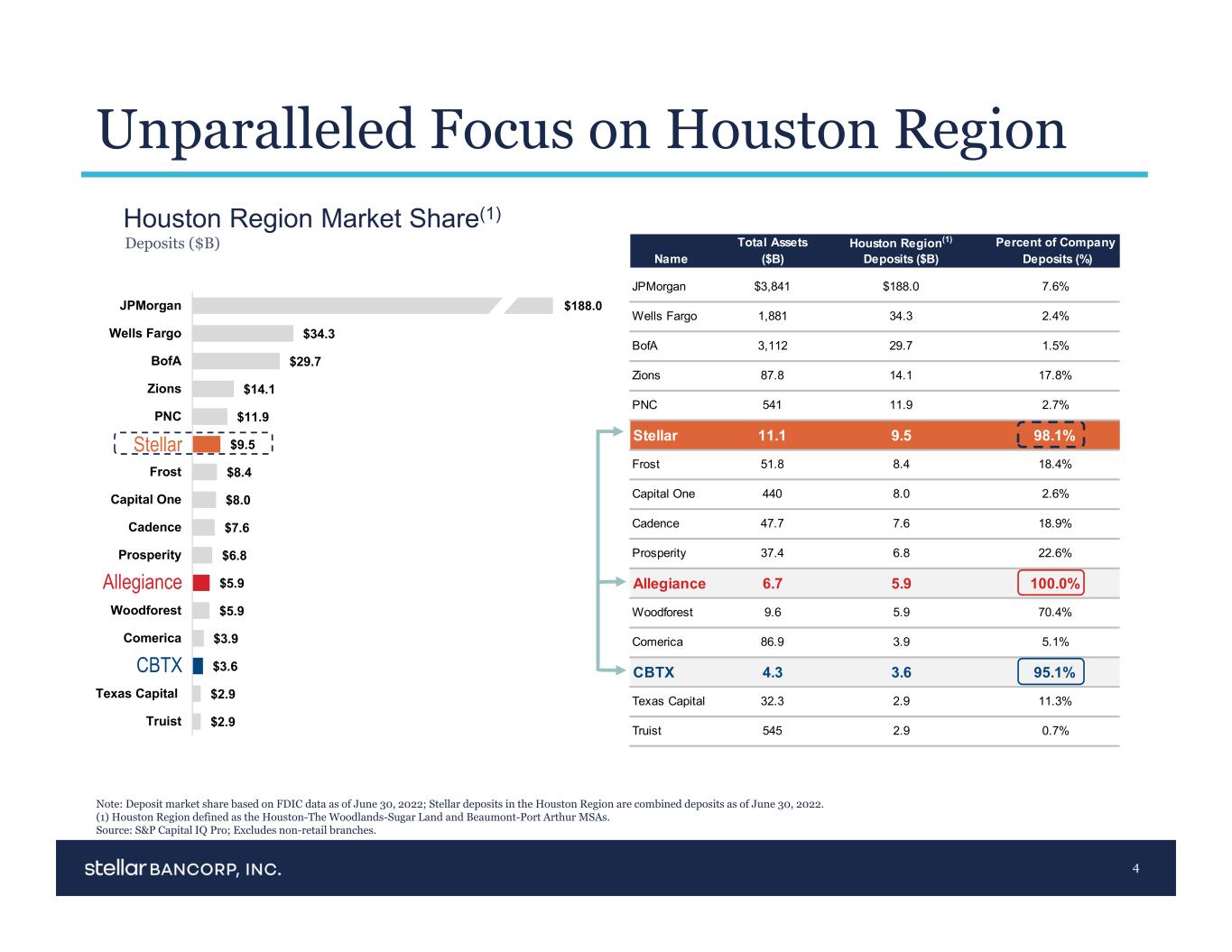 3 (1) Refer to the calculation of this non-GAAP financial measure and a reconciliation to its most directly comparable GAAP financial measure in the appendix. Stellar Bancorp, Inc. - Snapshot Combination of the Houston region’s two largest regionally-focused banks  Combination delivers scale, growth opportunities, and talent depth  Valuable franchise in one of the best markets in the U.S.  Merger-of-equals between CBTX, Inc. and Allegiance Bancshares, Inc. became effective October 1, 2022, with the combined company renamed Stellar Bancorp, Inc. (NASDAQ: STEL)  Strong core earnings power and capital position  Principal banking subsidiary renamed Stellar Bank upon successful system conversion in February March 31, 2023 December 31, 2022 Total assets 10,605$ 10,900$ Total loans 7,886$ 7,755$ Total deposits 8,739$ 9,268$ Total loans to total deposits 90.24% 83.67% Equity to assets 13.64% 12.69% Tangible equity to tangible assets (1) 8.15% 7.24% (Dollars in millions)