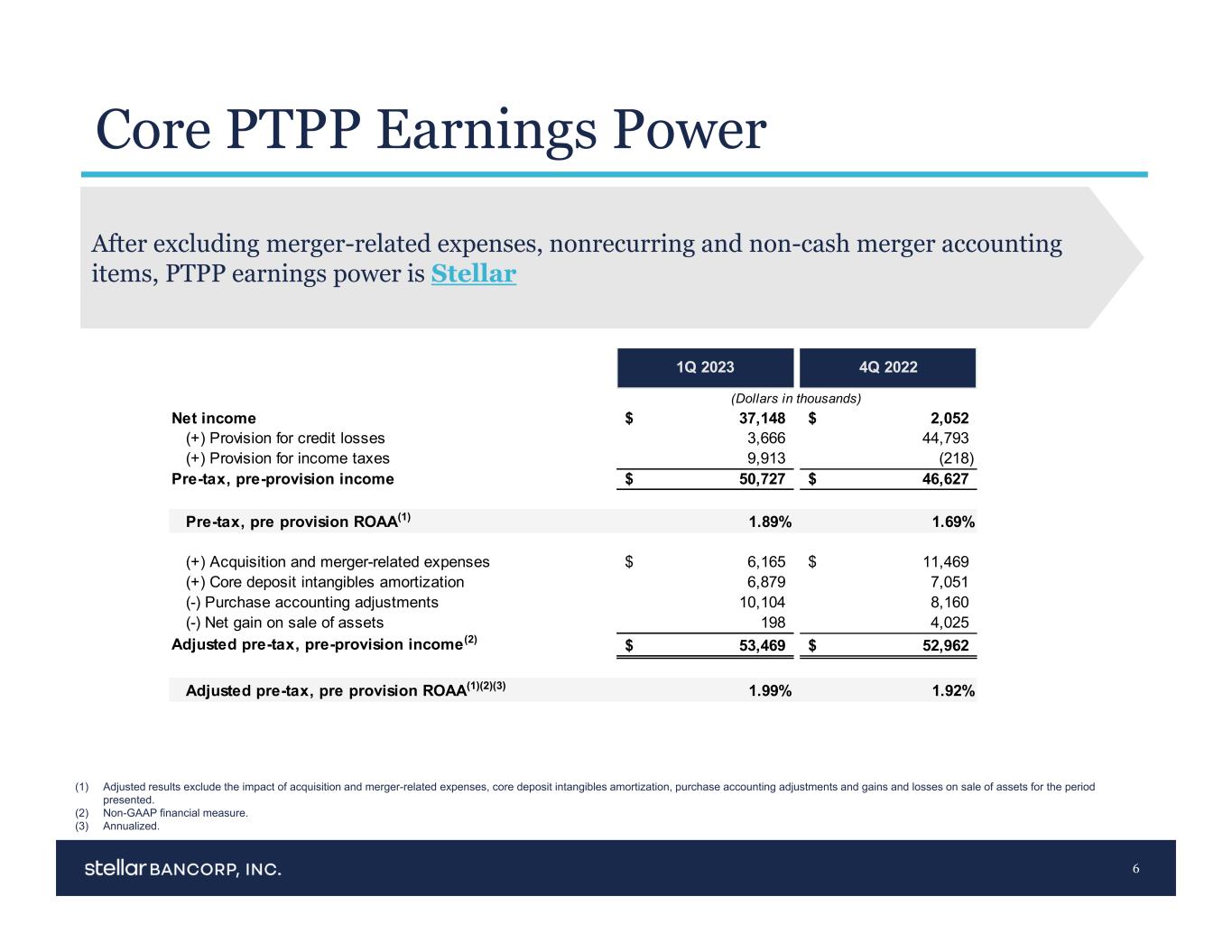 5 First Quarter Financial Highlights (1) Refer to the calculation of these non-GAAP financial measures and a reconciliation to their most directly comparable GAAP financial measures in the append. (2) Adjusted results exclude acquisition and merger-related expenses, core deposit intangible amortization, purchase accounting adjustments and gains and losses on the sale of assets. (3) Represents total noninterest expense divided by the sum of net interest income and noninterest income, excluding gains and losses on the sale of assets. (4) Annualized. Key Performance Indicators:  Reported first quarter 2023 net income of $37.1 million, or $0.70 per diluted share, as compared to net income of $2.1 million, or $0.04 per share, for the fourth quarter 2022. The first quarter 2023 and fourth quarter 2022 results reflect significant nonrecurring items related to the Merger.  See slide 6 for additional detail of acquisition and merger-related adjustments.  Strong Core Earnings Power: Return on average assets (“ROAA”) of 1.38% and pre-tax, pre-provision (“PTPP”) ROAA of 1.89%.(1)(4)  Adjusted for merger and nonrecurring adjustments, PTPP ROAA would have been 1.99%.(1)(2)(4)  Strong Net Interest Margin (“NIM”): NIM of 4.80% and NIM excluding purchase accounting adjustments (“PAA”) of 4.38%.(1)  Excellent Core Funding: 44.4% noninterest-bearing deposits, 0.94% cost of deposits and 1.06% cost of funds.  Strong Capital Build: Book value per share increased to $27.14 at March 31, 2023 from $26.12 at December 31, 2022 and tangible book value per share was $15.24(1) and $14.02(1) for those same periods. Equity to assets increased to 13.64% and tangible equity to tangible assets increased to 8.15%(1) at March 31, 2023 fr0m 12.69% and 7.24%(1) at December 31, 2022. Q1 2023 Q4 2022 Actual Adjusted(1) Actual Adjusted(1) (Dollars in thousands) Net interest margin (tax equivalent)(4) 4.80% 4.38% 4.71% 4.38% Pre-tax, pre provision net income $ 50,727 (1) $ 53,469 (2) $ 46,627 (1) $ 52,962 (2) Pre-tax, pre provision ROAA(4) 1.89%(1) 1.99%(2) 1.69%(1) 1.92%(2) Efficiency ratio(3) 58.96% 52.69%(2) 65.14% 53.57%(2)