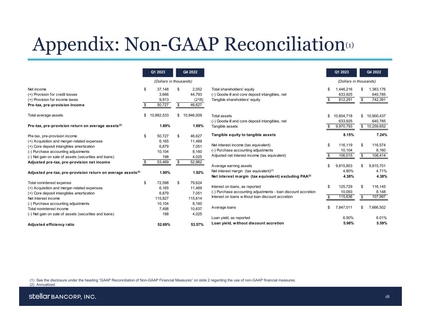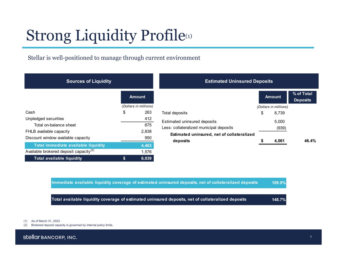 Core PTPP Earnings Power 6 (1) Adjusted results exclude the impact of acquisition and merger-related expenses, core deposit intangibles amortization, purchase accounting adjustments and gains and losses on sale of assets for the period presented. (2) Non-GAAP financial measure. (3) Annualized. After excluding merger-related expenses, nonrecurring and non-cash merger accounting items, PTPP earnings power is Stellar Net income 37,148$ 2,052$ (+) Provision for credit losses 3,666 44,793 (+) Provision for income taxes 9,913 (218) Pre-tax, pre-provision income 50,727$ 46,627$ Pre-tax, pre provision ROAA(1) 1.89% 1.69% (+) Acquisition and merger-related expenses 6,165$ 11,469$ (+) Core deposit intangibles amortization 6,879 7,051 (-) Purchase accounting adjustments 10,104 8,160 (-) Net gain on sale of assets 198 4,025 Adjusted pre-tax, pre-provision income(2) 53,469$ 52,962$ Adjusted pre-tax, pre provision ROAA(1)(2)(3) 1.99% 1.92% (Dollars in thousands) 1Q 2023 4Q 2022