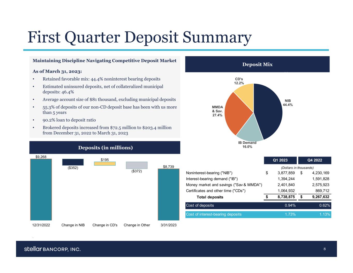 7 Strong Liquidity Profile(1) Stellar is well-positioned to manage through current environment Sources of Liquidity Sources of Liquidity Estimated Uninsured Deposits (1) As of March 31, 2023. (2) Brokered deposit capacity is governed by internal policy limits. (Dollars in millions) Cash 263$ Unpledged securities 412 Total on-balance sheet 675 FHLB available capacity 2,838 Discount window available capacity 950 Total immediate available liquidity 4,463 Available brokered deposit capacity(2) 1,576 Total available liquidity 6,039$ Amount % of Total Deposits (Dollars in millions) Total deposits 8,739$ Estimated uninsured deposits 5,000 Less: collateralized municipal deposits (939) Estimated uninsured, net of collateralized deposits 4,061$ 46.4% Amount 109.9% 148.7% Immediate available liquidity coverage of estimated uninsured deposits, net of collateralized deposits Total available liquidity coverage of estimated uninsured deposits, net of collateralized deposits