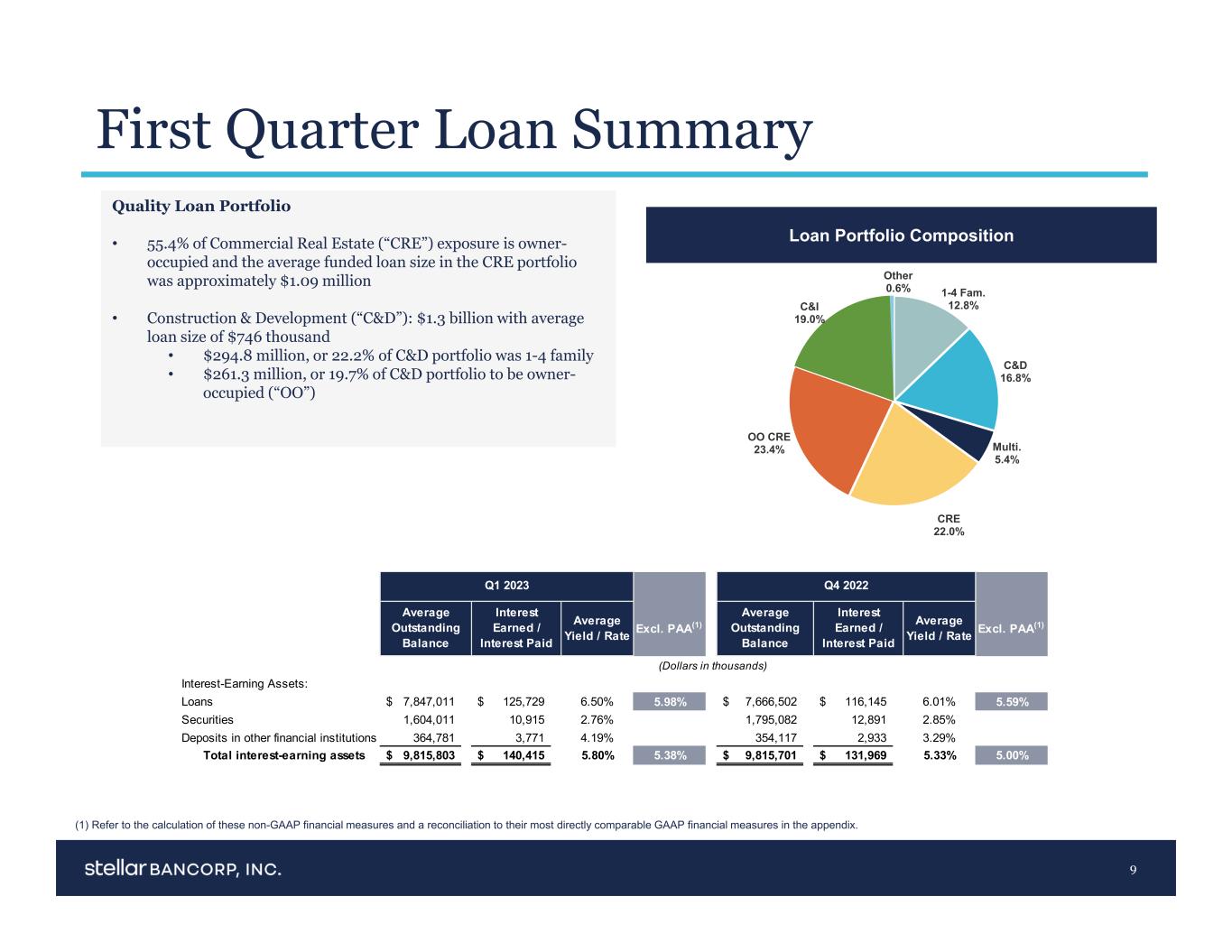 First Quarter Deposit Summary 8 Deposit Mix Deposits (in millions) Maintaining Discipline Navigating Competitive Deposit Market As of March 31, 2023: • Retained favorable mix: 44.4% noninterest bearing deposits • Estimated uninsured deposits, net of collateralized municipal deposits: 46.4% • Average account size of $81 thousand, excluding municipal deposits • 55.3% of deposits of our non-CD deposit base has been with us more than 5 years • 90.2% loan to deposit ratio • Brokered deposits increased from $72.5 million to $203.4 million from December 31, 2022 to March 31, 2023 . (1) NIB 44.4% IB Demand 16.0% MMDA & Sav. 27.4% CD's 12.2% Q1 2023 Q4 2022 Noninterest-bearing ("NIB") 3,877,859$ 4,230,169$ Interest-bearing demand ("IB") 1,394,244 1,591,828 Money market and savings ("Sav & MMDA") 2,401,840 2,575,923 Certificates and other time ("CDs") 1,064,932 869,712 Total deposits 8,738,875$ 9,267,632$ Cost of deposits 0.94% 0.62% Cost of interest-bearing deposits 1.73% 1.13% (Dollars in thousands)