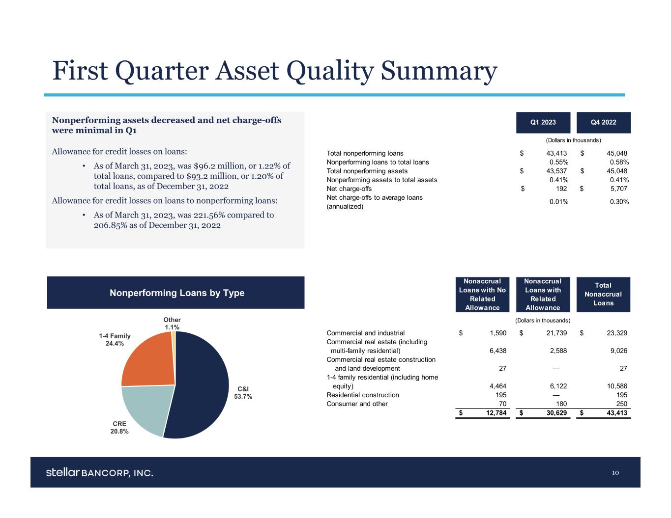 First Quarter Loan Summary 9 (1) Refer to the calculation of these non-GAAP financial measures and a reconciliation to their most directly comparable GAAP financial measures in the appendix. . Loan Portfolio Composition Quality Loan Portfolio • 55.4% of Commercial Real Estate (“CRE”) exposure is owner- occupied and the average funded loan size in the CRE portfolio was approximately $1.09 million • Construction & Development (“C&D”): $1.3 billion with average loan size of $746 thousand • $294.8 million, or 22.2% of C&D portfolio was 1-4 family • $261.3 million, or 19.7% of C&D portfolio to be owner- occupied (“OO”) (1) (1) 1-4 Fam. 12.8% C&D 16.8% Multi. 5.4% CRE 22.0% OO CRE 23.4% C&I 19.0% Other 0.6% Average Yield / Rate Excl. PAA(1) Average Yield / Rate Excl. PAA(1) Interest-Earning Assets: Loans 7,847,011$ 125,729$ 6.50% 5.98% 7,666,502$ 116,145$ 6.01% 5.59% Securities 1,604,011 10,915 2.76% 1,795,082 12,891 2.85% Deposits in other financial institutions 364,781 3,771 4.19% 354,117 2,933 3.29% Total interest-earning assets 9,815,803$ 140,415$ 5.80% 5.38% 9,815,701$ 131,969$ 5.33% 5.00% (Dollars in thousands) Q1 2023 Q4 2022 Average Outstanding Balance Interest Earned / Interest Paid Average Outstanding Balance Interest Earned / Interest Paid