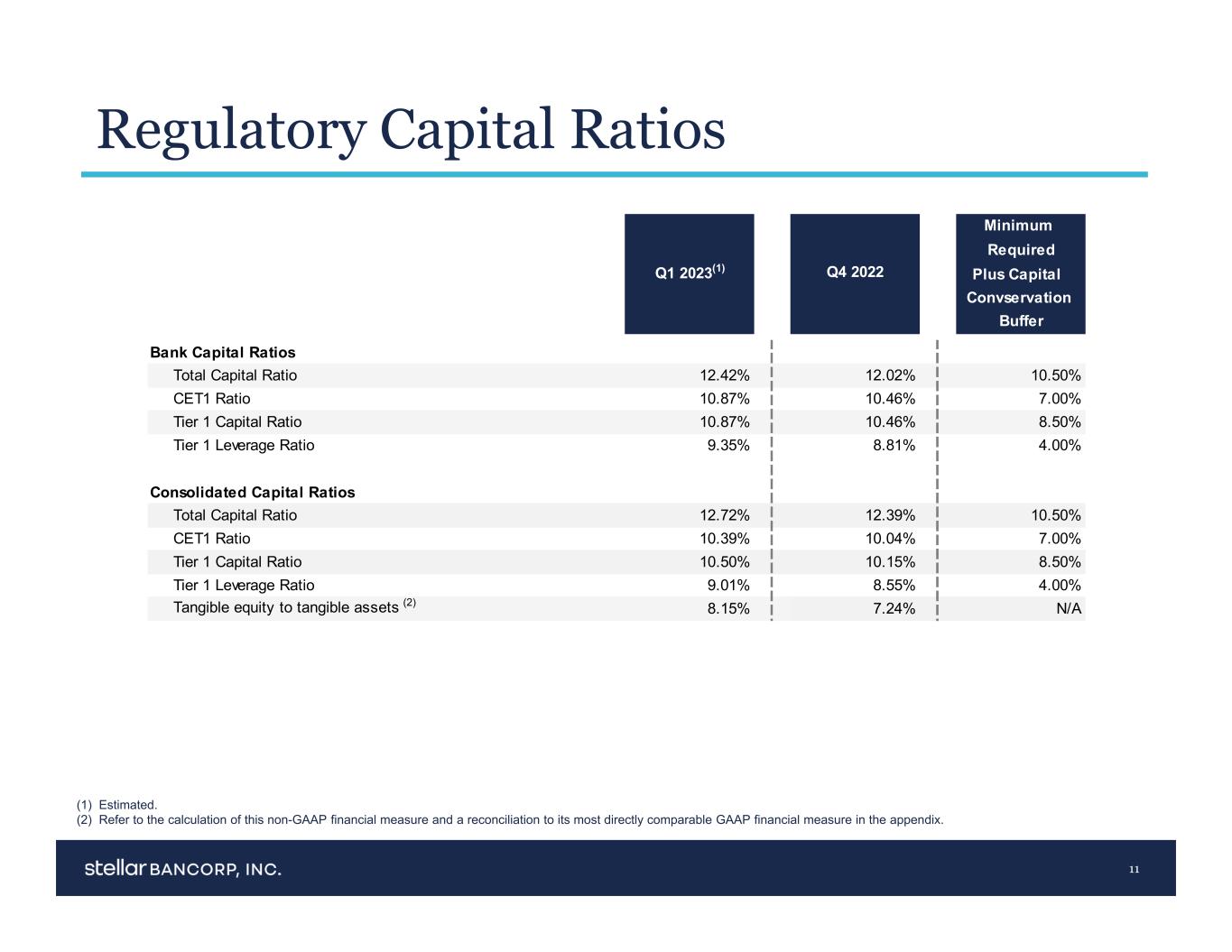 First Quarter Asset Quality Summary 10 Nonperforming Loans by Type (1) Combined represents the simple addition of legacy balances for 2022; estimated. Nonperforming assets decreased and net charge-offs were minimal in Q1 Allowance for credit losses on loans: • As of March 31, 2023, was $96.2 million, or 1.22% of total loans, compared to $93.2 million, or 1.20% of total loans, as of December 31, 2022 Allowance for credit losses on loans to nonperforming loans: • As of March 31, 2023, was 221.56% compared to 206.85% as of December 31, 2022 C&I 53.7% CRE 20.8% 1-4 Family 24.4% Other 1.1% Nonaccrual Loans with No Related Allowance Nonaccrual Loans with Related Allowance Total Nonaccrual Loans Commercial and industrial 1,590$ 21,739$ 23,329$ Commercial real estate (including multi-family residential) 6,438 2,588 9,026 Commercial real estate construction and land development 27 — 27 1-4 family residential (including home equity) 4,464 6,122 10,586 Residential construction 195 — 195 Consumer and other 70 180 250 12,784$ 30,629$ 43,413$ (Dollars in thousands) Q1 2023 Q4 2022 Total nonperforming loans 43,413$ 45,048$ Nonperforming loans to total loans 0.55% 0.58% Total nonperforming assets 43,537$ 45,048$ Nonperforming assets to total assets 0.41% 0.41% Net charge-offs 192$ 5,707$ Net charge-offs to average loans (annualized) 0.01% 0.30% (Dollars in thousands)