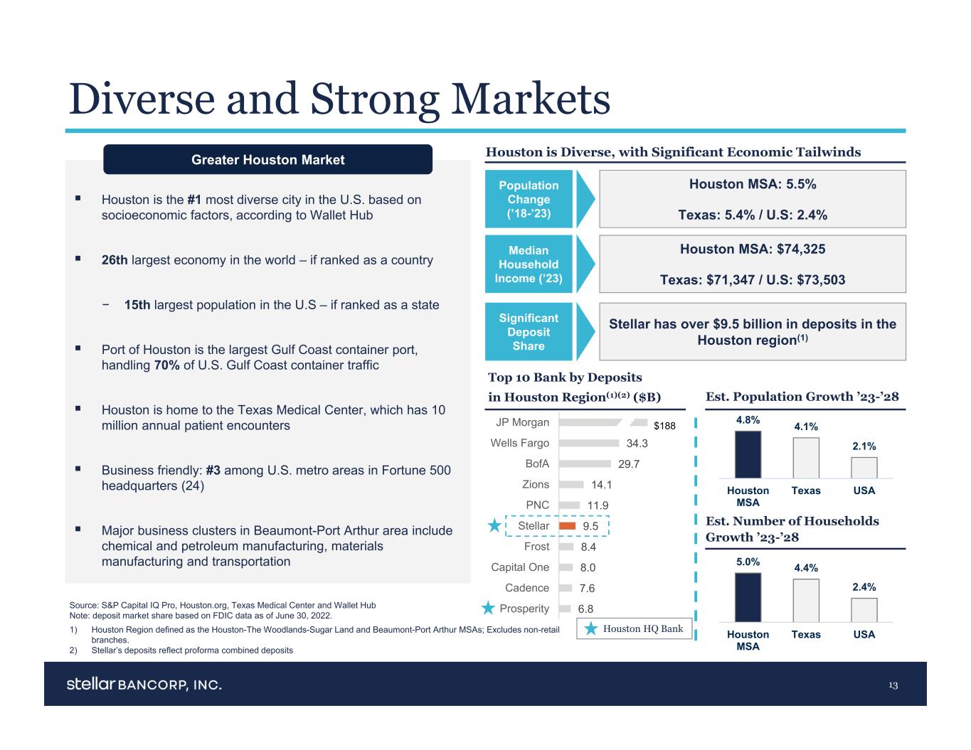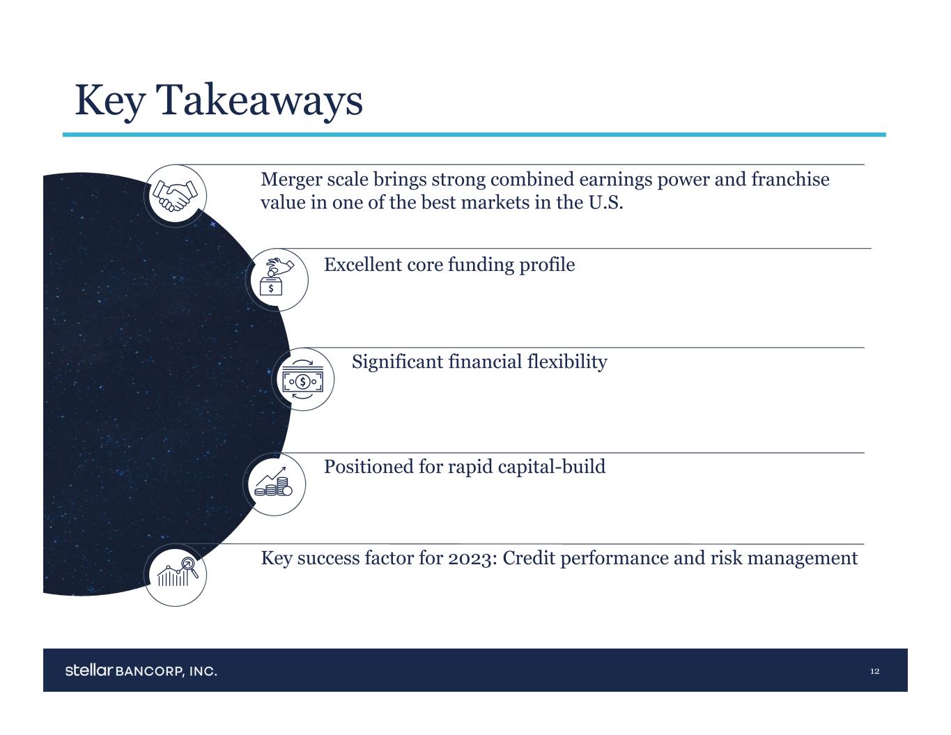 12 Key Takeaways Excellent core funding profile Merger scale brings strong combined earnings power and franchise value in one of the best markets in the U.S. Key success factor for 2023: Credit performance and risk management Significant financial flexibility Positioned for rapid capital-build