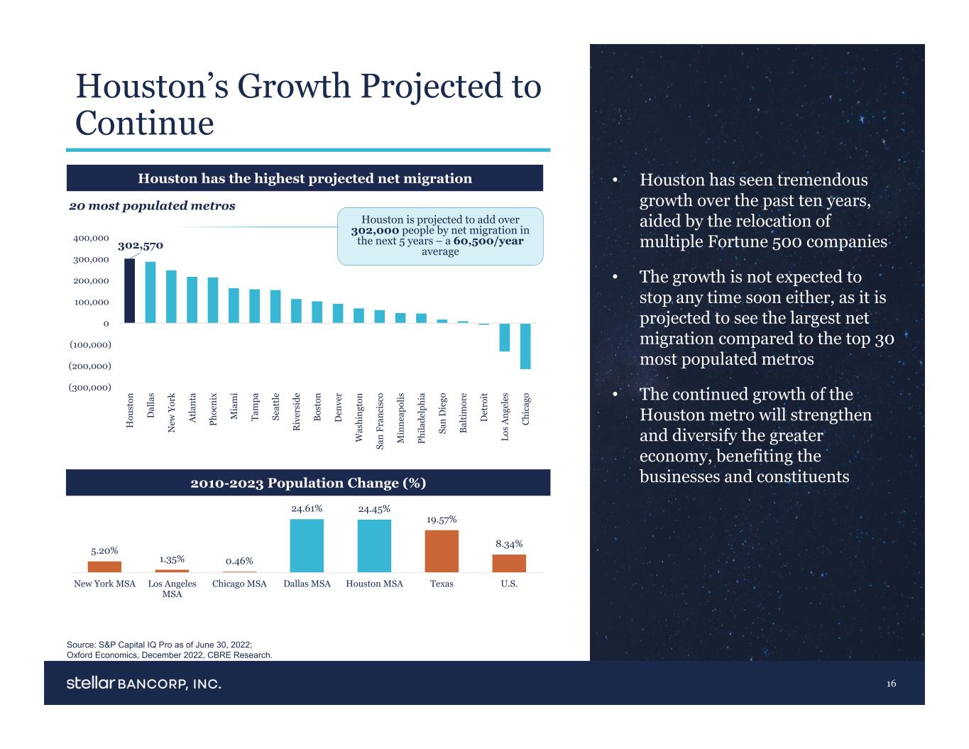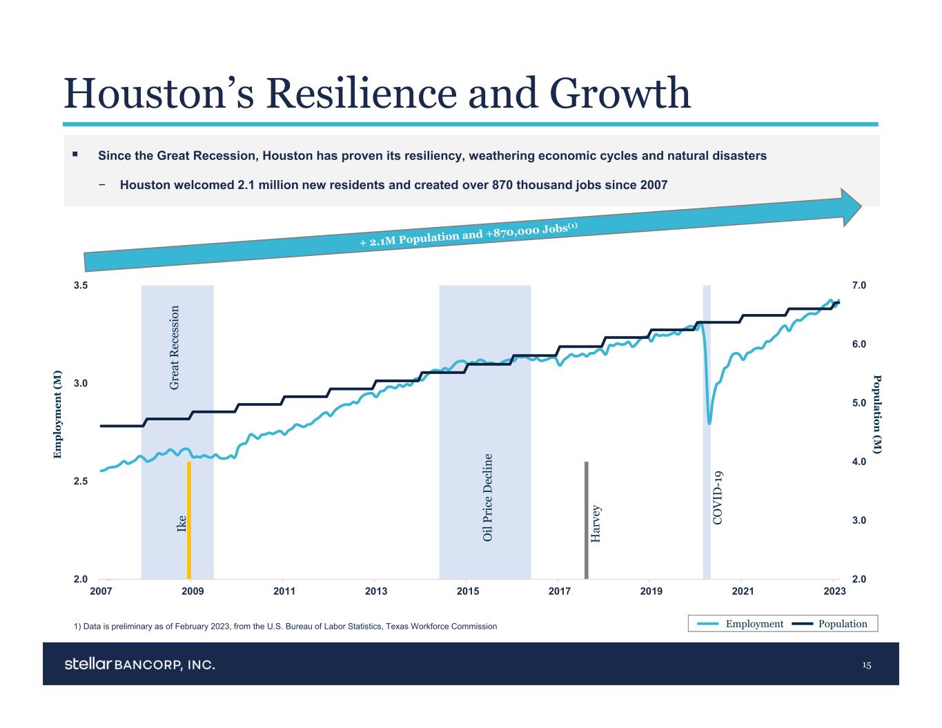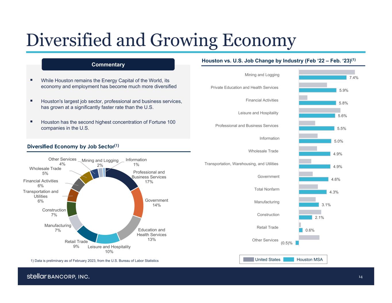 4.8% 4.1% 2.1% Houston MSA Texas USA 34.3 29.7 14.1 11.9 9.5 8.4 8.0 7.6 6.8 JP Morgan Wells Fargo BofA Zions PNC Stellar Frost Capital One Cadence Prosperity Diverse and Strong Markets 13 Houston is Diverse, with Significant Economic TailwindsGreater Houston Market  Houston is the #1 most diverse city in the U.S. based on socioeconomic factors, according to Wallet Hub  26th largest economy in the world – if ranked as a country − 15th largest population in the U.S – if ranked as a state  Port of Houston is the largest Gulf Coast container port, handling 70% of U.S. Gulf Coast container traffic  Houston is home to the Texas Medical Center, which has 10 million annual patient encounters  Business friendly: #3 among U.S. metro areas in Fortune 500 headquarters (24)  Major business clusters in Beaumont-Port Arthur area include chemical and petroleum manufacturing, materials manufacturing and transportation Top 10 Bank by Deposits in Houston Region(1)(2) ($B) 1) Houston Region defined as the Houston-The Woodlands-Sugar Land and Beaumont-Port Arthur MSAs; Excludes non-retail branches. 2) Stellar’s deposits reflect proforma combined deposits $188 Est. Population Growth ’23-’28 Est. Number of Households Growth ’23-’28 5.0% 4.4% 2.4% Houston MSA Texas USA Population Change (’18-’23) Median Household Income (’23) Significant Deposit Share Houston MSA: 5.5% Texas: 5.4% / U.S: 2.4% Houston MSA: $74,325 Texas: $71,347 / U.S: $73,503 Stellar has over $9.5 billion in deposits in the Houston region(1) Houston HQ Bank Source: S&P Capital IQ Pro, Houston.org, Texas Medical Center and Wallet Hub Note: deposit market share based on FDIC data as of June 30, 2022.
