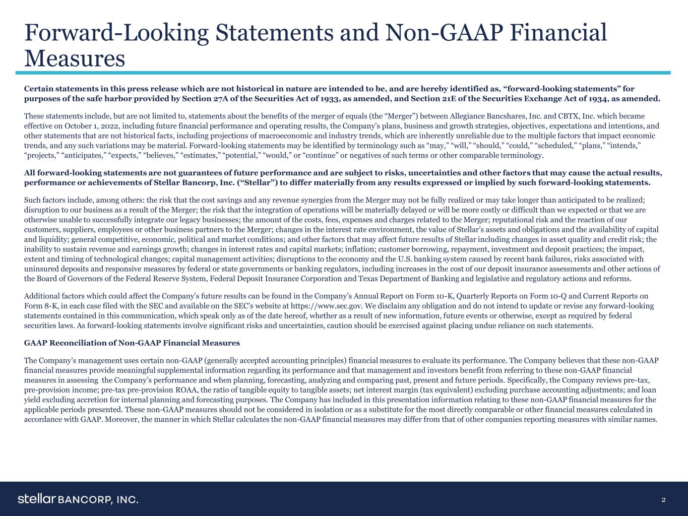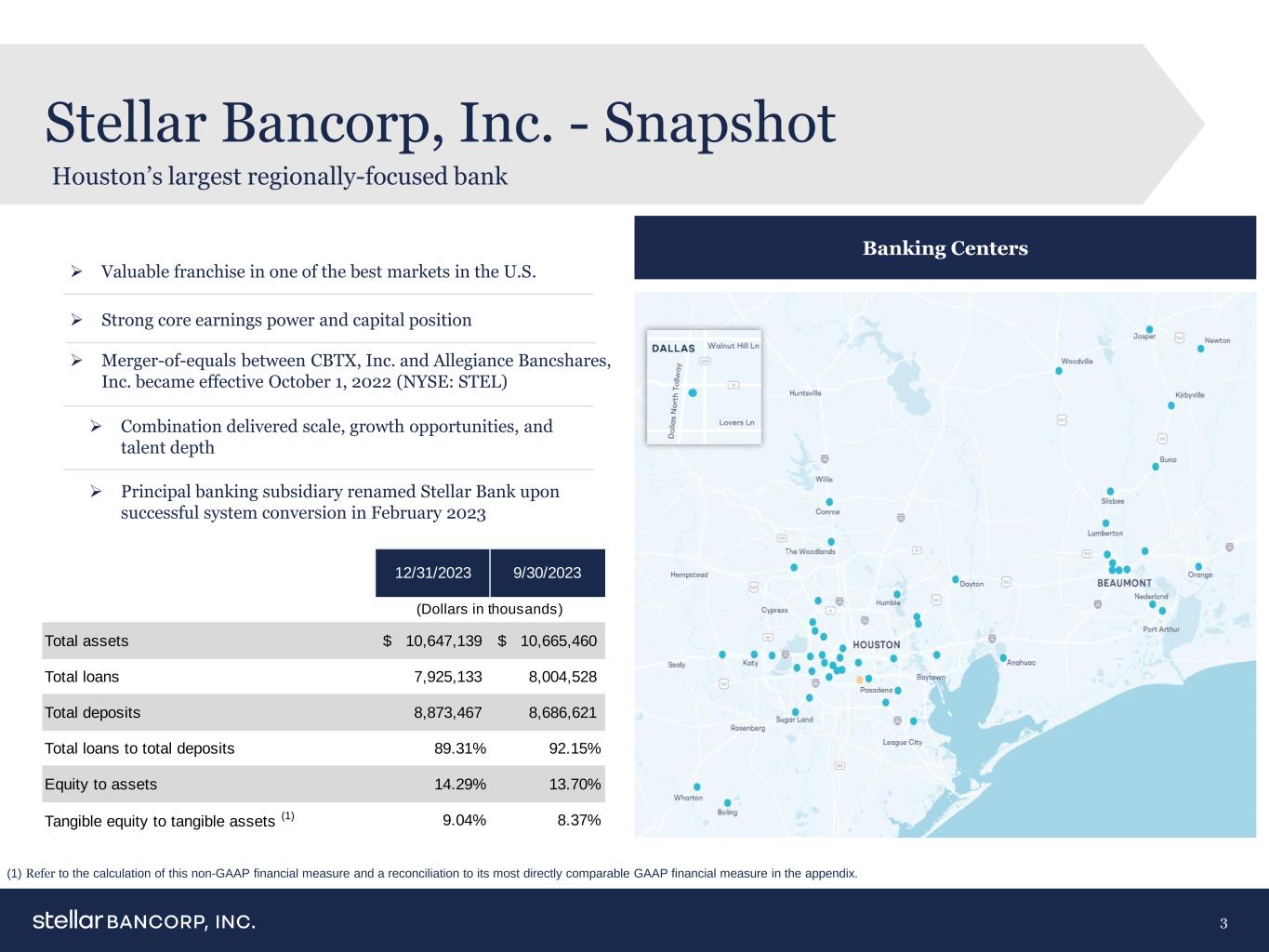 Forward-Looking Statements and Non-GAAP Financial Measures 2 Certain statements in this press release which are not historical in nature are intended to be, and are hereby identified as, “forward-looking statements” for purposes of the safe harbor provided by Section 27A of the Securities Act of 1933, as amended, and Section 21E of the Securities Exchange Act of 1934, as amended. These statements include, but are not limited to, statements about the benefits of the merger of equals (the “Merger”) between Allegiance Bancshares, Inc. and CBTX, Inc. which became effective on October 1, 2022, including future financial performance and operating results, the Company’s plans, business and growth strategies, objectives, expectations and intentions, and other statements that are not historical facts, including projections of macroeconomic and industry trends, which are inherently unreliable due to the multiple factors that impact economic trends, and any such variations may be material. Forward-looking statements may be identified by terminology such as “may,” “will,” “should,” “could,” “scheduled,” “plans,” “intends,” “projects,” “anticipates,” “expects,” “believes,” “estimates,” “potential,” “would,” or “continue” or negatives of such terms or other comparable terminology. All forward-looking statements are not guarantees of future performance and are subject to risks, uncertainties and other factors that may cause the actual results, performance or achievements of Stellar Bancorp, Inc. (“Stellar”) to differ materially from any results expressed or implied by such forward-looking statements. Such factors include, among others: the risk that the cost savings and any revenue synergies from the Merger may not be fully realized or may take longer than anticipated to be realized; disruption to our business as a result of the Merger; the risk that the integration of operations will be materially delayed or will be more costly or difficult than we expected or that we are otherwise unable to successfully integrate our legacy businesses; the amount of the costs, fees, expenses and charges related to the Merger; reputational risk and the reaction of our customers, suppliers, employees or other business partners to the Merger; changes in the interest rate environment, the value of Stellar’s assets and obligations and the availability of capital and liquidity; general competitive, economic, political and market conditions; and other factors that may affect future results of Stellar including changes in asset quality and credit risk; the inability to sustain revenue and earnings growth; changes in interest rates and capital markets; inflation; customer borrowing, repayment, investment and deposit practices; the impact, extent and timing of technological changes; capital management activities; disruptions to the economy and the U.S. banking system caused by recent bank failures, risks associated with uninsured deposits and responsive measures by federal or state governments or banking regulators, including increases in the cost of our deposit insurance assessments and other actions of the Board of Governors of the Federal Reserve System, Federal Deposit Insurance Corporation and Texas Department of Banking and legislative and regulatory actions and reforms. Additional factors which could affect the Company’s future results can be found in the Company’s Annual Report on Form 10-K, Quarterly Reports on Form 10-Q and Current Reports on Form 8-K, in each case filed with the SEC and available on the SEC’s website at https://www.sec.gov. We disclaim any obligation and do not intend to update or revise any forward-looking statements contained in this communication, which speak only as of the date hereof, whether as a result of new information, future events or otherwise, except as required by federal securities laws. As forward-looking statements involve significant risks and uncertainties, caution should be exercised against placing undue reliance on such statements. GAAP Reconciliation of Non-GAAP Financial Measures The Company’s management uses certain non-GAAP (generally accepted accounting principles) financial measures to evaluate its performance. The Company believes that these non-GAAP financial measures provide meaningful supplemental information regarding its performance and that management and investors benefit from referring to these non-GAAP financial measures in assessing the Company’s performance and when planning, forecasting, analyzing and comparing past, present and future periods. Specifically, the Company reviews pre-tax, pre-provision income; pre-tax pre-provision ROAA, the ratio of tangible equity to tangible assets; net interest margin (tax equivalent) excluding purchase accounting adjustments; and loan yield excluding accretion for internal planning and forecasting purposes. The Company has included in this presentation information relating to these non-GAAP financial measures for the applicable periods presented. These non-GAAP measures should not be considered in isolation or as a substitute for the most directly comparable or other financial measures calculated in accordance with GAAP. Moreover, the manner in which Stellar calculates the non-GAAP financial measures may differ from that of other companies reporting measures with similar names.