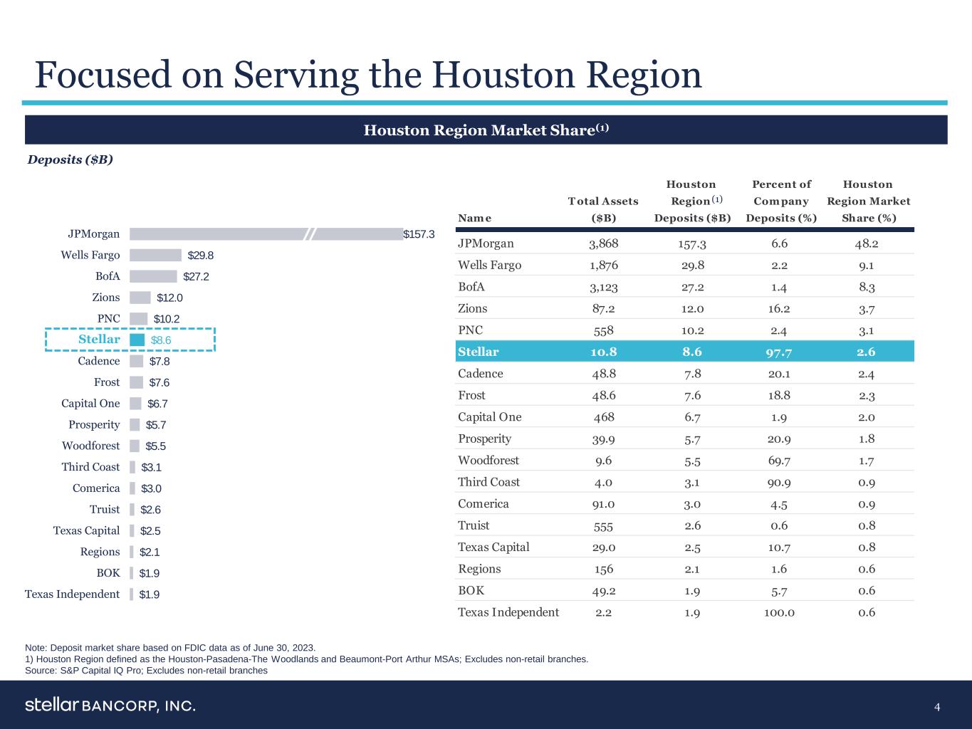 3 (1) Refer to the calculation of this non-GAAP financial measure and a reconciliation to its most directly comparable GAAP financial measure in the appendix. Stellar Bancorp, Inc. - Snapshot Houston’s largest regionally-focused bank  Principal banking subsidiary renamed Stellar Bank upon successful system conversion in February 2023  Combination delivered scale, growth opportunities, and talent depth  Merger-of-equals between CBTX, Inc. and Allegiance Bancshares, Inc. became effective October 1, 2022 (NYSE: STEL)  Valuable franchise in one of the best markets in the U.S. 12/31/2023 9/30/2023 Total assets 10,647,139$ 10,665,460$ Total loans 7,925,133 8,004,528 Total deposits 8,873,467 8,686,621 Total loans to total deposits 89.31% 92.15% Equity to assets 14.29% 13.70% Tangible equity to tangible assets (1) 9.04% 8.37% (Dollars in thousands) Banking Centers  Strong core earnings power and capital position