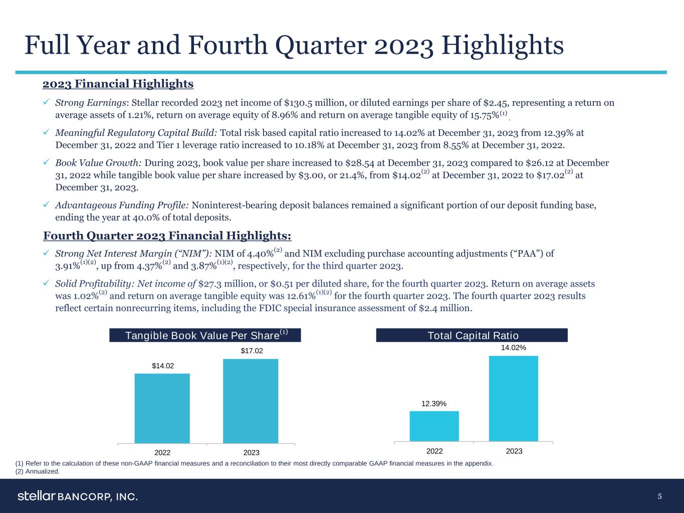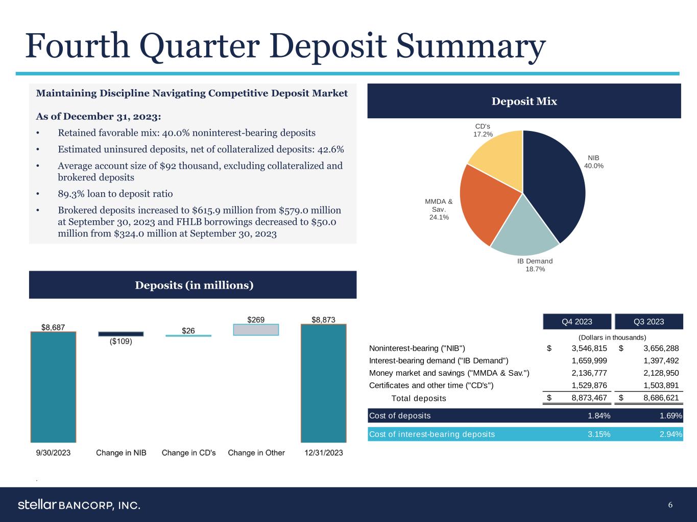 5 Full Year and Fourth Quarter 2023 Highlights (1) Refer to the calculation of these non-GAAP financial measures and a reconciliation to their most directly comparable GAAP financial measures in the appendix. (2) Annualized.  Strong Net Interest Margin (“NIM”): NIM of 4.40% (2) and NIM excluding purchase accounting adjustments (“PAA”) of 3.91% (1)(2) , up from 4.37% (2) and 3.87% (1)(2) , respectively, for the third quarter 2023.  Solid Profitability: Net income of $27.3 million, or $0.51 per diluted share, for the fourth quarter 2023. Return on average assets was 1.02% (2) and return on average tangible equity was 12.61% (1)(2) for the fourth quarter 2023. The fourth quarter 2023 results reflect certain nonrecurring items, including the FDIC special insurance assessment of $2.4 million. Fourth Quarter 2023 Financial Highlights:  Strong Earnings: Stellar recorded 2023 net income of $130.5 million, or diluted earnings per share of $2.45, representing a return on average assets of 1.21%, return on average equity of 8.96% and return on average tangible equity of 15.75%(1) .  Meaningful Regulatory Capital Build: Total risk based capital ratio increased to 14.02% at December 31, 2023 from 12.39% at December 31, 2022 and Tier 1 leverage ratio increased to 10.18% at December 31, 2023 from 8.55% at December 31, 2022.  Book Value Growth: During 2023, book value per share increased to $28.54 at December 31, 2023 compared to $26.12 at December 31, 2022 while tangible book value per share increased by $3.00, or 21.4%, from $14.02 (2) at December 31, 2022 to $17.02 (2) at December 31, 2023.  Advantageous Funding Profile: Noninterest-bearing deposit balances remained a significant portion of our deposit funding base, ending the year at 40.0% of total deposits. 2023 Financial Highlights Tangible Book Value Per Share (1) Total Capital Ratio 12.39% 14.02% 2022 2023 $14.02 $17.02 2022 2023