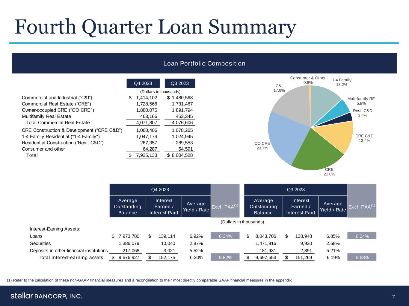 Fourth Quarter Deposit Summary 6 Deposit Mix Deposits (in millions) Maintaining Discipline Navigating Competitive Deposit Market As of December 31, 2023: • Retained favorable mix: 40.0% noninterest-bearing deposits • Estimated uninsured deposits, net of collateralized deposits: 42.6% • Average account size of $92 thousand, excluding collateralized and brokered deposits • 89.3% loan to deposit ratio • Brokered deposits increased to $615.9 million from $579.0 million at September 30, 2023 and FHLB borrowings decreased to $50.0 million from $324.0 million at September 30, 2023 . (1) NIB 40.0% IB Demand 18.7% MMDA & Sav. 24.1% CD's 17.2% Q4 2023 Q3 2023 Noninterest-bearing ("NIB") 3,546,815$ 3,656,288$ Interest-bearing demand ("IB Demand") 1,659,999 1,397,492 Money market and savings ("MMDA & Sav.") 2,136,777 2,128,950 Certificates and other time ("CD's") 1,529,876 1,503,891 Total deposits 8,873,467$ 8,686,621$ Cost of deposits 1.84% 1.69% Cost of interest-bearing deposits 3.15% 2.94% (Dollars in thousands)