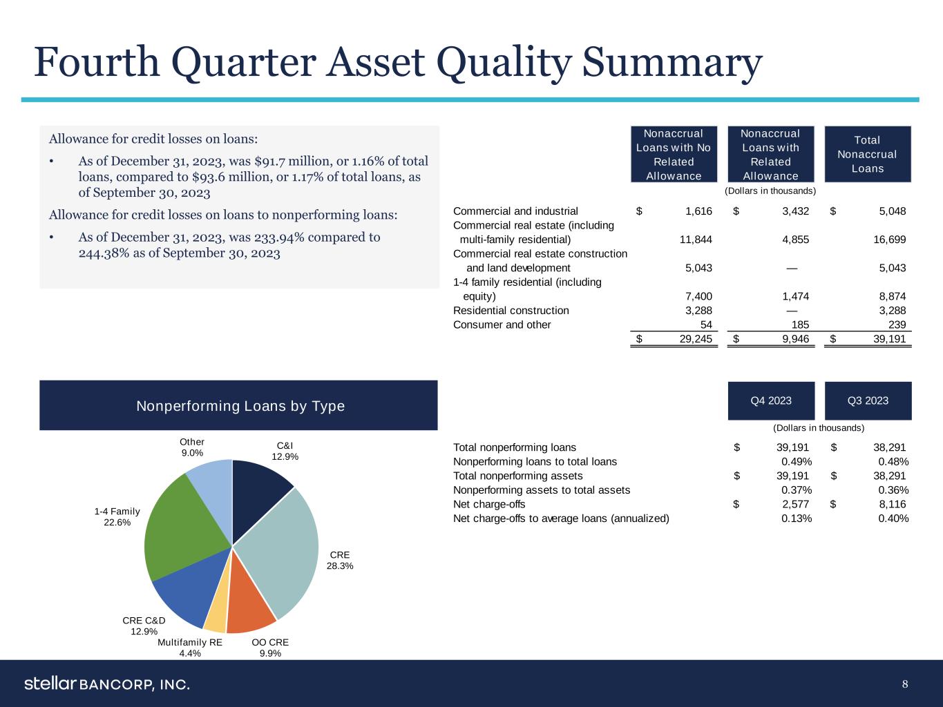 Fourth Quarter Loan Summary 7 (1) Refer to the calculation of these non-GAAP financial measures and a reconciliation to their most directly comparable GAAP financial measures in the appendix. . Loan Portfolio Composition (1) (1) 1-4 Family 13.2% Multifamily RE 5.8% Resi. C&D 3.4% CRE C&D 13.4% CRE 21.8% OO CRE 23.7% C&I 17.9% Consumer & Other 0.8%Q4 2023 Q3 2023 Commercial and Industrial (“C&I”) 1,414,102$ 1,480,568$ Commercial Real Estate (“CRE”) 1,728,566 1,731,467 Owner-occupied CRE (“OO CRE") 1,880,075 1,891,794 Multifamily Real Estate 463,166 453,345 Total Commercial Real Estate 4,071,807 4,076,606 CRE Construction & Development (“CRE C&D”) 1,060,406 1,078,265 1-4 Family Residential ("1-4 Family") 1,047,174 1,024,945 Residential Construction (“Resi. C&D”) 267,357 289,553 Consumer and other 64,287 54,591 Total 7,925,133$ 8,004,528$ (Dollars in thousands) Average Yield / Rate Excl. PAA(1) Average Yield / Rate Excl. PAA(1) Interest-Earning Assets: Loans 7,973,780$ 139,114$ 6.92% 6.34% 8,043,706$ 138,948$ 6.85% 6.24% Securities 1,386,079 10,040 2.87% 1,471,916 9,930 2.68% Deposits in other financial institutions 217,068 3,021 5.52% 181,931 2,391 5.21% Total interest-earning assets 9,576,927$ 152,175$ 6.30% 5.82% 9,697,553$ 151,269$ 6.19% 5.68% (Dollars in thousands) Q4 2023 Q3 2023 Average Outstanding Balance Interest Earned / Interest Paid Average Outstanding Balance Interest Earned / Interest Paid