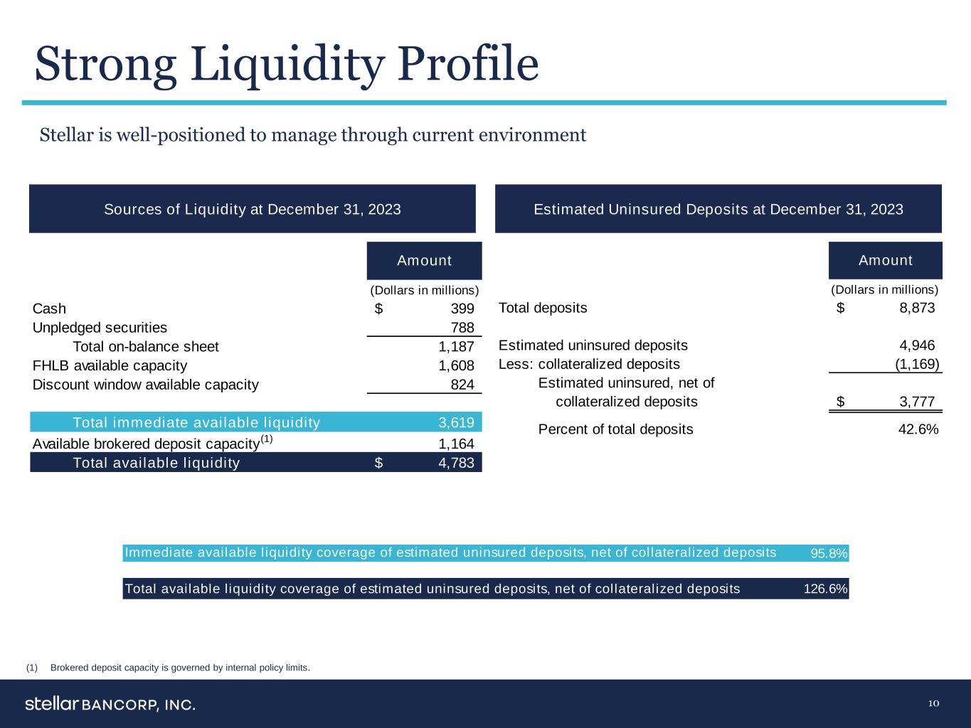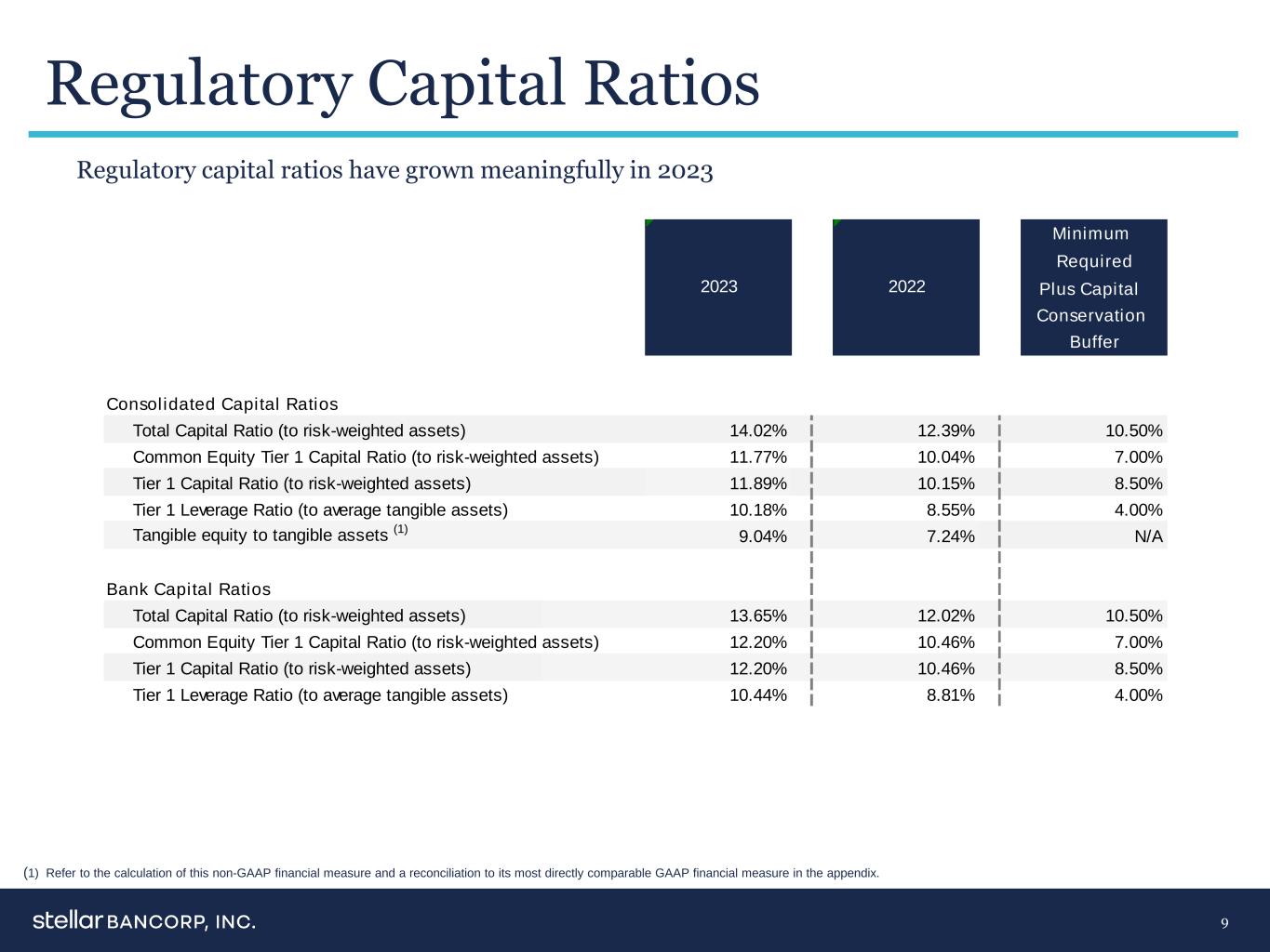 Regulatory Capital Ratios 9 (1) Refer to the calculation of this non-GAAP financial measure and a reconciliation to its most directly comparable GAAP financial measure in the appendix. Regulatory capital ratios have grown meaningfully in 2023 Minimum Required Plus Capital Conservation Buffer Consolidated Capital Ratios Total Capital Ratio (to risk-weighted assets) 14.02% 12.39% 10.50% Common Equity Tier 1 Capital Ratio (to risk-weighted assets) 11.77% 10.04% 7.00% Tier 1 Capital Ratio (to risk-weighted assets) 11.89% 10.15% 8.50% Tier 1 Leverage Ratio (to average tangible assets) 10.18% 8.55% 4.00% Tangible equity to tangible assets (1) 9.04% 7.24% N/A Bank Capital Ratios Total Capital Ratio (to risk-weighted assets) 13.65% 12.02% 10.50% Common Equity Tier 1 Capital Ratio (to risk-weighted assets) 12.20% 10.46% 7.00% Tier 1 Capital Ratio (to risk-weighted assets) 12.20% 10.46% 8.50% Tier 1 Leverage Ratio (to average tangible assets) 10.44% 8.81% 4.00% 2023 2022