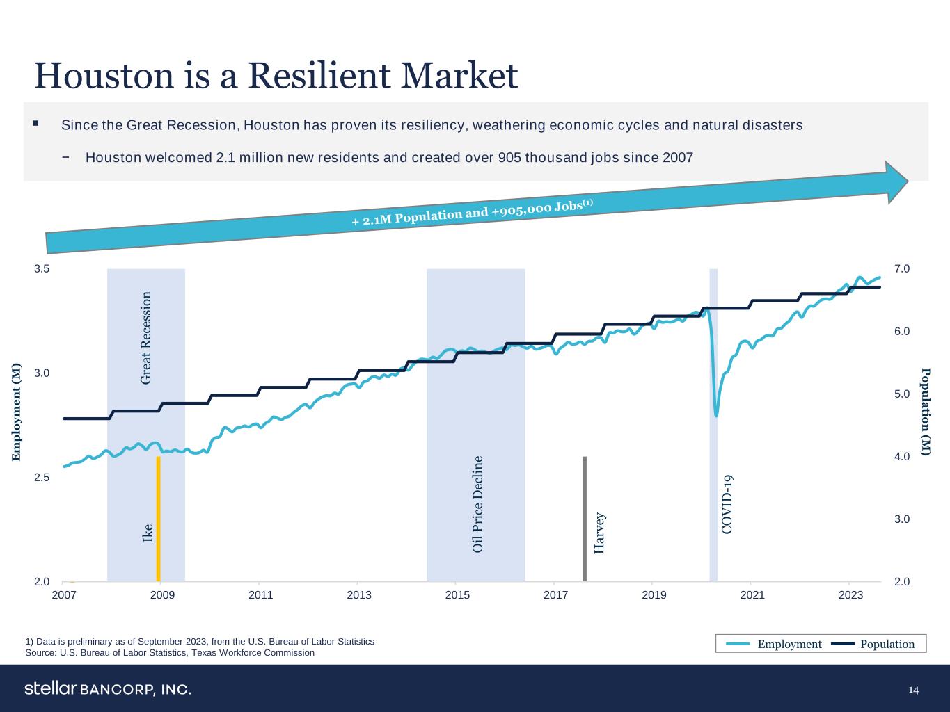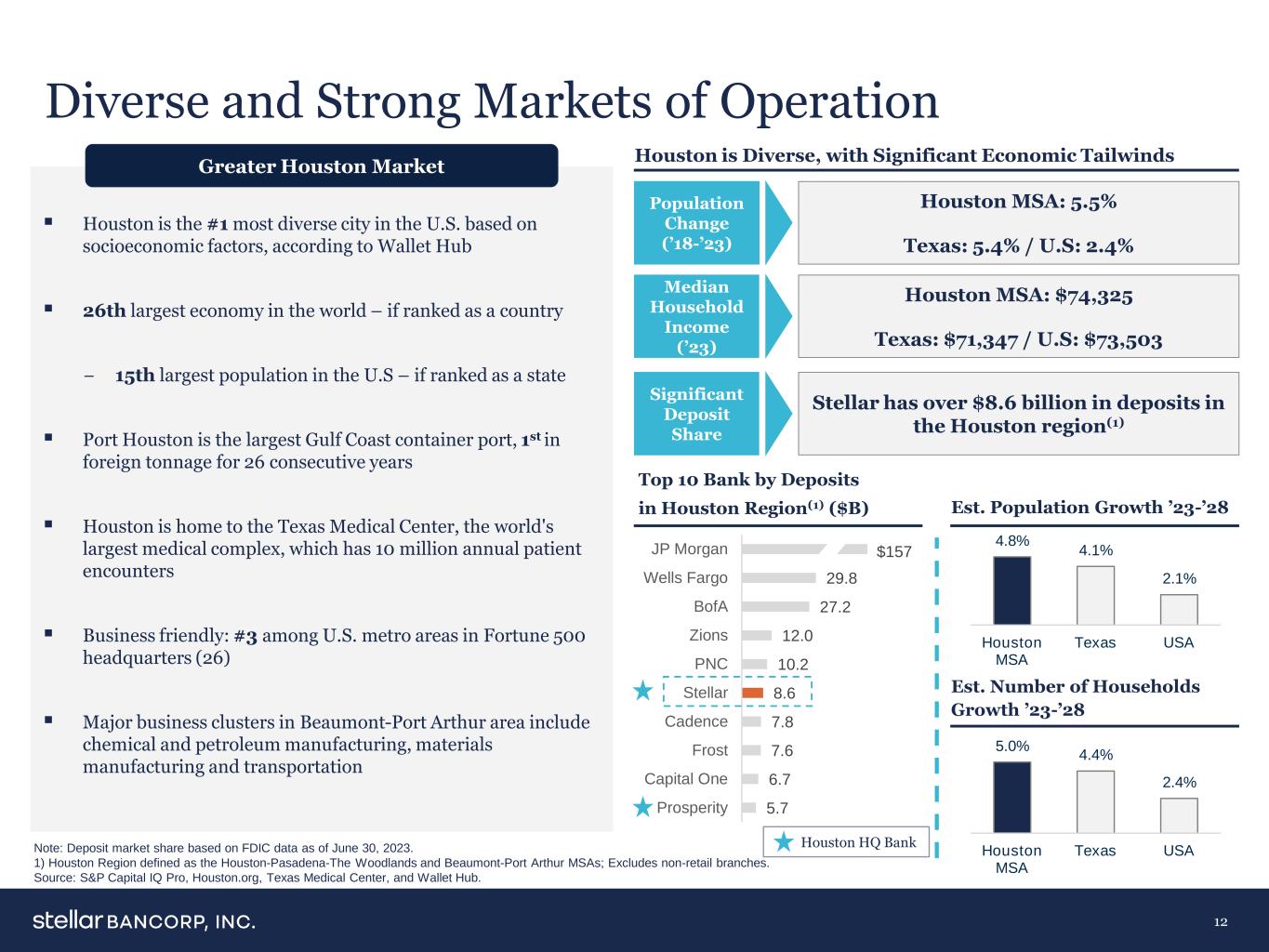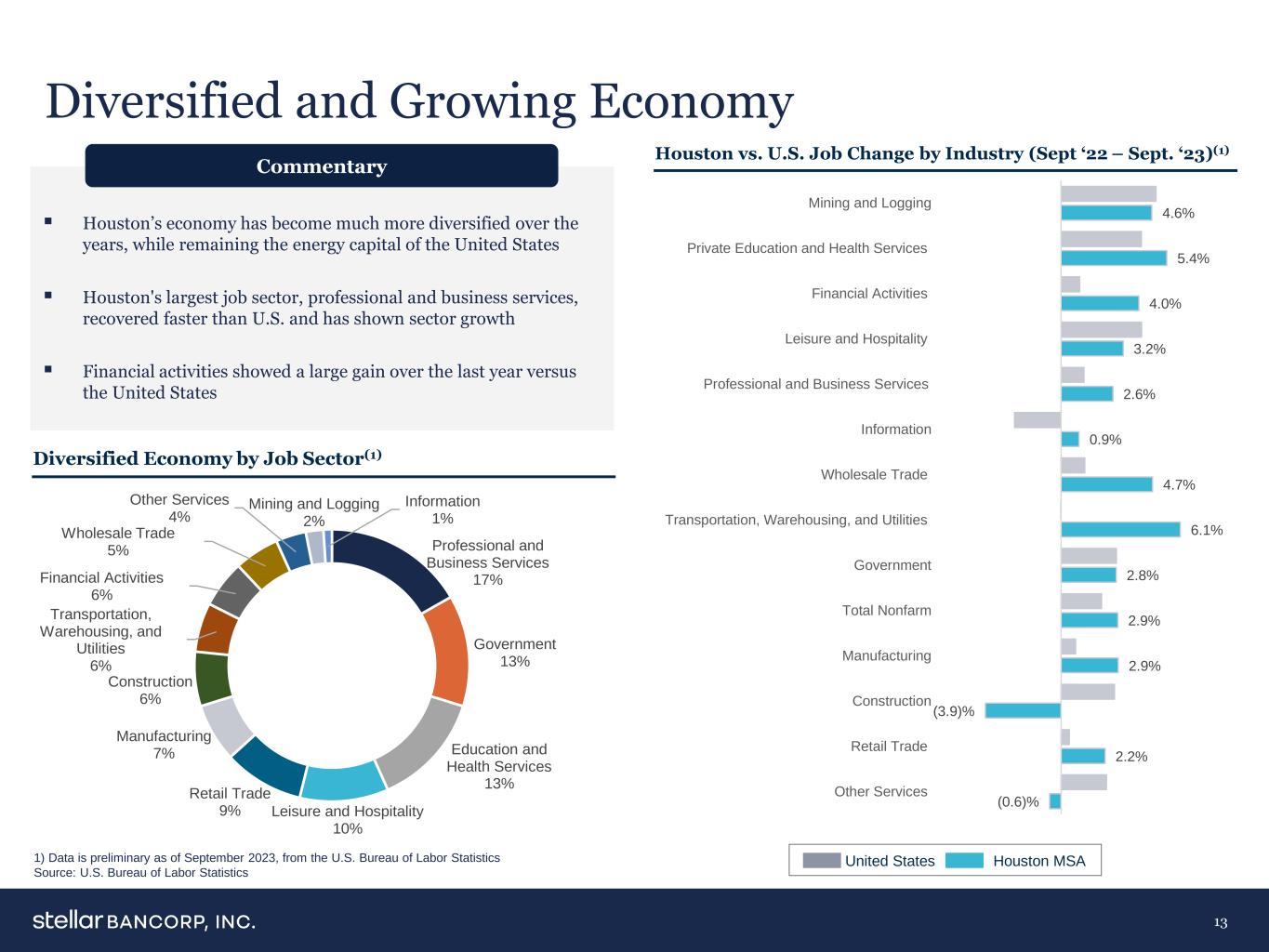 4.8% 4.1% 2.1% Houston MSA Texas USA 5.0% 4.4% 2.4% Houston MSA Texas USA 29.8 27.2 12.0 10.2 8.6 7.8 7.6 6.7 5.7 JP Morgan Wells Fargo BofA Zions PNC Stellar Cadence Frost Capital One Prosperity Diverse and Strong Markets of Operation 12 Houston is Diverse, with Significant Economic Tailwinds Greater Houston Market  Houston is the #1 most diverse city in the U.S. based on socioeconomic factors, according to Wallet Hub  26th largest economy in the world – if ranked as a country − 15th largest population in the U.S – if ranked as a state  Port Houston is the largest Gulf Coast container port, 1st in foreign tonnage for 26 consecutive years  Houston is home to the Texas Medical Center, the world's largest medical complex, which has 10 million annual patient encounters  Business friendly: #3 among U.S. metro areas in Fortune 500 headquarters (26)  Major business clusters in Beaumont-Port Arthur area include chemical and petroleum manufacturing, materials manufacturing and transportation Top 10 Bank by Deposits in Houston Region(1) ($B) Note: Deposit market share based on FDIC data as of June 30, 2023. 1) Houston Region defined as the Houston-Pasadena-The Woodlands and Beaumont-Port Arthur MSAs; Excludes non-retail branches. Source: S&P Capital IQ Pro, Houston.org, Texas Medical Center, and Wallet Hub. $157 Est. Population Growth ’23-’28 Est. Number of Households Growth ’23-’28 Population Change (’18-’23) Median Household Income (’23) Significant Deposit Share Houston MSA: 5.5% Texas: 5.4% / U.S: 2.4% Houston MSA: $74,325 Texas: $71,347 / U.S: $73,503 Stellar has over $8.6 billion in deposits in the Houston region(1) Houston HQ Bank