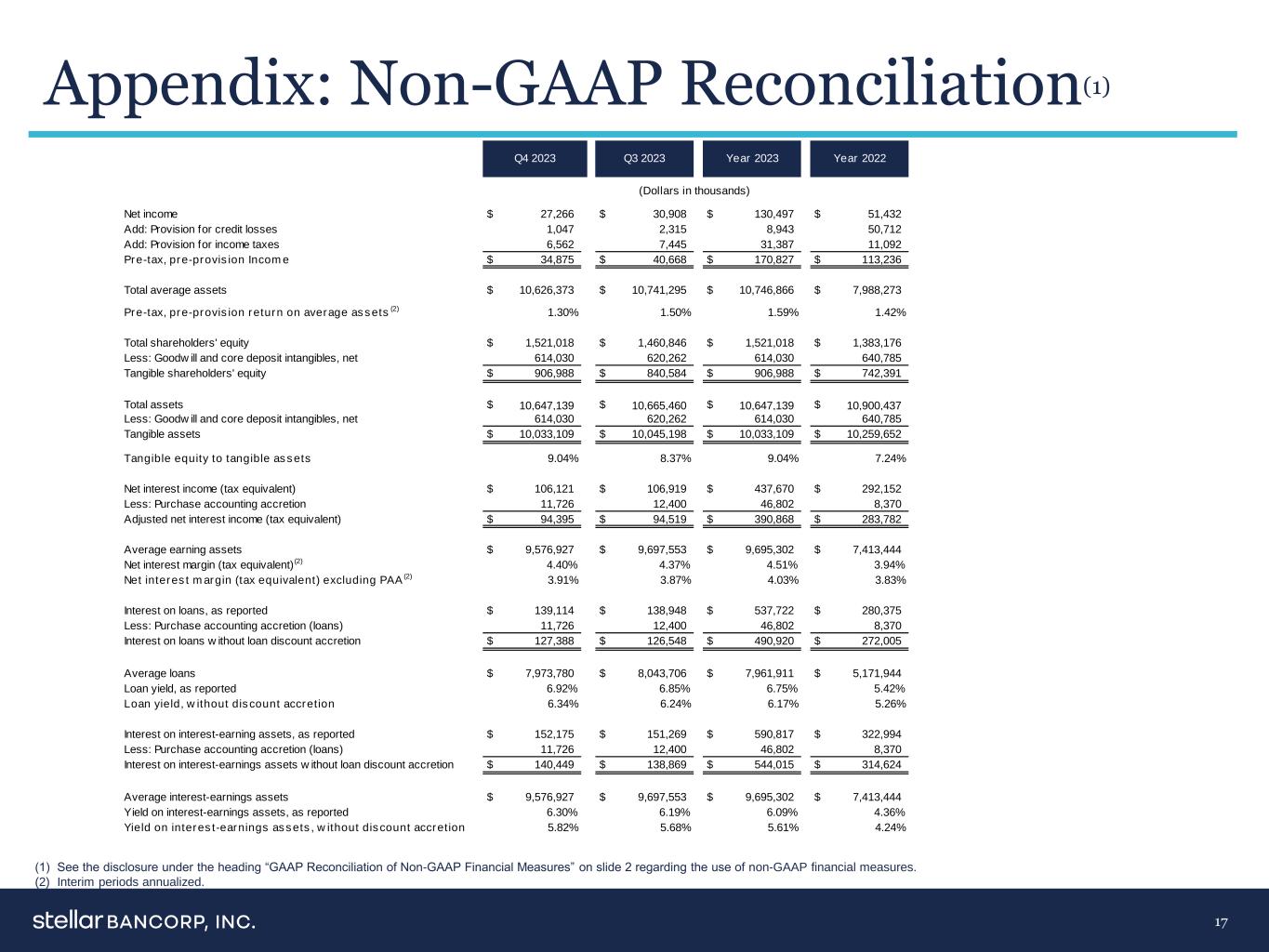 Appendix: Non-GAAP Reconciliation(1) 17 (1) See the disclosure under the heading “GAAP Reconciliation of Non-GAAP Financial Measures” on slide 2 regarding the use of non-GAAP financial measures. (2) Interim periods annualized. Net income $ 27,266 $ 30,908 $ 130,497 $ 51,432 Add: Provision for credit losses 1,047 2,315 8,943 50,712 Add: Provision for income taxes 6,562 7,445 31,387 11,092 Pre-tax, pre-provision Income $ 34,875 $ 40,668 $ 170,827 $ 113,236 Total average assets $ 10,626,373 $ 10,741,295 $ 10,746,866 $ 7,988,273 Pre-tax, pre-provision return on average assets (2) 1.30% 1.50% 1.59% 1.42% Total shareholders' equity $ 1,521,018 $ 1,460,846 $ 1,521,018 $ 1,383,176 Less: Goodw ill and core deposit intangibles, net 614,030 620,262 614,030 640,785 Tangible shareholders' equity $ 906,988 $ 840,584 $ 906,988 $ 742,391 Total assets $ 10,647,139 $ 10,665,460 $ 10,647,139 $ 10,900,437 Less: Goodw ill and core deposit intangibles, net 614,030 620,262 614,030 640,785 Tangible assets $ 10,033,109 $ 10,045,198 $ 10,033,109 $ 10,259,652 Tangible equity to tangible assets 9.04% 8.37% 9.04% 7.24% Net interest income (tax equivalent) $ 106,121 $ 106,919 $ 437,670 $ 292,152 Less: Purchase accounting accretion 11,726 12,400 46,802 8,370 Adjusted net interest income (tax equivalent) $ 94,395 $ 94,519 $ 390,868 $ 283,782 Average earning assets $ 9,576,927 $ 9,697,553 $ 9,695,302 $ 7,413,444 Net interest margin (tax equivalent)(2) 4.40% 4.37% 4.51% 3.94% Net interest margin (tax equivalent) excluding PAA (2) 3.91% 3.87% 4.03% 3.83% Interest on loans, as reported $ 139,114 $ 138,948 $ 537,722 $ 280,375 Less: Purchase accounting accretion (loans) 11,726 12,400 46,802 8,370 Interest on loans w ithout loan discount accretion $ 127,388 $ 126,548 $ 490,920 $ 272,005 Average loans $ 7,973,780 $ 8,043,706 $ 7,961,911 $ 5,171,944 Loan yield, as reported 6.92% 6.85% 6.75% 5.42% Loan yield, w ithout discount accretion 6.34% 6.24% 6.17% 5.26% Interest on interest-earning assets, as reported $ 152,175 $ 151,269 $ 590,817 $ 322,994 Less: Purchase accounting accretion (loans) 11,726 12,400 46,802 8,370 Interest on interest-earnings assets w ithout loan discount accretion $ 140,449 $ 138,869 $ 544,015 $ 314,624 Average interest-earnings assets $ 9,576,927 $ 9,697,553 $ 9,695,302 $ 7,413,444 Yield on interest-earnings assets, as reported 6.30% 6.19% 6.09% 4.36% Yield on interest-earnings assets, w ithout discount accretion 5.82% 5.68% 5.61% 4.24% Year 2022 (Dollars in thousands) Q4 2023 Q3 2023 Year 2023