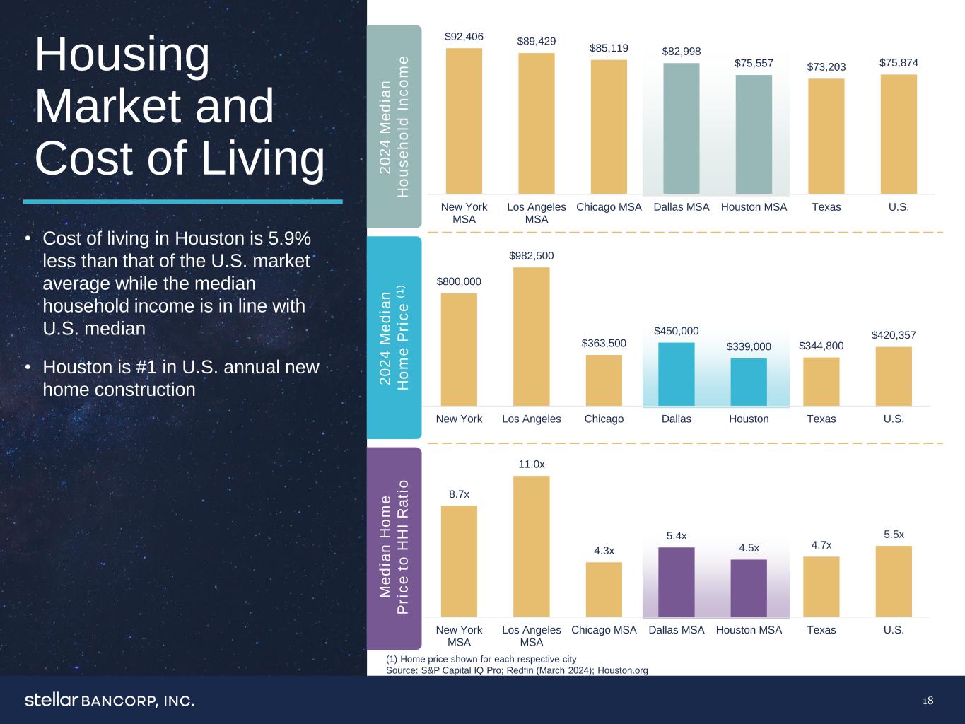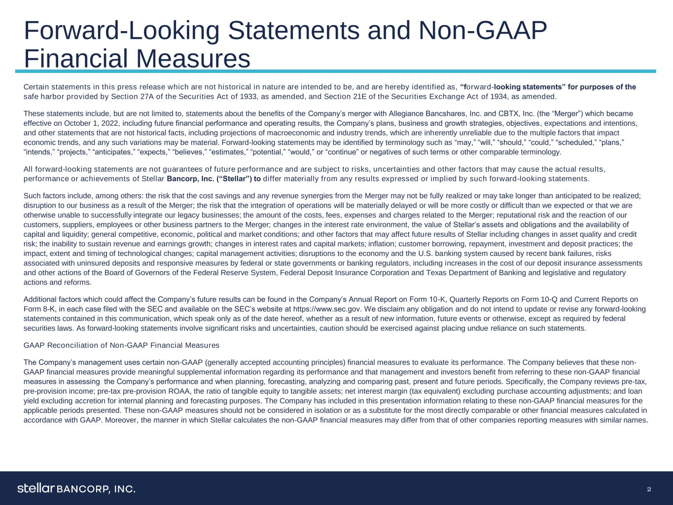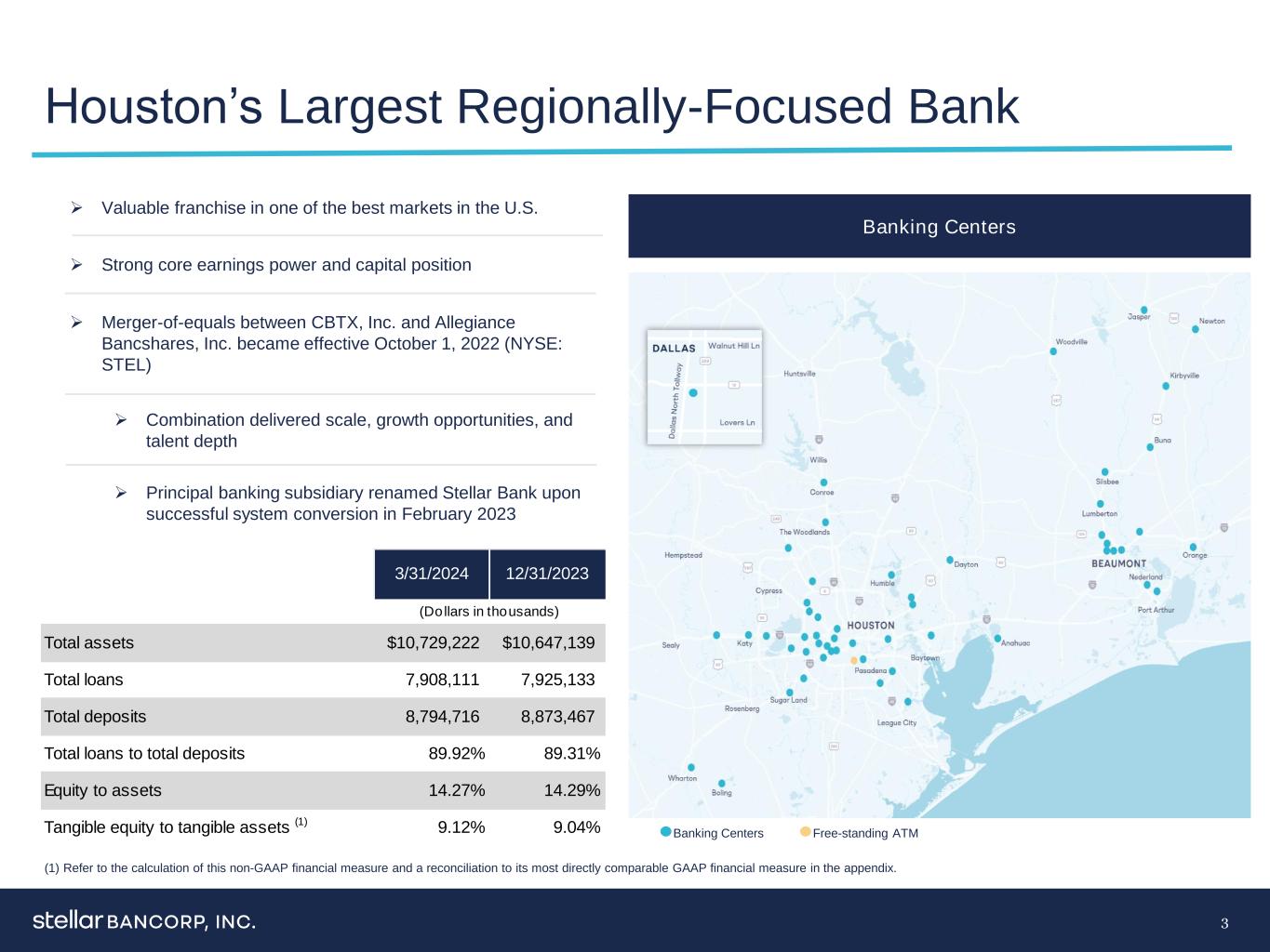 Forward-Looking Statements and Non-GAAP Financial Measures 2 Certain statements in this press release which are not historical in nature are intended to be, and are hereby identified as, “forward-looking statements” for purposes of the safe harbor provided by Section 27A of the Securities Act of 1933, as amended, and Section 21E of the Securities Exchange Act of 1934, as amended. These statements include, but are not limited to, statements about the benefits of the Company’s merger with Allegiance Bancshares, Inc. and CBTX, Inc. (the “Merger”) which became effective on October 1, 2022, including future financial performance and operating results, the Company’s plans, business and growth strategies, objectives, expectations and intentions, and other statements that are not historical facts, including projections of macroeconomic and industry trends, which are inherently unreliable due to the multiple factors that impact economic trends, and any such variations may be material. Forward-looking statements may be identified by terminology such as “may,” “will,” “should,” “could,” “scheduled,” “plans,” “intends,” “projects,” “anticipates,” “expects,” “believes,” “estimates,” “potential,” “would,” or “continue” or negatives of such terms or other comparable terminology. All forward-looking statements are not guarantees of future performance and are subject to risks, uncertainties and other factors that may cause the actual results, performance or achievements of Stellar Bancorp, Inc. (“Stellar”) to differ materially from any results expressed or implied by such forward-looking statements. Such factors include, among others: the risk that the cost savings and any revenue synergies from the Merger may not be fully realized or may take longer than anticipated to be realized; disruption to our business as a result of the Merger; the risk that the integration of operations will be materially delayed or will be more costly or difficult than we expected or that we are otherwise unable to successfully integrate our legacy businesses; the amount of the costs, fees, expenses and charges related to the Merger; reputational risk and the reaction of our customers, suppliers, employees or other business partners to the Merger; changes in the interest rate environment, the value of Stellar’s assets and obligations and the availability of capital and liquidity; general competitive, economic, political and market conditions; and other factors that may affect future results of Stellar including changes in asset quality and credit risk; the inability to sustain revenue and earnings growth; changes in interest rates and capital markets; inflation; customer borrowing, repayment, investment and deposit practices; the impact, extent and timing of technological changes; capital management activities; disruptions to the economy and the U.S. banking system caused by recent bank failures, risks associated with uninsured deposits and responsive measures by federal or state governments or banking regulators, including increases in the cost of our deposit insurance assessments and other actions of the Board of Governors of the Federal Reserve System, Federal Deposit Insurance Corporation and Texas Department of Banking and legislative and regulatory actions and reforms. Additional factors which could affect the Company’s future results can be found in the Company’s Annual Report on Form 10-K, Quarterly Reports on Form 10-Q and Current Reports on Form 8-K, in each case filed with the SEC and available on the SEC’s website at https://www.sec.gov. We disclaim any obligation and do not intend to update or revise any forward-looking statements contained in this communication, which speak only as of the date hereof, whether as a result of new information, future events or otherwise, except as required by federal securities laws. As forward-looking statements involve significant risks and uncertainties, caution should be exercised against placing undue reliance on such statements. GAAP Reconciliation of Non-GAAP Financial Measures The Company’s management uses certain non-GAAP (generally accepted accounting principles) financial measures to evaluate its performance. The Company believes that these non- GAAP financial measures provide meaningful supplemental information regarding its performance and that management and investors benefit from referring to these non-GAAP financial measures in assessing the Company’s performance and when planning, forecasting, analyzing and comparing past, present and future periods. Specifically, the Company reviews pre-tax, pre-provision income; pre-tax pre-provision ROAA, the ratio of tangible equity to tangible assets; net interest margin (tax equivalent) excluding purchase accounting adjustments; and loan yield excluding accretion for internal planning and forecasting purposes. The Company has included in this presentation information relating to these non-GAAP financial measures for the applicable periods presented. These non-GAAP measures should not be considered in isolation or as a substitute for the most directly comparable or other financial measures calculated in accordance with GAAP. Moreover, the manner in which Stellar calculates the non-GAAP financial measures may differ from that of other companies reporting measures with similar names.