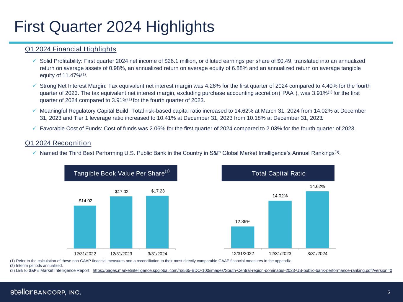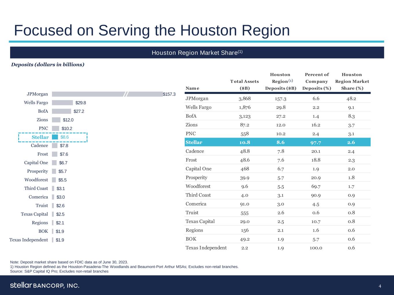 3 (1) Refer to the calculation of this non-GAAP financial measure and a reconciliation to its most directly comparable GAAP financial measure in the appendix. Houston’s Largest Regionally-Focused Bank  Principal banking subsidiary renamed Stellar Bank upon successful system conversion in February 2023  Combination delivered scale, growth opportunities, and talent depth  Merger-of-equals between CBTX, Inc. and Allegiance Bancshares, Inc. became effective October 1, 2022 (NYSE: STEL)  Valuable franchise in one of the best markets in the U.S. Banking Centers  Strong core earnings power and capital position 3/31/2024 12/31/2023 Total assets 10,729,222$ 10,647,139$ Total loans 7,908,111 7,925,133 Total deposits 8,794,716 8,873,467 Total loans to total deposits 89.92% 89.31% Equity to assets 14.27% 14.29% Tangible equity to tangible assets (1) 9.12% 9.04% (Dollars in thousands) Banking Centers Free-standing ATM