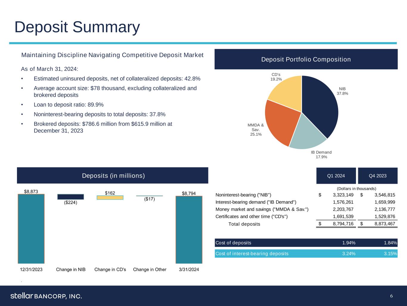 5 First Quarter 2024 Highlights (1) Refer to the calculation of these non-GAAP financial measures and a reconciliation to their most directly comparable GAAP financial measures in the appendix. (2) Interim periods annualized. (3) Link to S&P’s Market Intelligence Report: https://pages.marketintelligence.spglobal.com/rs/565-BDO-100/images/South-Central-region-dominates-2023-US-public-bank-performance-ranking.pdf?version=0  Solid Profitability: First quarter 2024 net income of $26.1 million, or diluted earnings per share of $0.49, translated into an annualized return on average assets of 0.98%, an annualized return on average equity of 6.88% and an annualized return on average tangible equity of 11.47%(1).  Strong Net Interest Margin: Tax equivalent net interest margin was 4.26% for the first quarter of 2024 compared to 4.40% for the fourth quarter of 2023. The tax equivalent net interest margin, excluding purchase accounting accretion (“PAA”), was 3.91%(1) for the first quarter of 2024 compared to 3.91%(1) for the fourth quarter of 2023.  Meaningful Regulatory Capital Build: Total risk-based capital ratio increased to 14.62% at March 31, 2024 from 14.02% at December 31, 2023 and Tier 1 leverage ratio increased to 10.41% at December 31, 2023 from 10.18% at December 31, 2023.  Favorable Cost of Funds: Cost of funds was 2.06% for the first quarter of 2024 compared to 2.03% for the fourth quarter of 2023. Q1 2024 Financial Highlights Tangible Book Value Per Share (1) Total Capital Ratio $14.02 $17.02 $17.23 12/31/2022 12/31/2023 3/31/2024 Q1 2024 Recognition  Named the Third Best Performing U.S. Public Bank in the Country in S&P Global Market Intelligence’s Annual Rankings(3). 12.39% 14.02% 14.62% 12/31/2022 12/31/2023 3/31/2024