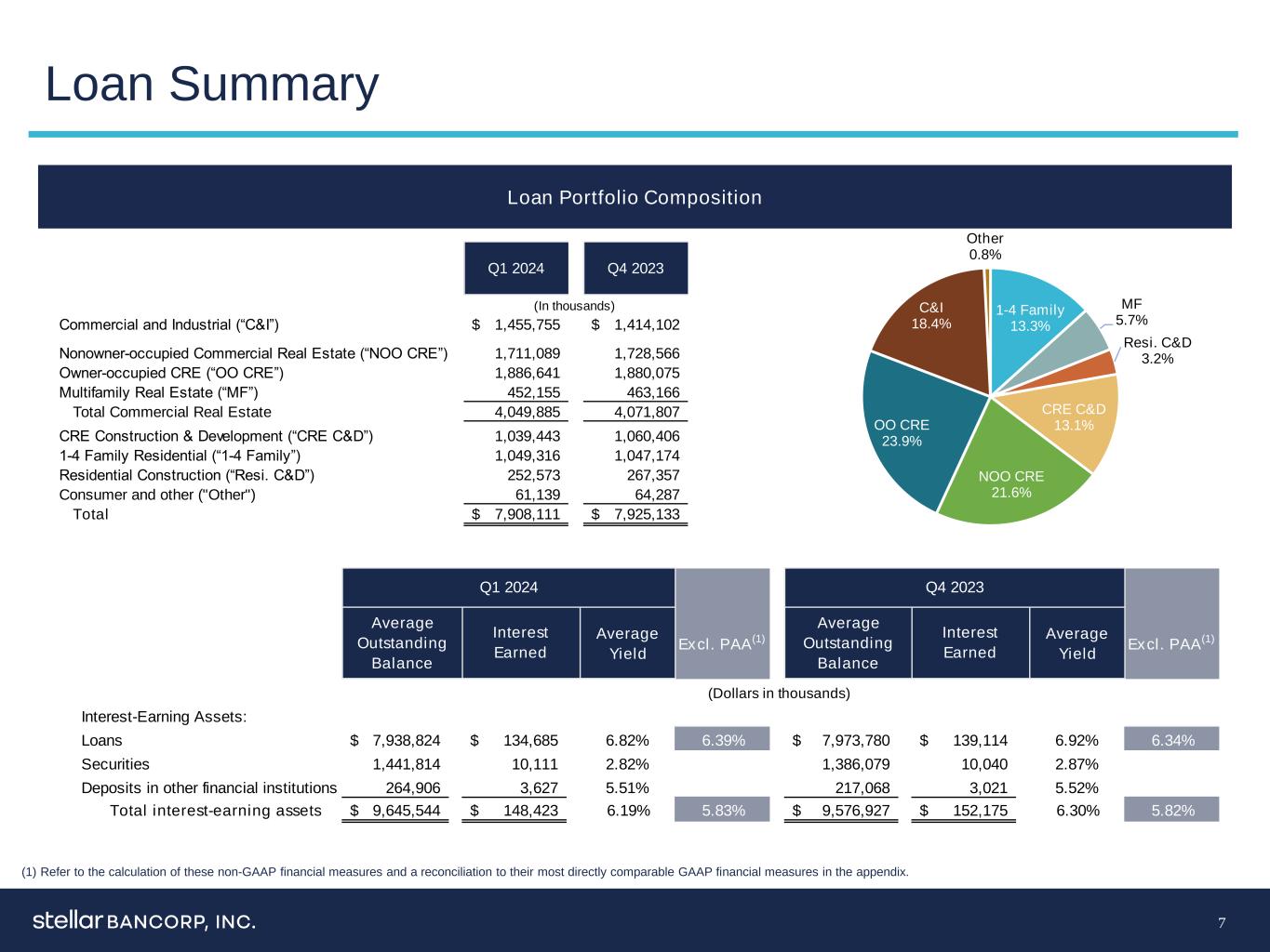 Deposit Summary 6 Deposit Portfolio Composition Deposits (in millions) Maintaining Discipline Navigating Competitive Deposit Market As of March 31, 2024: • Estimated uninsured deposits, net of collateralized deposits: 42.8% • Average account size: $78 thousand, excluding collateralized and brokered deposits • Loan to deposit ratio: 89.9% • Noninterest-bearing deposits to total deposits: 37.8% • Brokered deposits: $786.6 million from $615.9 million at December 31, 2023 . (1) NIB 37.8% IB Demand 17.9% MMDA & Sav. 25.1% CD's 19.2% Q1 2024 Q4 2023 Noninterest-bearing ("NIB") 3,323,149$ 3,546,815$ Interest-bearing demand ("IB Demand") 1,576,261 1,659,999 Money market and savings ("MMDA & Sav.") 2,203,767 2,136,777 Certificates and other time ("CD's") 1,691,539 1,529,876 Total deposits 8,794,716$ 8,873,467$ Cost of deposits 1.94% 1.84% Cost of interest-bearing deposits 3.24% 3.15% (Dollars in thousands)