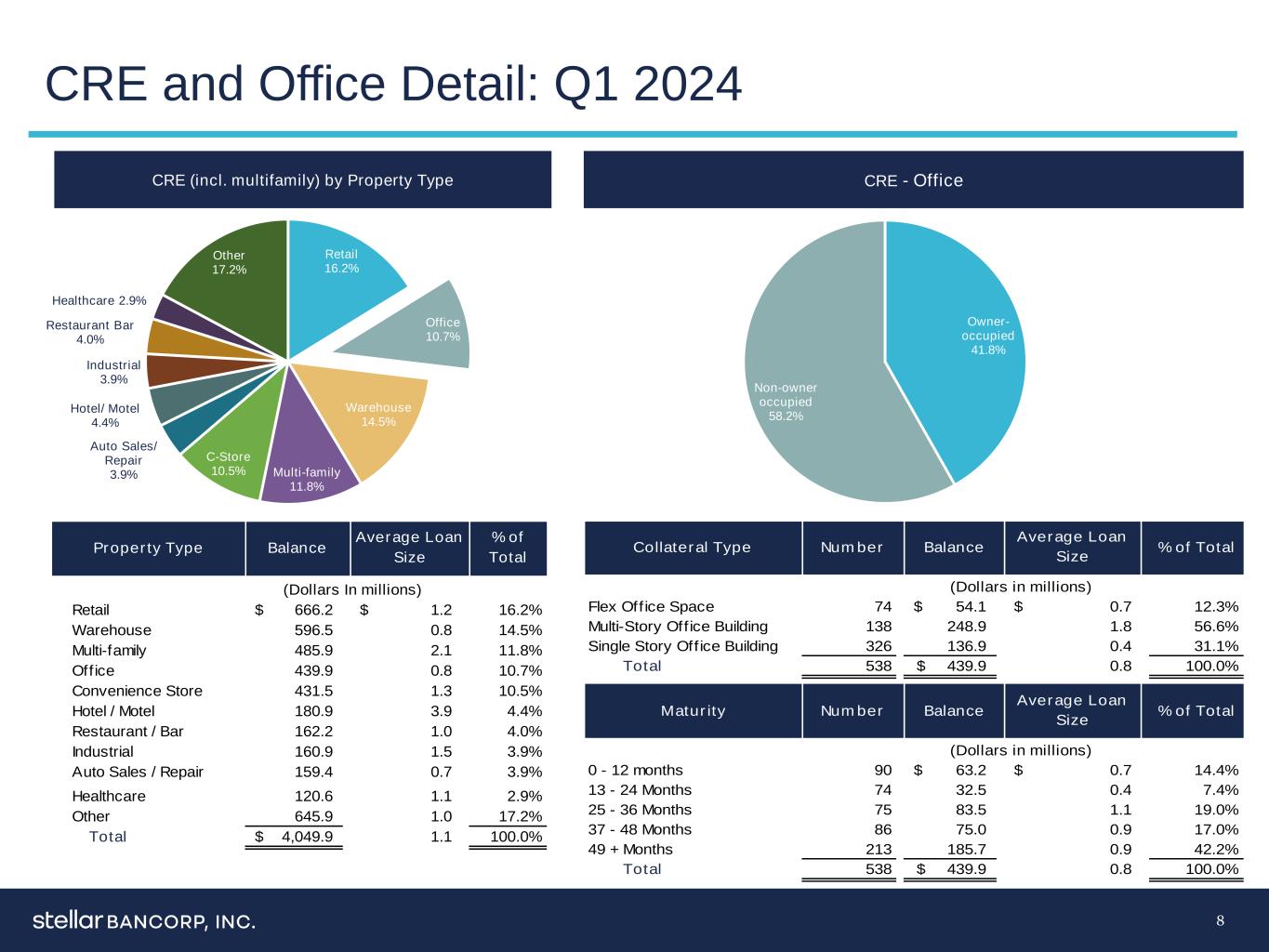 Loan Summary 7 (1) Refer to the calculation of these non-GAAP financial measures and a reconciliation to their most directly comparable GAAP financial measures in the appendix. . Loan Portfolio Composition (1) (1) Q1 2024 Q4 2023 Commercial and Industrial (“C&I”) 1,455,755$ 1,414,102$ Nonowner-occupied Commercial Real Estate (“NOO CRE”) 1,711,089 1,728,566 Owner-occupied CRE (“OO CRE”) 1,886,641 1,880,075 Multifamily Real Estate (“MF”) 452,155 463,166 Total Commercial Real Estate 4,049,885 4,071,807 CRE Construction & Development (“CRE C&D”) 1,039,443 1,060,406 1-4 Family Residential (“1-4 Family”) 1,049,316 1,047,174 Residential Construction (“Resi. C&D”) 252,573 267,357 Consumer and other ("Other") 61,139 64,287 Total 7,908,111$ 7,925,133$ (In thousands) Average Yield Excl. PAA(1) Average Yield Excl. PAA(1) Interest-Earning Assets: Loans 7,938,824$ 134,685$ 6.82% 6.39% 7,973,780$ 139,114$ 6.92% 6.34% Securities 1,441,814 10,111 2.82% 1,386,079 10,040 2.87% Deposits in other financial institutions 264,906 3,627 5.51% 217,068 3,021 5.52% Total interest-earning assets 9,645,544$ 148,423$ 6.19% 5.83% 9,576,927$ 152,175$ 6.30% 5.82% (Dollars in thousands) Q1 2024 Q4 2023 Average Outstanding Balance Interest Earned Average Outstanding Balance Interest Earned 1-4 Family 13.3% MF 5.7% Resi. C&D 3.2% CRE C&D 13.1% NOO CRE 21.6% OO CRE 23.9% C&I 18.4% Other 0.8%