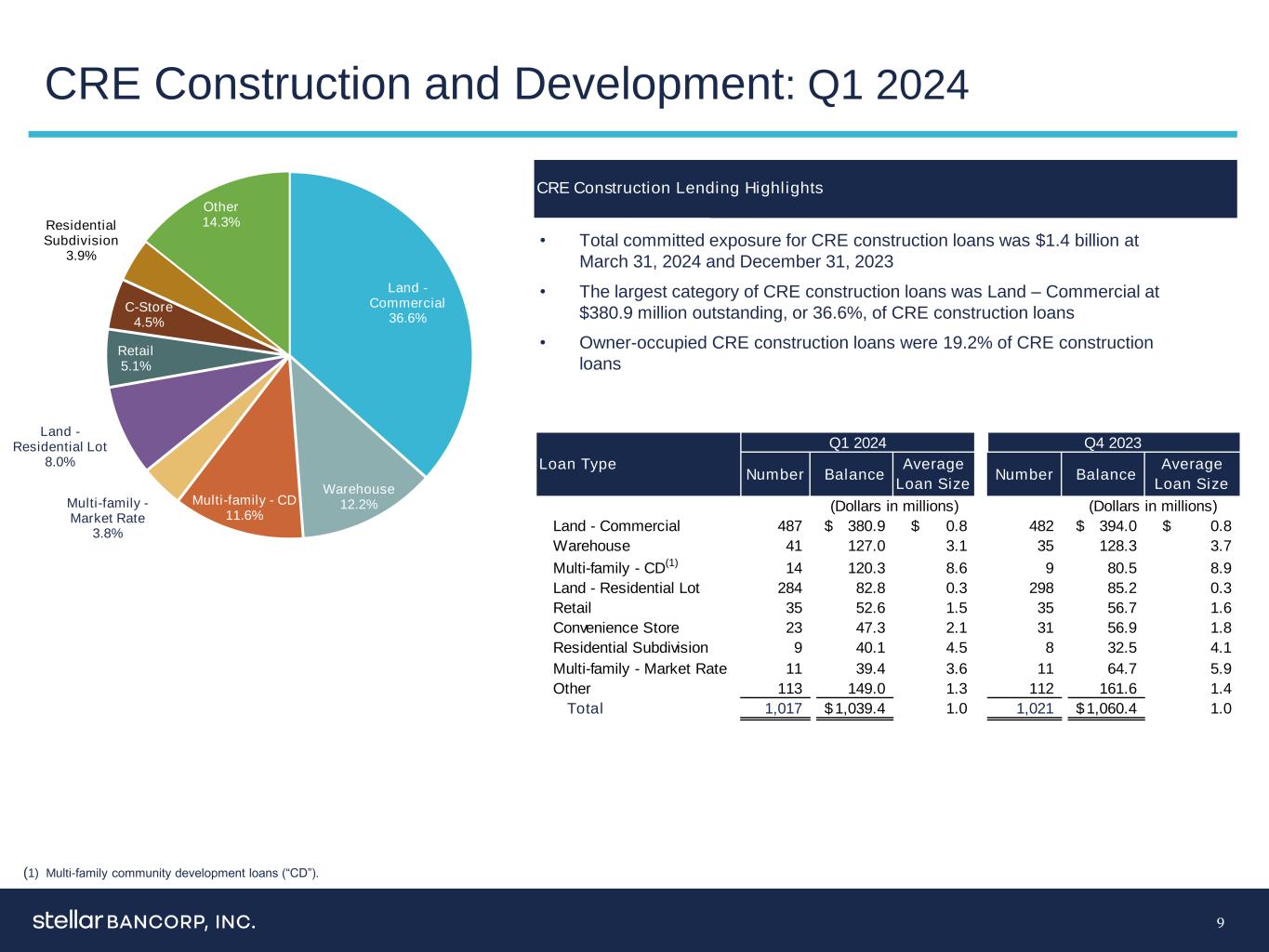 CRE and Office Detail: Q1 2024 8 (1) (1) CRE (incl. multifamily) by Property Type CRE - Office Owner- occupied 41.8% Non-owner occupied 58.2% Retail 16.2% Office 10.7% Warehouse 14.5% Multi-family 11.8% C-Store 10.5% Auto Sales/ Repair 3.9% Hotel/ Motel 4.4% Industrial 3.9% Restaurant Bar 4.0% Healthcare 2.9% Other 17.2% Retail 666.2$ 1.2$ 16.2% Warehouse 596.5 0.8 14.5% Multi-family 485.9 2.1 11.8% Office 439.9 0.8 10.7% Convenience Store 431.5 1.3 10.5% Hotel / Motel 180.9 3.9 4.4% Restaurant / Bar 162.2 1.0 4.0% Industrial 160.9 1.5 3.9% Auto Sales / Repair 159.4 0.7 3.9% Healthcare 120.6 1.1 2.9% Other 645.9 1.0 17.2% Total 4,049.9$ 1.1 100.0% Property Type Balance % of Total Average Loan Size (Dollars In millions) Flex Office Space 74 54.1$ 0.7$ 12.3% Multi-Story Office Building 138 248.9 1.8 56.6% Single Story Office Building 326 136.9 0.4 31.1% Total 538 439.9$ 0.8 100.0% 0 - 12 months 90 63.2$ 0.7$ 14.4% 13 - 24 Months 74 32.5 0.4 7.4% 25 - 36 Months 75 83.5 1.1 19.0% 37 - 48 Months 86 75.0 0.9 17.0% 49 + Months 213 185.7 0.9 42.2% Total 538 439.9$ 0.8 100.0% % of Total Average Loan Size Collateral Type Number Balance (Dollars in millions) (Dollars in millions) Maturity Average Loan Size % of TotalNumber Balance
