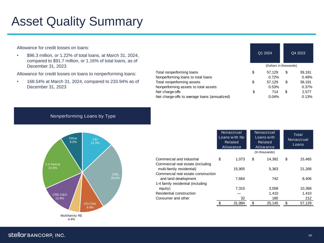 CRE Construction and Development: Q1 2024 9 (1) (1) • Total committed exposure for CRE construction loans was $1.4 billion at March 31, 2024 and December 31, 2023 • The largest category of CRE construction loans was Land – Commercial at $380.9 million outstanding, or 36.6%, of CRE construction loans • Owner-occupied CRE construction loans were 19.2% of CRE construction loans (1) Multi-family community development loans (“CD”). CRE Construction Lending Highlights Number Balance Number Balance Land - Commercial 487 380.9$ 0.8$ 482 394.0$ 0.8$ Warehouse 41 127.0 3.1 35 128.3 3.7 Multi-family - CD(1) 14 120.3 8.6 9 80.5 8.9 Land - Residential Lot 284 82.8 0.3 298 85.2 0.3 Retail 35 52.6 1.5 35 56.7 1.6 Convenience Store 23 47.3 2.1 31 56.9 1.8 Residential Subdivision 9 40.1 4.5 8 32.5 4.1 Multi-family - Market Rate 11 39.4 3.6 11 64.7 5.9 Other 113 149.0 1.3 112 161.6 1.4 Total 1,017 1,039.4$ 1.0 1,021 1,060.4$ 1.0 Average Loan Size Average Loan Size (Dollars in millions) (Dollars in millions) Q1 2024 Loan Type Q4 2023 Land - Commercial 36.6% Warehouse 12.2%Multi-family - CD 11.6% Multi-family - Market Rate 3.8% Land - Residential Lot 8.0% Retail 5.1% C-Store 4.5% Residential Subdivision 3.9% Other 14.3%