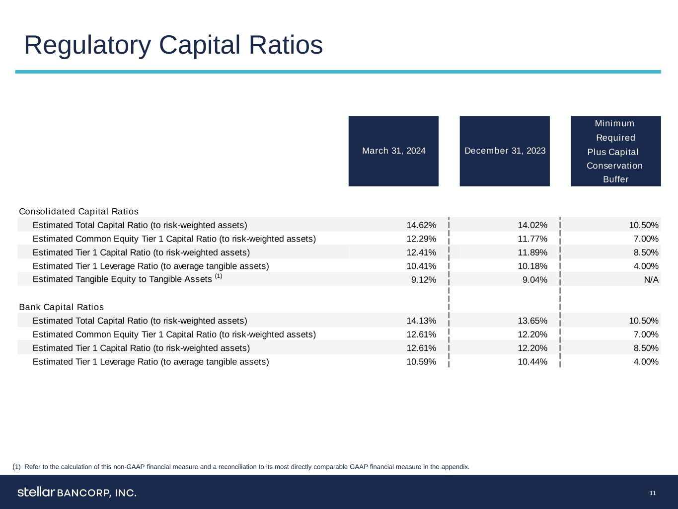 Asset Quality Summary 10 Nonperforming Loans by Type (1) Combined represents the simple addition of legacy balances for 2022; estimated. Allowance for credit losses on loans: • $96.3 million, or 1.22% of total loans, at March 31, 2024, compared to $91.7 million, or 1.16% of total loans, as of December 31, 2023 Allowance for credit losses on loans to nonperforming loans: • 168.54% at March 31, 2024, compared to 233.94% as of December 31, 2023 C&I 12.9% CRE 28.3% OO CRE 9.9% Multifamily RE 4.4% CRE C&D 12.9% 1-4 Family 22.6% Other 9.0% Q1 2024 Q4 2023 Total nonperforming loans 57,129$ 39,191$ Nonperforming loans to total loans 0.72% 0.49% Total nonperforming assets 57,129$ 39,191$ 0.53% 0.37% Net charge-offs 714$ 2,577$ 0.04% 0.13% (Dollars in thousands) Nonperforming assets to total assets Net charge-offs to average loans (annualized) Nonaccrual Loans with No Related Allowance Nonaccrual Loans with Related Allowance Total Nonaccrual Loans Commercial and industrial 1,073$ 14,392$ 15,465$ Commercial real estate (including multi-family residential) 15,905 5,363 21,268 Commercial real estate construction and land development 7,664 742 8,406 1-4 family residential (including equity) 7,310 3,058 10,368 Residential construction — 1,410 1,410 Consumer and other 32 180 212 31,984$ 25,145$ 57,129$ (In thousands)