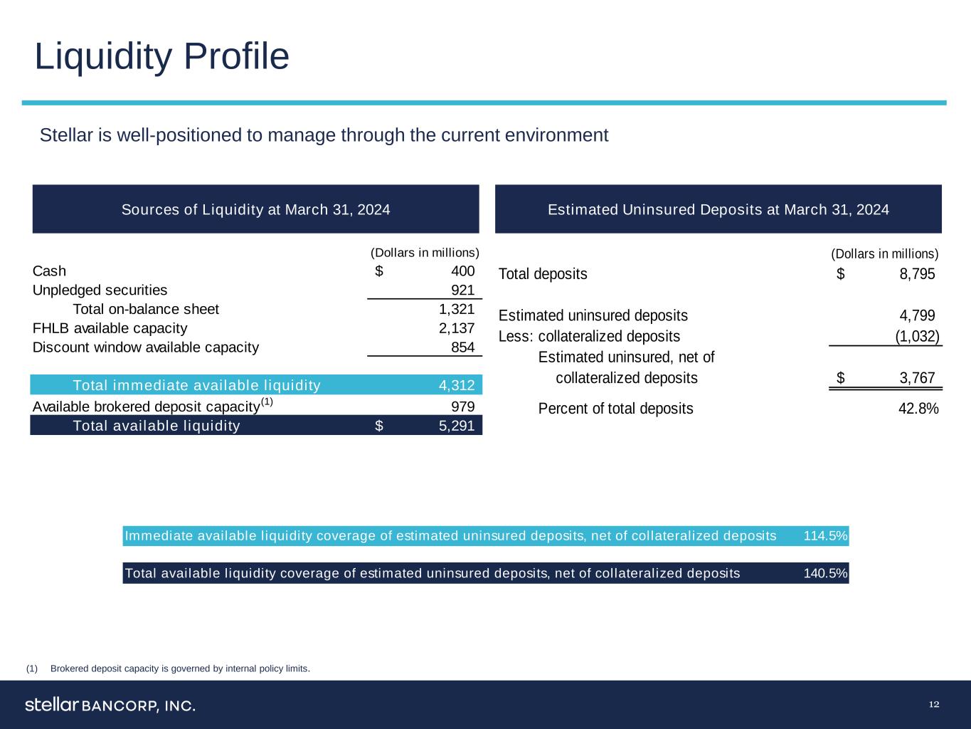 12 Liquidity Profile Stellar is well-positioned to manage through the current environment Sources of Liquidity at March 31, 2024 Sources of Liquidity Estimated Uninsured Deposits at March 31, 2024 (1) Brokered deposit capacity is governed by internal policy limits. (Dollars in millions) Cash 400$ Unpledged securities 921 Total on-balance sheet 1,321 FHLB available capacity 2,137 Discount window available capacity 854 Total immediate available liquidity 4,312 Available brokered deposit capacity(1) 979 Total available liquidity 5,291$ (Dollars in millions) Total deposits 8,795$ Estimated uninsured deposits 4,799 Less: collateralized deposits (1,032) Estimated uninsured, net of collateralized deposits 3,767$ Percent of total deposits 42.8% 114.5% 140.5% Immediate available liquidity coverage of estimated uninsured deposits, net of collateralized deposits Total available liquidity coverage of estimated uninsured deposits, net of collateralized deposits