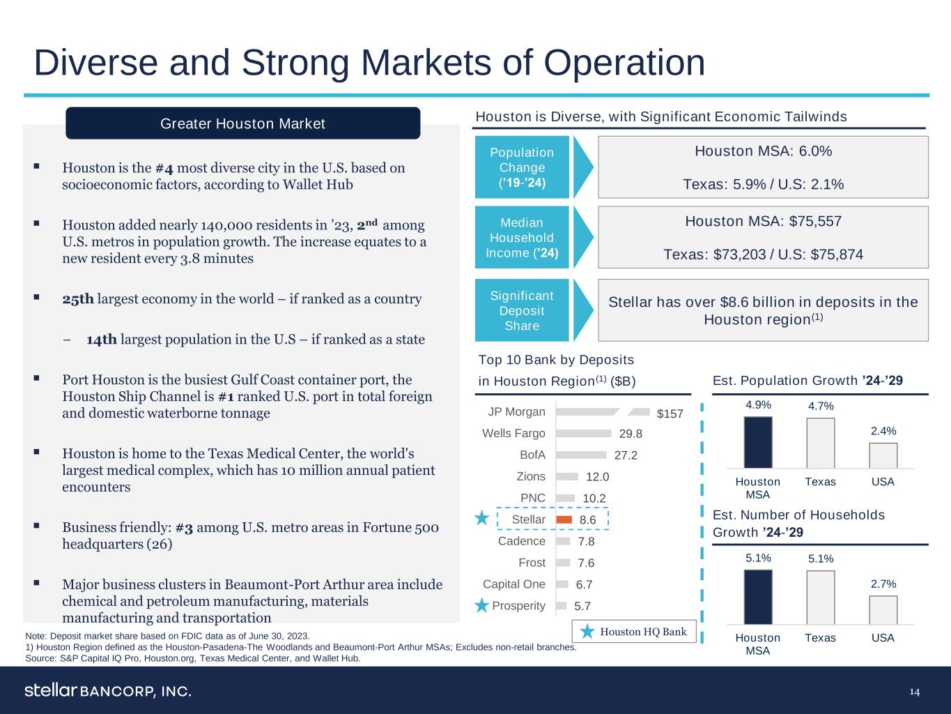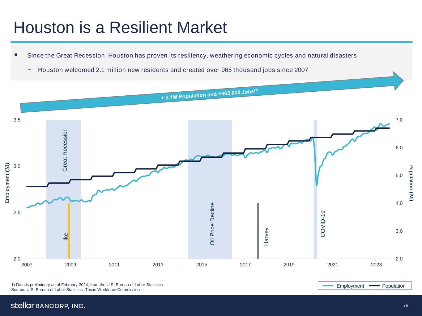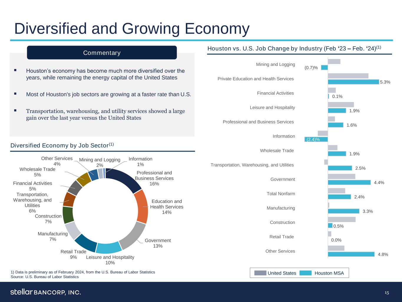 29.8 27.2 12.0 10.2 8.6 7.8 7.6 6.7 5.7 JP Morgan Wells Fargo BofA Zions PNC Stellar Cadence Frost Capital One Prosperity Diverse and Strong Markets of Operation 14 Houston is Diverse, with Significant Economic Tailwinds Greater Houston Market Top 10 Bank by Deposits in Houston Region(1) ($B) Note: Deposit market share based on FDIC data as of June 30, 2023. 1) Houston Region defined as the Houston-Pasadena-The Woodlands and Beaumont-Port Arthur MSAs; Excludes non-retail branches. Source: S&P Capital IQ Pro, Houston.org, Texas Medical Center, and Wallet Hub. $157 Est. Population Growth ’24-’29 Est. Number of Households Growth ’24-’29 Population Change (’19-’24) Median Household Income (’24) Significant Deposit Share Houston MSA: 6.0% Texas: 5.9% / U.S: 2.1% Houston MSA: $75,557 Texas: $73,203 / U.S: $75,874 Stellar has over $8.6 billion in deposits in the Houston region(1) Houston HQ Bank  Houston is the #4 most diverse city in the U.S. based on socioeconomic factors, according to Wallet Hub  Houston added nearly 140,000 residents in ’23, 2nd among U.S. metros in population growth. The increase equates to a new resident every 3.8 minutes  25th largest economy in the world – if ranked as a country − 14th largest population in the U.S – if ranked as a state  Port Houston is the busiest Gulf Coast container port, the Houston Ship Channel is #1 ranked U.S. port in total foreign and domestic waterborne tonnage  Houston is home to the Texas Medical Center, the world's largest medical complex, which has 10 million annual patient encounters  Business friendly: #3 among U.S. metro areas in Fortune 500 headquarters (26)  Major business clusters in Beaumont-Port Arthur area include chemical and petroleum manufacturing, materials manufacturing and transportation 4.9% 4.7% 2.4% Houston MSA Texas USA 5.1% 5.1% 2.7% Houston MSA Texas USA