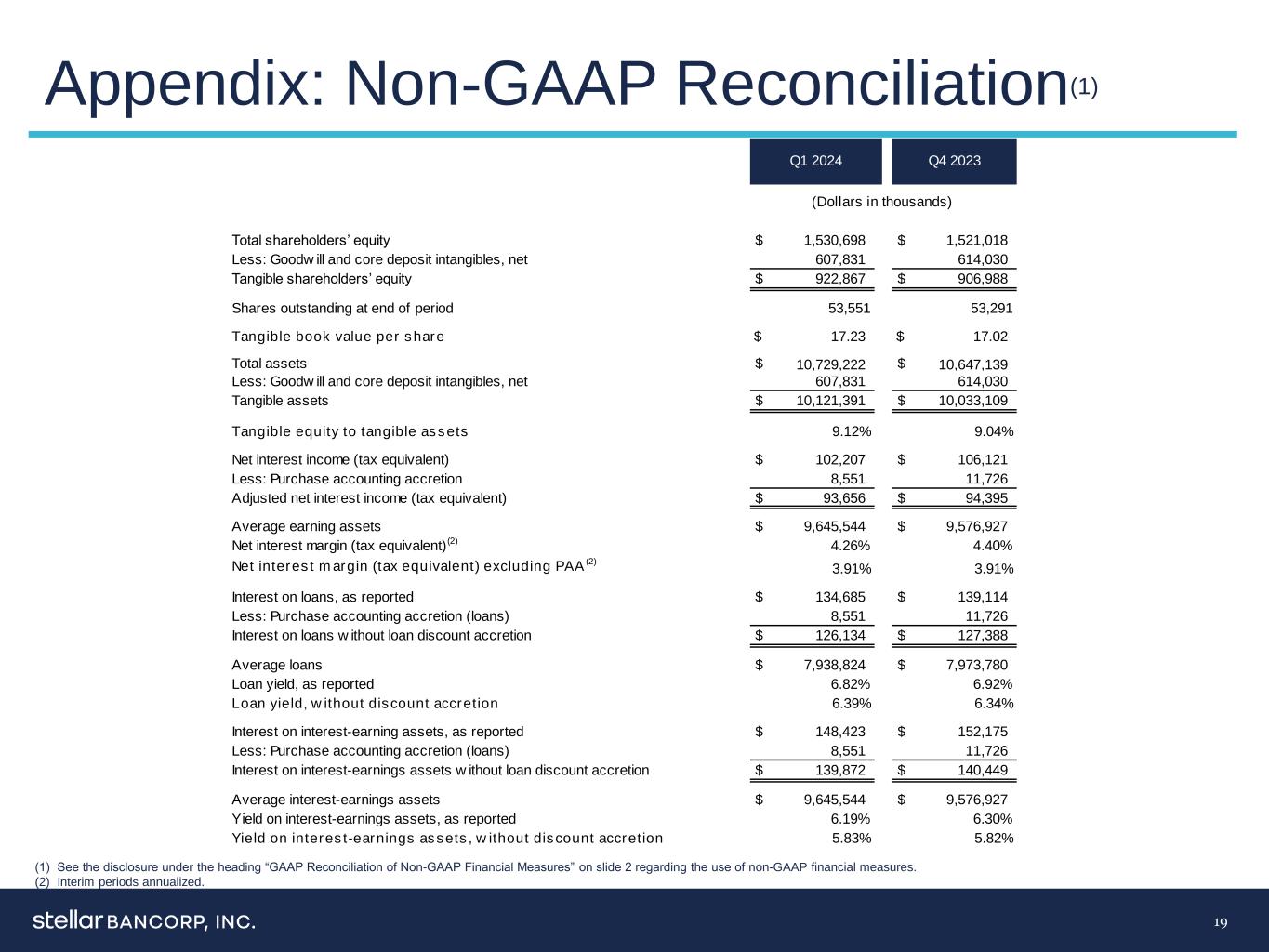 Appendix: Non-GAAP Reconciliation(1) 19 (1) See the disclosure under the heading “GAAP Reconciliation of Non-GAAP Financial Measures” on slide 2 regarding the use of non-GAAP financial measures. (2) Interim periods annualized. Total shareholders’ equity $ 1,530,698 $ 1,521,018 Less: Goodw ill and core deposit intangibles, net 607,831 614,030 Tangible shareholders’ equity $ 922,867 $ 906,988 Shares outstanding at end of period 53,551 53,291 Tangible book value per share $ 17.23 $ 17.02 Total assets $ 10,729,222 $ 10,647,139 Less: Goodw ill and core deposit intangibles, net 607,831 614,030 Tangible assets $ 10,121,391 $ 10,033,109 Tangible equity to tangible assets 9.12% 9.04% Net interest income (tax equivalent) $ 102,207 $ 106,121 Less: Purchase accounting accretion 8,551 11,726 Adjusted net interest income (tax equivalent) $ 93,656 $ 94,395 Average earning assets $ 9,645,544 $ 9,576,927 Net interest margin (tax equivalent)(2) 4.26% 4.40% Net interest margin (tax equivalent) excluding PAA (2) 3.91% 3.91% Interest on loans, as reported $ 134,685 $ 139,114 Less: Purchase accounting accretion (loans) 8,551 11,726 Interest on loans w ithout loan discount accretion $ 126,134 $ 127,388 Average loans $ 7,938,824 $ 7,973,780 Loan yield, as reported 6.82% 6.92% Loan yield, w ithout discount accretion 6.39% 6.34% Interest on interest-earning assets, as reported $ 148,423 $ 152,175 Less: Purchase accounting accretion (loans) 8,551 11,726 Interest on interest-earnings assets w ithout loan discount accretion $ 139,872 $ 140,449 Average interest-earnings assets $ 9,645,544 $ 9,576,927 Yield on interest-earnings assets, as reported 6.19% 6.30% Yield on interest-earnings assets, w ithout discount accretion 5.83% 5.82% (Dollars in thousands) Q1 2024 Q4 2023