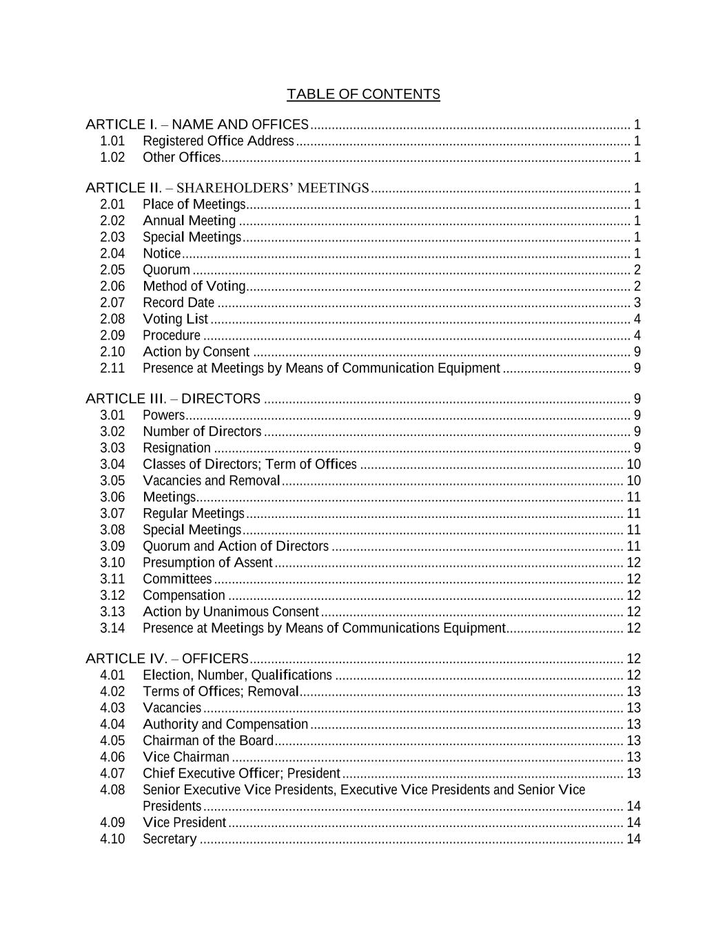 TABLE OF CONTENTS ARTICLE I. – NAME AND OFFICES .......................................................................................... 1 1.01 Registered Office Address .............................................................................................. 1 1.02 Other Offices ................................................................................................................... 1 ARTICLE II. – SHAREHOLDERS’ MEETINGS ......................................................................... 1 2.01 Place of Meetings ............................................................................................................ 1 2.02 Annual Meeting .............................................................................................................. 1 2.03 Special Meetings ............................................................................................................. 1 2.04 Notice .............................................................................................................................. 1 2.05 Quorum ........................................................................................................................... 2 2.06 Method of Voting ............................................................................................................ 2 2.07 Record Date .................................................................................................................... 3 2.08 Voting List ...................................................................................................................... 4 2.09 Procedure ........................................................................................................................ 4 2.10 Action by Consent .......................................................................................................... 9 2.11 Presence at Meetings by Means of Communication Equipment .................................... 9 ARTICLE III. – DIRECTORS ....................................................................................................... 9 3.01 Powers ............................................................................................................................. 9 3.02 Number of Directors ....................................................................................................... 9 3.03 Resignation ..................................................................................................................... 9 3.04 Classes of Directors; Term of Offices .......................................................................... 10 3.05 Vacancies and Removal ................................................................................................ 10 3.06 Meetings ........................................................................................................................ 11 3.07 Regular Meetings .......................................................................................................... 11 3.08 Special Meetings ........................................................................................................... 11 3.09 Quorum and Action of Directors .................................................................................. 11 3.10 Presumption of Assent .................................................................................................. 12 3.11 Committees ................................................................................................................... 12 3.12 Compensation ............................................................................................................... 12 3.13 Action by Unanimous Consent ..................................................................................... 12 3.14 Presence at Meetings by Means of Communications Equipment ................................. 12 ARTICLE IV. – OFFICERS ......................................................................................................... 12 4.01 Election, Number, Qualifications ................................................................................. 12 4.02 Terms of Offices; Removal ........................................................................................... 13 4.03 Vacancies ...................................................................................................................... 13 4.04 Authority and Compensation ........................................................................................ 13 4.05 Chairman of the Board .................................................................................................. 13 4.06 Vice Chairman .............................................................................................................. 13 4.07 Chief Executive Officer; President ............................................................................... 13 4.08 Senior Executive Vice Presidents, Executive Vice Presidents and Senior Vice Presidents ...................................................................................................................... 14 4.09 Vice President ............................................................................................................... 14 4.10 Secretary ....................................................................................................................... 14
