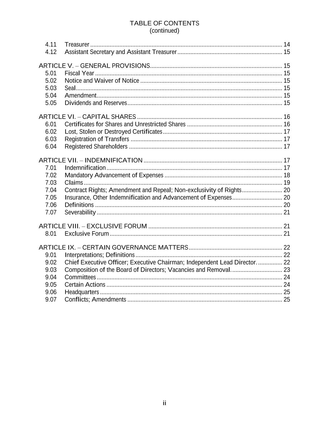TABLE OF CONTENTS (continued) ii 4.11 Treasurer ....................................................................................................................... 14 4.12 Assistant Secretary and Assistant Treasurer ................................................................. 15 ARTICLE V. – GENERAL PROVISIONS.................................................................................. 15 5.01 Fiscal Year .................................................................................................................... 15 5.02 Notice and Waiver of Notice ........................................................................................ 15 5.03 Seal ................................................................................................................................ 15 5.04 Amendment ................................................................................................................... 15 5.05 Dividends and Reserves ................................................................................................ 15 ARTICLE VI. – CAPITAL SHARES .......................................................................................... 16 6.01 Certificates for Shares and Unrestricted Shares ........................................................... 16 6.02 Lost, Stolen or Destroyed Certificates .......................................................................... 17 6.03 Registration of Transfers .............................................................................................. 17 6.04 Registered Shareholders ............................................................................................... 17 ARTICLE VII. – INDEMNIFICATION ...................................................................................... 17 7.01 Indemnification ............................................................................................................. 17 7.02 Mandatory Advancement of Expenses ......................................................................... 18 7.03 Claims ........................................................................................................................... 19 7.04 Contract Rights; Amendment and Repeal; Non-exclusivity of Rights ......................... 20 7.05 Insurance, Other Indemnification and Advancement of Expenses ............................... 20 7.06 Definitions .................................................................................................................... 20 7.07 Severability ................................................................................................................... 21 ARTICLE VIII. – EXCLUSIVE FORUM ................................................................................... 21 8.01 Exclusive Forum ........................................................................................................... 21 ARTICLE IX. – CERTAIN GOVERNANCE MATTERS .......................................................... 22 9.01 Interpretations; Definitions ........................................................................................... 22 9.02 Chief Executive Officer; Executive Chairman; Independent Lead Director. ............... 22 9.03 Composition of the Board of Directors; Vacancies and Removal. ............................... 23 9.04 Committees ................................................................................................................... 24 9.05 Certain Actions ............................................................................................................. 24 9.06 Headquarters ................................................................................................................. 25 9.07 Conflicts; Amendments ................................................................................................ 25