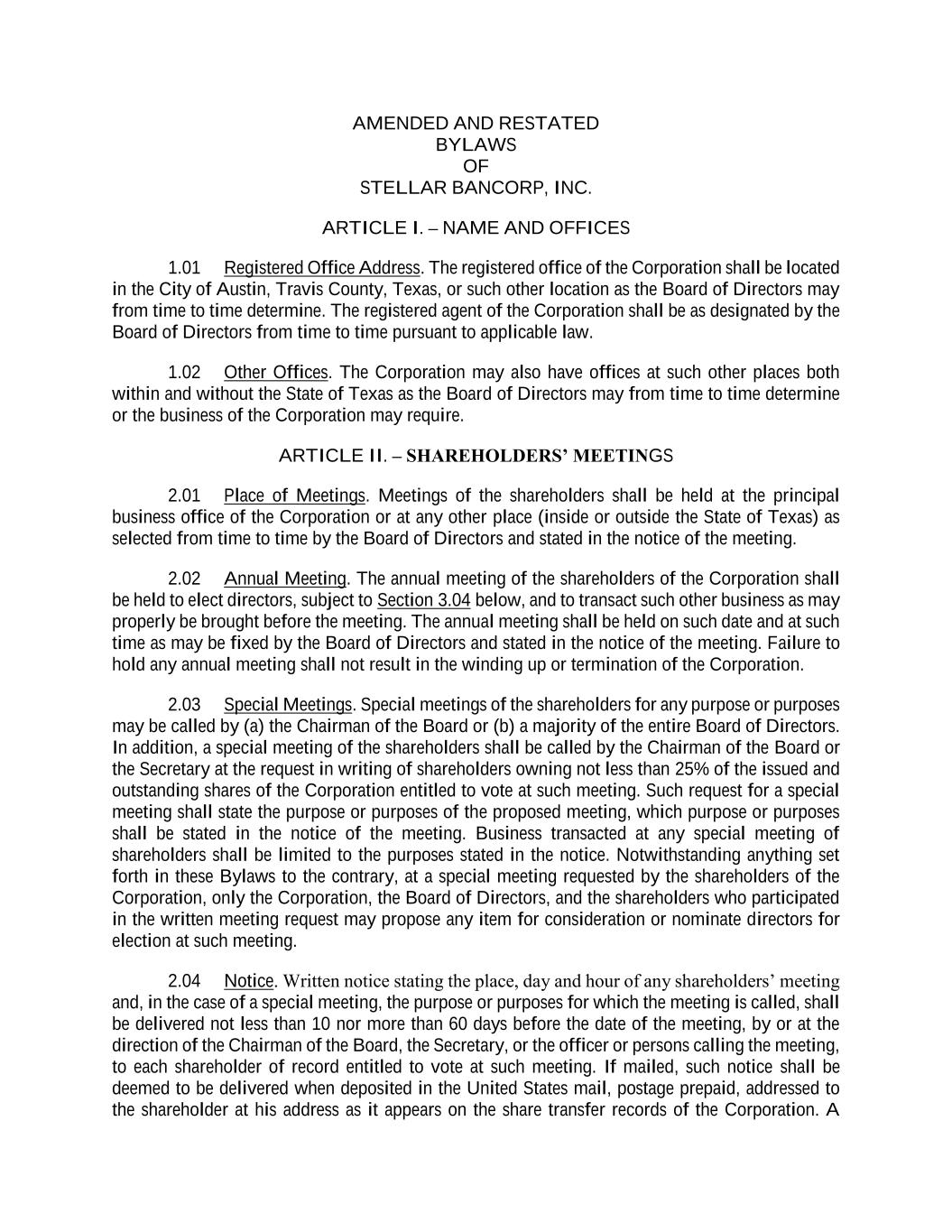 AMENDED AND RESTATED BYLAWS OF STELLAR BANCORP, INC. ARTICLE I. – NAME AND OFFICES 1.01 Registered Office Address. The registered office of the Corporation shall be located in the City of Austin, Travis County, Texas, or such other location as the Board of Directors may from time to time determine. The registered agent of the Corporation shall be as designated by the Board of Directors from time to time pursuant to applicable law. 1.02 Other Offices. The Corporation may also have offices at such other places both within and without the State of Texas as the Board of Directors may from time to time determine or the business of the Corporation may require. ARTICLE II. – SHAREHOLDERS’ MEETINGS 2.01 Place of Meetings. Meetings of the shareholders shall be held at the principal business office of the Corporation or at any other place (inside or outside the State of Texas) as selected from time to time by the Board of Directors and stated in the notice of the meeting. 2.02 Annual Meeting. The annual meeting of the shareholders of the Corporation shall be held to elect directors, subject to Section 3.04 below, and to transact such other business as may properly be brought before the meeting. The annual meeting shall be held on such date and at such time as may be fixed by the Board of Directors and stated in the notice of the meeting. Failure to hold any annual meeting shall not result in the winding up or termination of the Corporation. 2.03 Special Meetings. Special meetings of the shareholders for any purpose or purposes may be called by (a) the Chairman of the Board or (b) a majority of the entire Board of Directors. In addition, a special meeting of the shareholders shall be called by the Chairman of the Board or the Secretary at the request in writing of shareholders owning not less than 25% of the issued and outstanding shares of the Corporation entitled to vote at such meeting. Such request for a special meeting shall state the purpose or purposes of the proposed meeting, which purpose or purposes shall be stated in the notice of the meeting. Business transacted at any special meeting of shareholders shall be limited to the purposes stated in the notice. Notwithstanding anything set forth in these Bylaws to the contrary, at a special meeting requested by the shareholders of the Corporation, only the Corporation, the Board of Directors, and the shareholders who participated in the written meeting request may propose any item for consideration or nominate directors for election at such meeting. 2.04 Notice. Written notice stating the place, day and hour of any shareholders’ meeting and, in the case of a special meeting, the purpose or purposes for which the meeting is called, shall be delivered not less than 10 nor more than 60 days before the date of the meeting, by or at the direction of the Chairman of the Board, the Secretary, or the officer or persons calling the meeting, to each shareholder of record entitled to vote at such meeting. If mailed, such notice shall be deemed to be delivered when deposited in the United States mail, postage prepaid, addressed to the shareholder at his address as it appears on the share transfer records of the Corporation. A
