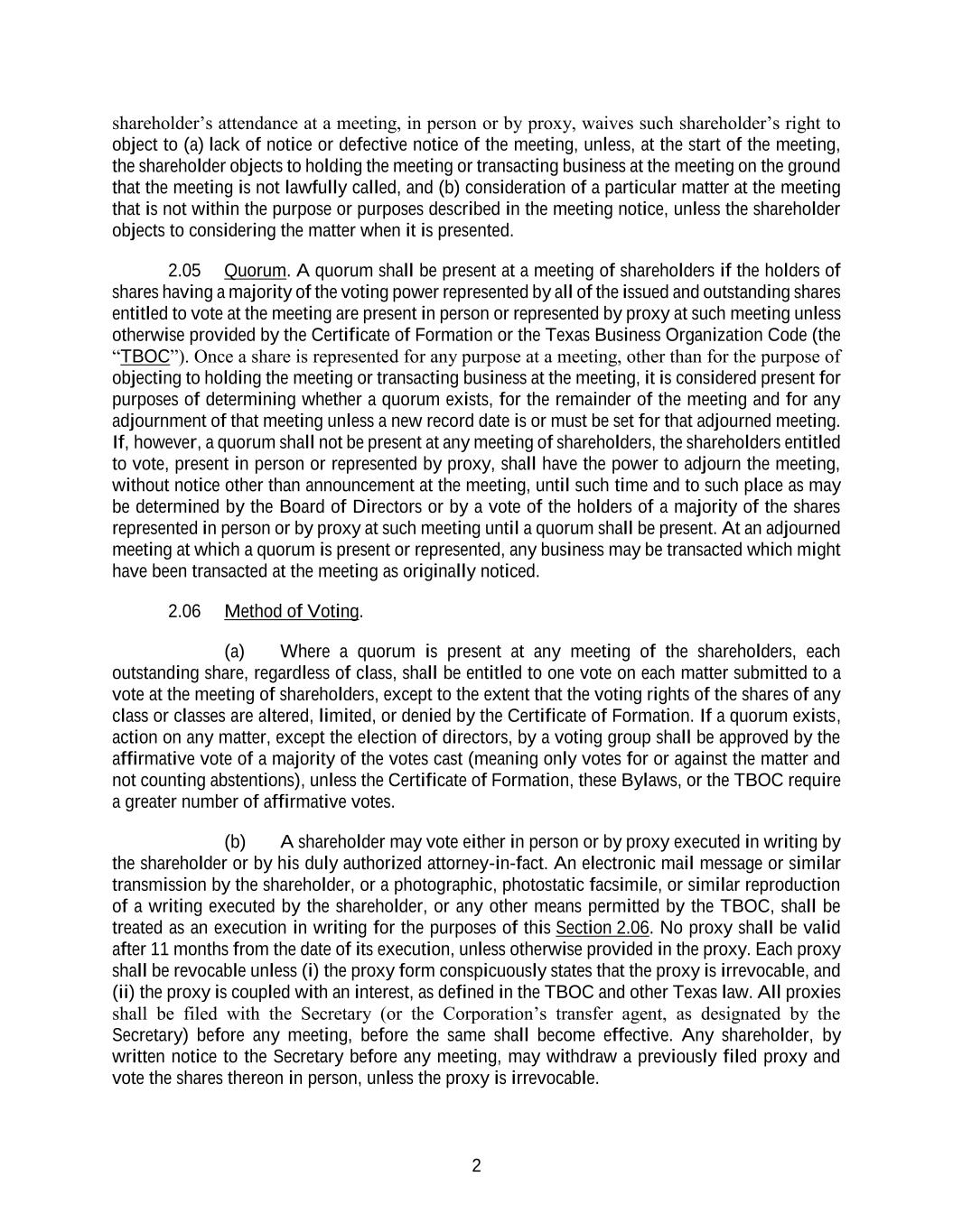 2 shareholder’s attendance at a meeting, in person or by proxy, waives such shareholder’s right to object to (a) lack of notice or defective notice of the meeting, unless, at the start of the meeting, the shareholder objects to holding the meeting or transacting business at the meeting on the ground that the meeting is not lawfully called, and (b) consideration of a particular matter at the meeting that is not within the purpose or purposes described in the meeting notice, unless the shareholder objects to considering the matter when it is presented. 2.05 Quorum. A quorum shall be present at a meeting of shareholders if the holders of shares having a majority of the voting power represented by all of the issued and outstanding shares entitled to vote at the meeting are present in person or represented by proxy at such meeting unless otherwise provided by the Certificate of Formation or the Texas Business Organization Code (the “TBOC”). Once a share is represented for any purpose at a meeting, other than for the purpose of objecting to holding the meeting or transacting business at the meeting, it is considered present for purposes of determining whether a quorum exists, for the remainder of the meeting and for any adjournment of that meeting unless a new record date is or must be set for that adjourned meeting. If, however, a quorum shall not be present at any meeting of shareholders, the shareholders entitled to vote, present in person or represented by proxy, shall have the power to adjourn the meeting, without notice other than announcement at the meeting, until such time and to such place as may be determined by the Board of Directors or by a vote of the holders of a majority of the shares represented in person or by proxy at such meeting until a quorum shall be present. At an adjourned meeting at which a quorum is present or represented, any business may be transacted which might have been transacted at the meeting as originally noticed. 2.06 Method of Voting. (a) Where a quorum is present at any meeting of the shareholders, each outstanding share, regardless of class, shall be entitled to one vote on each matter submitted to a vote at the meeting of shareholders, except to the extent that the voting rights of the shares of any class or classes are altered, limited, or denied by the Certificate of Formation. If a quorum exists, action on any matter, except the election of directors, by a voting group shall be approved by the affirmative vote of a majority of the votes cast (meaning only votes for or against the matter and not counting abstentions), unless the Certificate of Formation, these Bylaws, or the TBOC require a greater number of affirmative votes. (b) A shareholder may vote either in person or by proxy executed in writing by the shareholder or by his duly authorized attorney-in-fact. An electronic mail message or similar transmission by the shareholder, or a photographic, photostatic facsimile, or similar reproduction of a writing executed by the shareholder, or any other means permitted by the TBOC, shall be treated as an execution in writing for the purposes of this Section 2.06. No proxy shall be valid after 11 months from the date of its execution, unless otherwise provided in the proxy. Each proxy shall be revocable unless (i) the proxy form conspicuously states that the proxy is irrevocable, and (ii) the proxy is coupled with an interest, as defined in the TBOC and other Texas law. All proxies shall be filed with the Secretary (or the Corporation’s transfer agent, as designated by the Secretary) before any meeting, before the same shall become effective. Any shareholder, by written notice to the Secretary before any meeting, may withdraw a previously filed proxy and vote the shares thereon in person, unless the proxy is irrevocable.