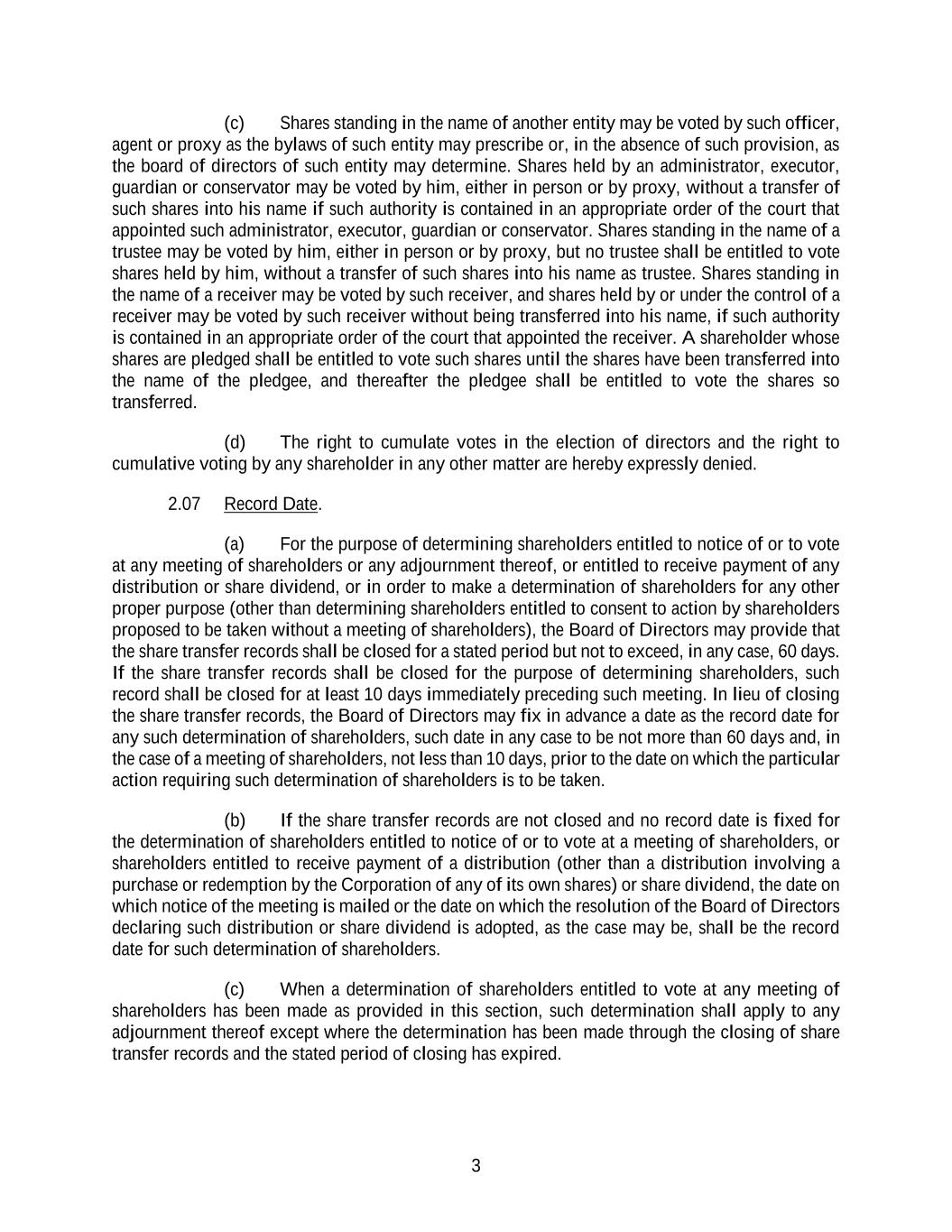 3 (c) Shares standing in the name of another entity may be voted by such officer, agent or proxy as the bylaws of such entity may prescribe or, in the absence of such provision, as the board of directors of such entity may determine. Shares held by an administrator, executor, guardian or conservator may be voted by him, either in person or by proxy, without a transfer of such shares into his name if such authority is contained in an appropriate order of the court that appointed such administrator, executor, guardian or conservator. Shares standing in the name of a trustee may be voted by him, either in person or by proxy, but no trustee shall be entitled to vote shares held by him, without a transfer of such shares into his name as trustee. Shares standing in the name of a receiver may be voted by such receiver, and shares held by or under the control of a receiver may be voted by such receiver without being transferred into his name, if such authority is contained in an appropriate order of the court that appointed the receiver. A shareholder whose shares are pledged shall be entitled to vote such shares until the shares have been transferred into the name of the pledgee, and thereafter the pledgee shall be entitled to vote the shares so transferred. (d) The right to cumulate votes in the election of directors and the right to cumulative voting by any shareholder in any other matter are hereby expressly denied. 2.07 Record Date. (a) For the purpose of determining shareholders entitled to notice of or to vote at any meeting of shareholders or any adjournment thereof, or entitled to receive payment of any distribution or share dividend, or in order to make a determination of shareholders for any other proper purpose (other than determining shareholders entitled to consent to action by shareholders proposed to be taken without a meeting of shareholders), the Board of Directors may provide that the share transfer records shall be closed for a stated period but not to exceed, in any case, 60 days. If the share transfer records shall be closed for the purpose of determining shareholders, such record shall be closed for at least 10 days immediately preceding such meeting. In lieu of closing the share transfer records, the Board of Directors may fix in advance a date as the record date for any such determination of shareholders, such date in any case to be not more than 60 days and, in the case of a meeting of shareholders, not less than 10 days, prior to the date on which the particular action requiring such determination of shareholders is to be taken. (b) If the share transfer records are not closed and no record date is fixed for the determination of shareholders entitled to notice of or to vote at a meeting of shareholders, or shareholders entitled to receive payment of a distribution (other than a distribution involving a purchase or redemption by the Corporation of any of its own shares) or share dividend, the date on which notice of the meeting is mailed or the date on which the resolution of the Board of Directors declaring such distribution or share dividend is adopted, as the case may be, shall be the record date for such determination of shareholders. (c) When a determination of shareholders entitled to vote at any meeting of shareholders has been made as provided in this section, such determination shall apply to any adjournment thereof except where the determination has been made through the closing of share transfer records and the stated period of closing has expired.