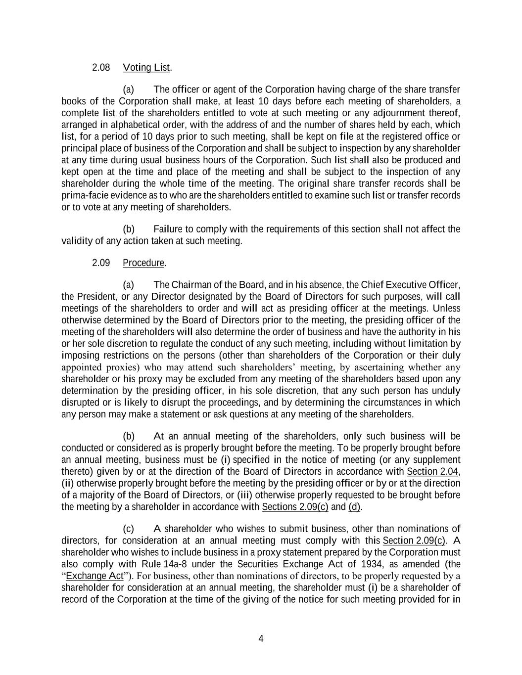 4 2.08 Voting List. (a) The officer or agent of the Corporation having charge of the share transfer books of the Corporation shall make, at least 10 days before each meeting of shareholders, a complete list of the shareholders entitled to vote at such meeting or any adjournment thereof, arranged in alphabetical order, with the address of and the number of shares held by each, which list, for a period of 10 days prior to such meeting, shall be kept on file at the registered office or principal place of business of the Corporation and shall be subject to inspection by any shareholder at any time during usual business hours of the Corporation. Such list shall also be produced and kept open at the time and place of the meeting and shall be subject to the inspection of any shareholder during the whole time of the meeting. The original share transfer records shall be prima-facie evidence as to who are the shareholders entitled to examine such list or transfer records or to vote at any meeting of shareholders. (b) Failure to comply with the requirements of this section shall not affect the validity of any action taken at such meeting. 2.09 Procedure. (a) The Chairman of the Board, and in his absence, the Chief Executive Officer, the President, or any Director designated by the Board of Directors for such purposes, will call meetings of the shareholders to order and will act as presiding officer at the meetings. Unless otherwise determined by the Board of Directors prior to the meeting, the presiding officer of the meeting of the shareholders will also determine the order of business and have the authority in his or her sole discretion to regulate the conduct of any such meeting, including without limitation by imposing restrictions on the persons (other than shareholders of the Corporation or their duly appointed proxies) who may attend such shareholders’ meeting, by ascertaining whether any shareholder or his proxy may be excluded from any meeting of the shareholders based upon any determination by the presiding officer, in his sole discretion, that any such person has unduly disrupted or is likely to disrupt the proceedings, and by determining the circumstances in which any person may make a statement or ask questions at any meeting of the shareholders. (b) At an annual meeting of the shareholders, only such business will be conducted or considered as is properly brought before the meeting. To be properly brought before an annual meeting, business must be (i) specified in the notice of meeting (or any supplement thereto) given by or at the direction of the Board of Directors in accordance with Section 2.04, (ii) otherwise properly brought before the meeting by the presiding officer or by or at the direction of a majority of the Board of Directors, or (iii) otherwise properly requested to be brought before the meeting by a shareholder in accordance with Sections 2.09(c) and (d). (c) A shareholder who wishes to submit business, other than nominations of directors, for consideration at an annual meeting must comply with this Section 2.09(c). A shareholder who wishes to include business in a proxy statement prepared by the Corporation must also comply with Rule 14a-8 under the Securities Exchange Act of 1934, as amended (the “Exchange Act”). For business, other than nominations of directors, to be properly requested by a shareholder for consideration at an annual meeting, the shareholder must (i) be a shareholder of record of the Corporation at the time of the giving of the notice for such meeting provided for in