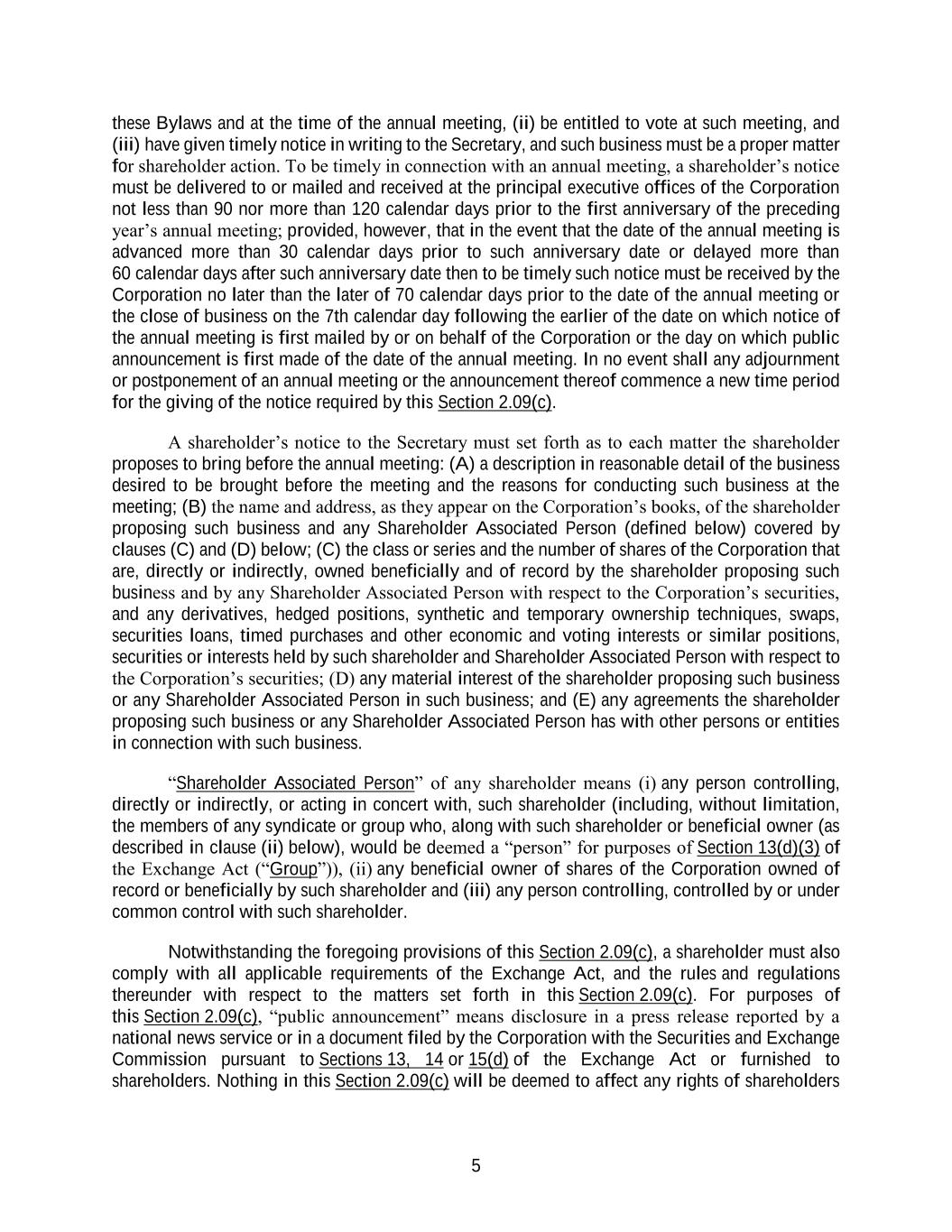 5 these Bylaws and at the time of the annual meeting, (ii) be entitled to vote at such meeting, and (iii) have given timely notice in writing to the Secretary, and such business must be a proper matter for shareholder action. To be timely in connection with an annual meeting, a shareholder’s notice must be delivered to or mailed and received at the principal executive offices of the Corporation not less than 90 nor more than 120 calendar days prior to the first anniversary of the preceding year’s annual meeting; provided, however, that in the event that the date of the annual meeting is advanced more than 30 calendar days prior to such anniversary date or delayed more than 60 calendar days after such anniversary date then to be timely such notice must be received by the Corporation no later than the later of 70 calendar days prior to the date of the annual meeting or the close of business on the 7th calendar day following the earlier of the date on which notice of the annual meeting is first mailed by or on behalf of the Corporation or the day on which public announcement is first made of the date of the annual meeting. In no event shall any adjournment or postponement of an annual meeting or the announcement thereof commence a new time period for the giving of the notice required by this Section 2.09(c). A shareholder’s notice to the Secretary must set forth as to each matter the shareholder proposes to bring before the annual meeting: (A) a description in reasonable detail of the business desired to be brought before the meeting and the reasons for conducting such business at the meeting; (B) the name and address, as they appear on the Corporation’s books, of the shareholder proposing such business and any Shareholder Associated Person (defined below) covered by clauses (C) and (D) below; (C) the class or series and the number of shares of the Corporation that are, directly or indirectly, owned beneficially and of record by the shareholder proposing such business and by any Shareholder Associated Person with respect to the Corporation’s securities, and any derivatives, hedged positions, synthetic and temporary ownership techniques, swaps, securities loans, timed purchases and other economic and voting interests or similar positions, securities or interests held by such shareholder and Shareholder Associated Person with respect to the Corporation’s securities; (D) any material interest of the shareholder proposing such business or any Shareholder Associated Person in such business; and (E) any agreements the shareholder proposing such business or any Shareholder Associated Person has with other persons or entities in connection with such business. “Shareholder Associated Person” of any shareholder means (i) any person controlling, directly or indirectly, or acting in concert with, such shareholder (including, without limitation, the members of any syndicate or group who, along with such shareholder or beneficial owner (as described in clause (ii) below), would be deemed a “person” for purposes of Section 13(d)(3) of the Exchange Act (“Group”)), (ii) any beneficial owner of shares of the Corporation owned of record or beneficially by such shareholder and (iii) any person controlling, controlled by or under common control with such shareholder. Notwithstanding the foregoing provisions of this Section 2.09(c), a shareholder must also comply with all applicable requirements of the Exchange Act, and the rules and regulations thereunder with respect to the matters set forth in this Section 2.09(c). For purposes of this Section 2.09(c), “public announcement” means disclosure in a press release reported by a national news service or in a document filed by the Corporation with the Securities and Exchange Commission pursuant to Sections 13, 14 or 15(d) of the Exchange Act or furnished to shareholders. Nothing in this Section 2.09(c) will be deemed to affect any rights of shareholders